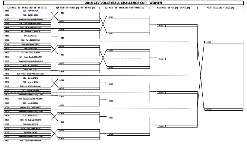 Lüksemburg’da çekilen kuralarda Bursa Büyükşehir Belediyespor Kulübü Bayan Voleybol takımının ilk 16 turundaki rakibi Lüksemburg temsilcisi RSR Walfer takımı oldu. 12-14 Aralık 2017 ve 9-11 Ocak 2018 tarihlerinde oynanacak maçların ardından Bursa Büyükşehir Belediyespor Kulübü turu geçmesi halinde ilk turdan gelecek Pölkky Kuusamo – Sharks Cherloi eşleşmesinin galibinin oynayacağı CVB Barça Barcelona eşleşmesinin tur atlayan takımı ile çeyrek final mücadelesi verecek.