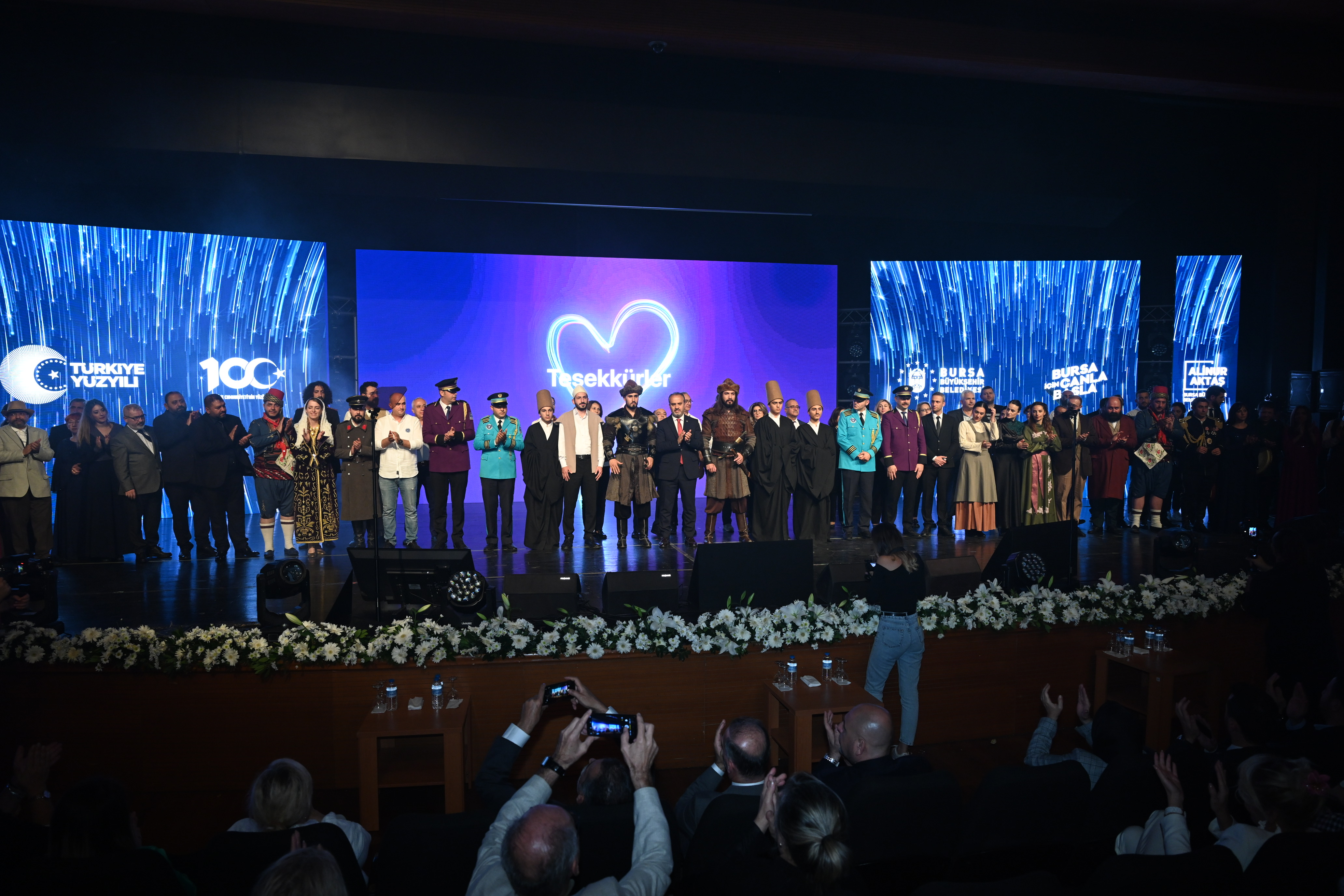 Başkan Aktaş, konuşmasının sonunda tüm bu kültür sanat faaliyetlerinden görev alan tiyatrocu, müzisyen ve kültür sanat ekibini sahneye davet edip, “Sizlerin huzurunda, bu vazifeyi birlikte gerçekleştirdiğimiz çalışma arkadaşlarıma, sanatçı dostlarıma ve emeğimizi her zaman takdirle ve teveccühle karşılayan siz değerli Bursalılara, sonsuz şükranlarımı sunuyorum” dedi.
