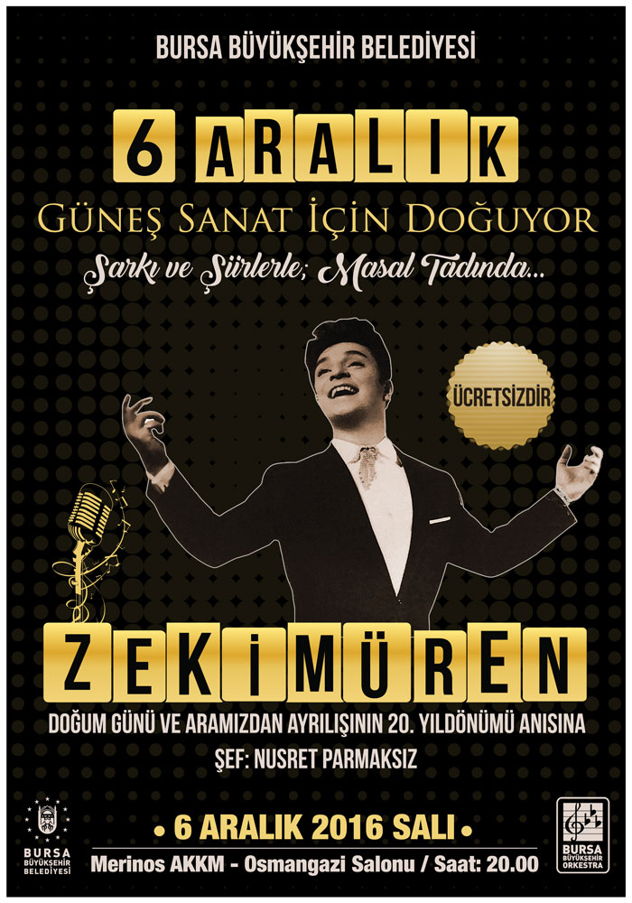 Bursa Büyükşehir Belediyesi Orkestra Şube Müdürlüğü Türk Sanat Müziği Bölümü ses ve saz sanatçıları yine dev bir projeye imza atıyor. ‘Sanat Güneşi’ merhum Zeki Müren’in doğum günü ve vefatının 20. yıldönümü anısına, Nusret Parmaksız şefliğinde Türk Sanat Müziği Bölümü ses ve saz sanatçıları muhteşem bir konser gerçekleştirecek. Şarkı ve şiirlerle renklenecek konserin sunumunu Büyükşehir Belediyesi Orkestra Şube Müdürü Dr. Turgay Mercan tarafından yapılacak olup, Zeki Müren’in yeğeni Özlem Olgaç Güner de geceye şiirleriyle renk katacak. Muhteşem konser, 6 Aralık Salı günü saat 20.00’da Atatürk Kongre Kültür Merkezi (Merinos AKKM) Osmangazi Salonu’nda ücretsiz olarak gerçekleştirilecek.