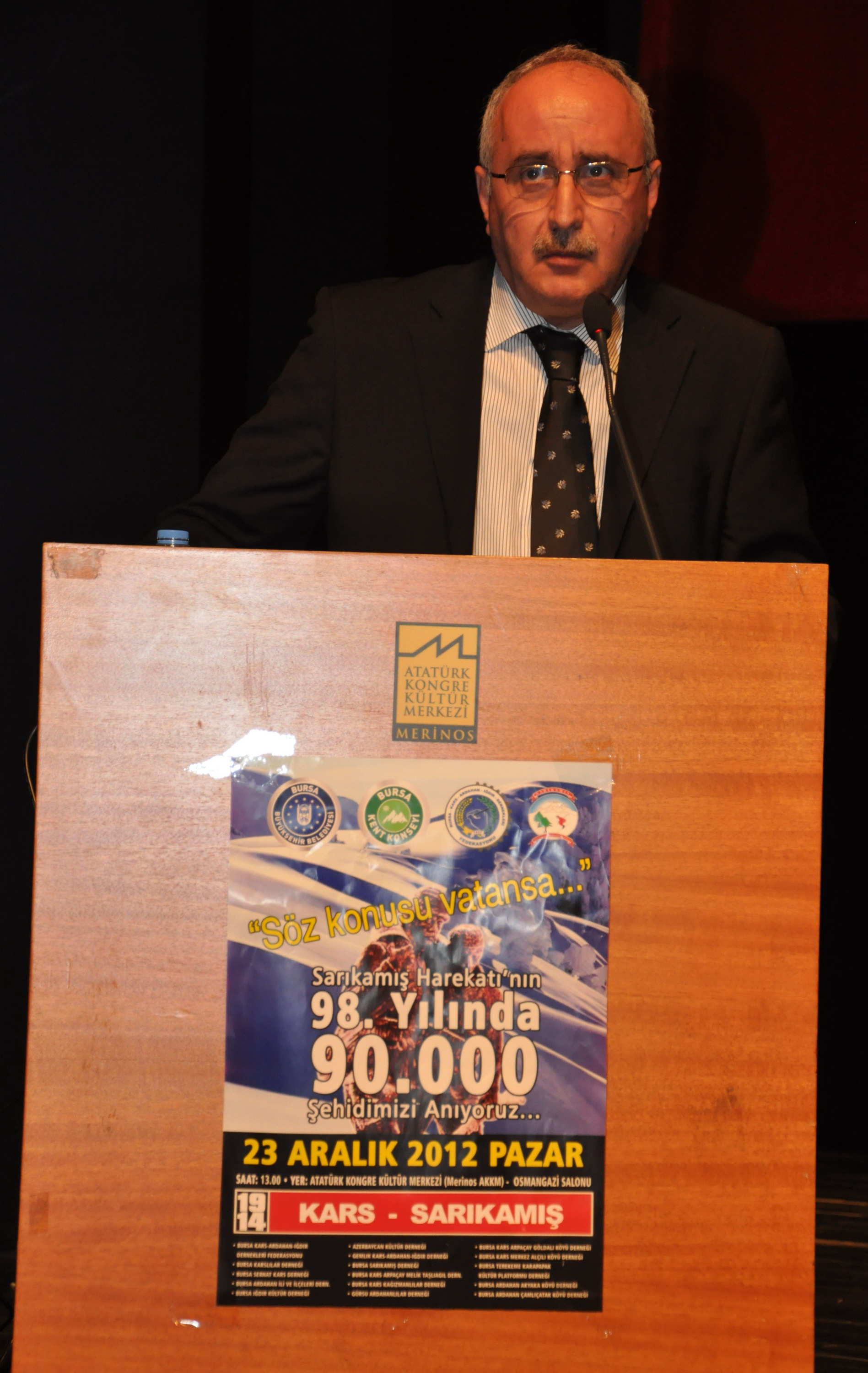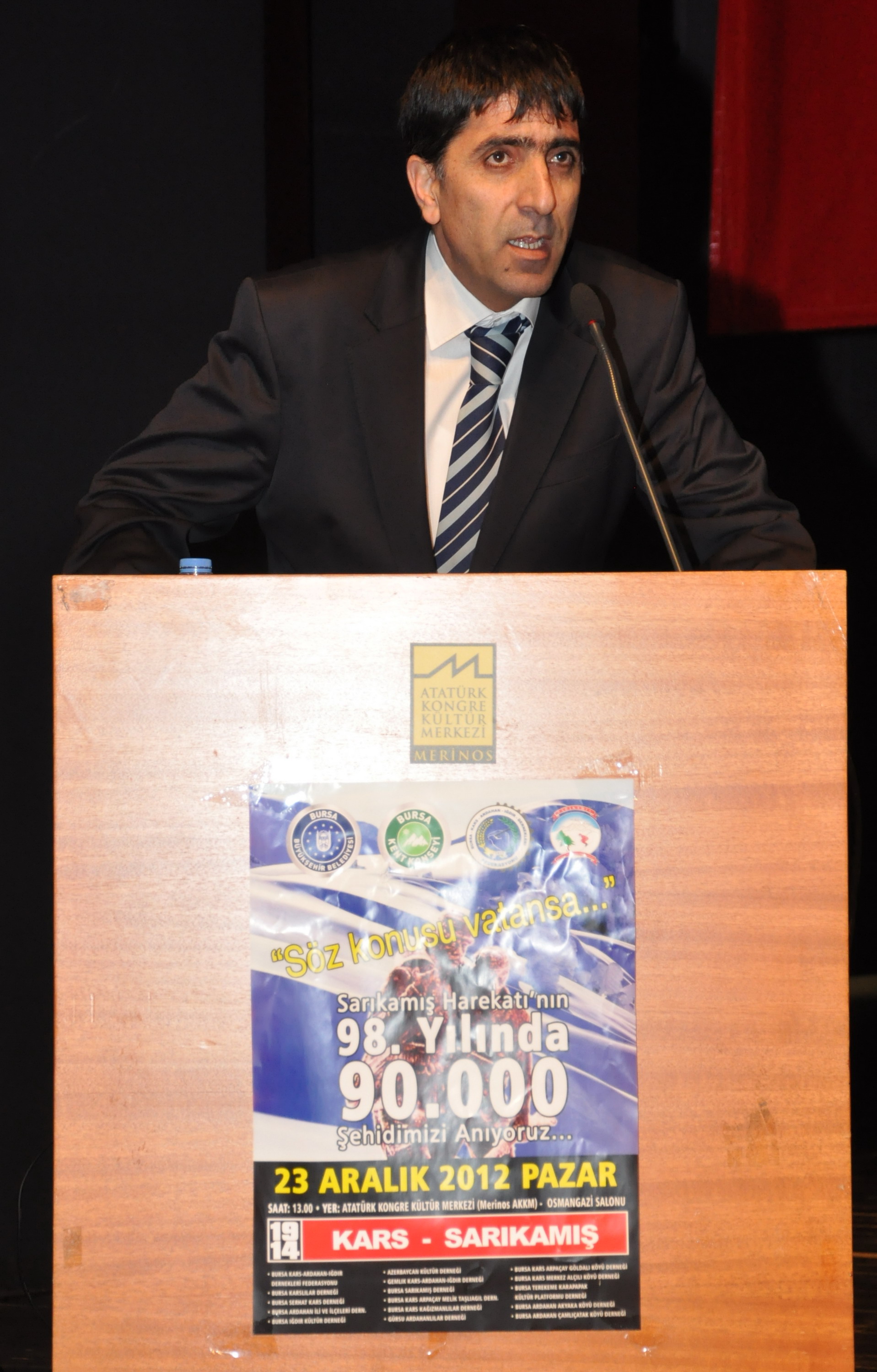 Bursa Kent Konseyi Başkanı Semih Pala, millet olmanın bazı zorlukları olduğunu, Türk milletinin de tarihinde birçok acı ve tatlı olayları barındırdığını dile getirdi. İnsanların geçmişten ders çıkarması ve ibret olması için bu tür toplantıları yaptıklarını kaydeden Pala, “Osmanlı Devleti’nin kurulduğu Bursa, her yöreden ve bölgeden insanları içerisinde barındıran bir şehirdir. Böylesi önemli bir şehirde, Sarıkamış şehitlerini de rahmetle anıyoruz. Bu ülke büyüyecektir. Bütün meselelerini aşacaktır. İçerideki ve dışarıdaki herkes bilsin ki Sarıkamış’ta yiğitçe canlarını veren onbinlerce şehitlerimiz gibi, bu ülkede bu bayrak ve bu vatan için canlarını seve seve verecek milyonlarca insan var. Bir kolu Balkanlarda ve Avrupa’da, bir kolu Kafkaslarda ve Asya’da, yüzü de manevi olarak Kabe’ye dönük Büyük Türkiye’de yaşadığımızı unutmamalıyız” dedi.
