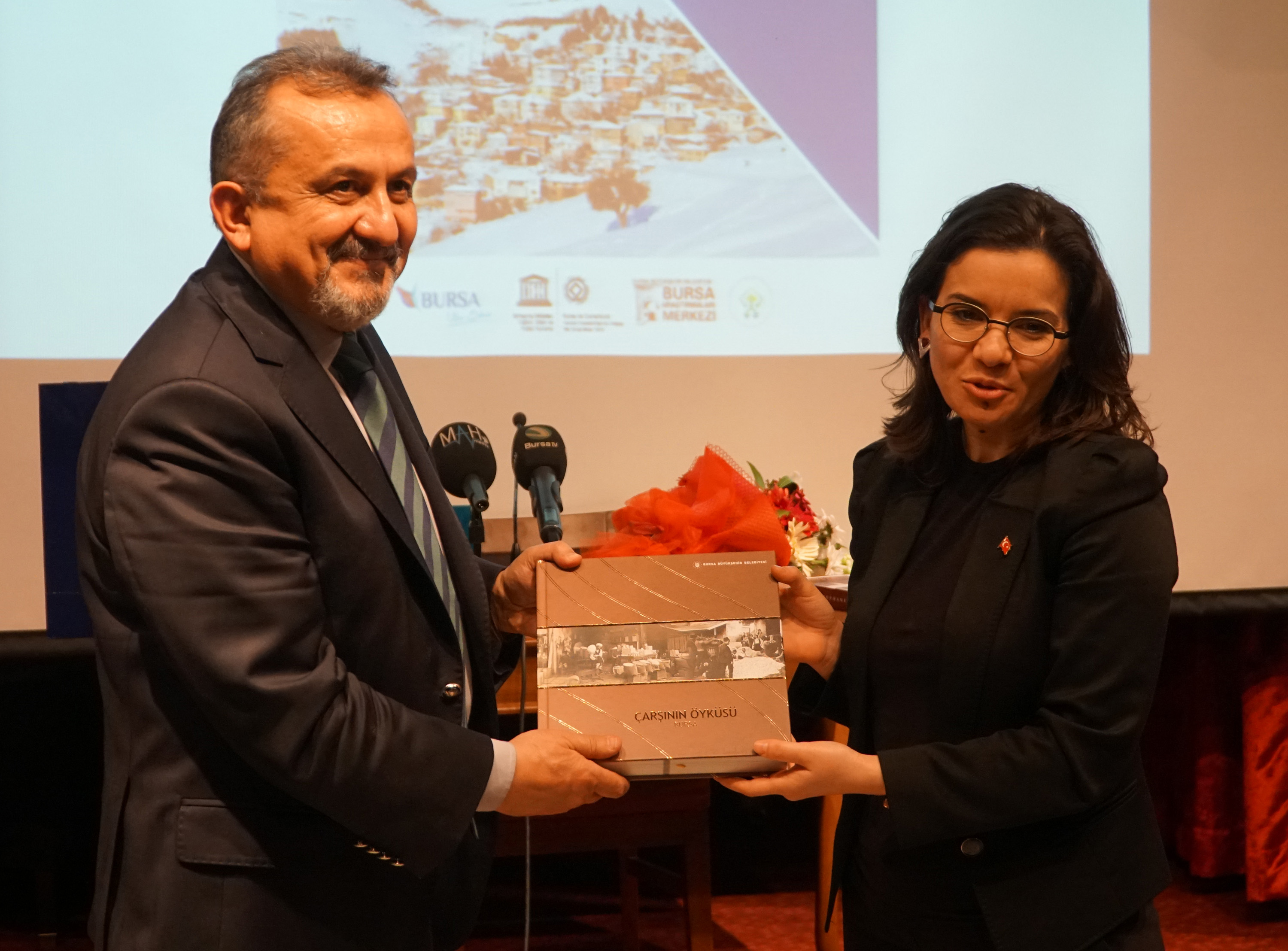 Yaklaşık iki saat süren seminerin sonunda Büyükşehir Belediyesi Kütüphaneler Şube Müdürü Ayşe Hacıoğlu, Doğan’a Bursa kitapları takdim ederken, Bursa Orhaneli Merkez Akalan Köyü Derneği Başkanı Hüseyin Tez ise köy ekmeği hediye etti.