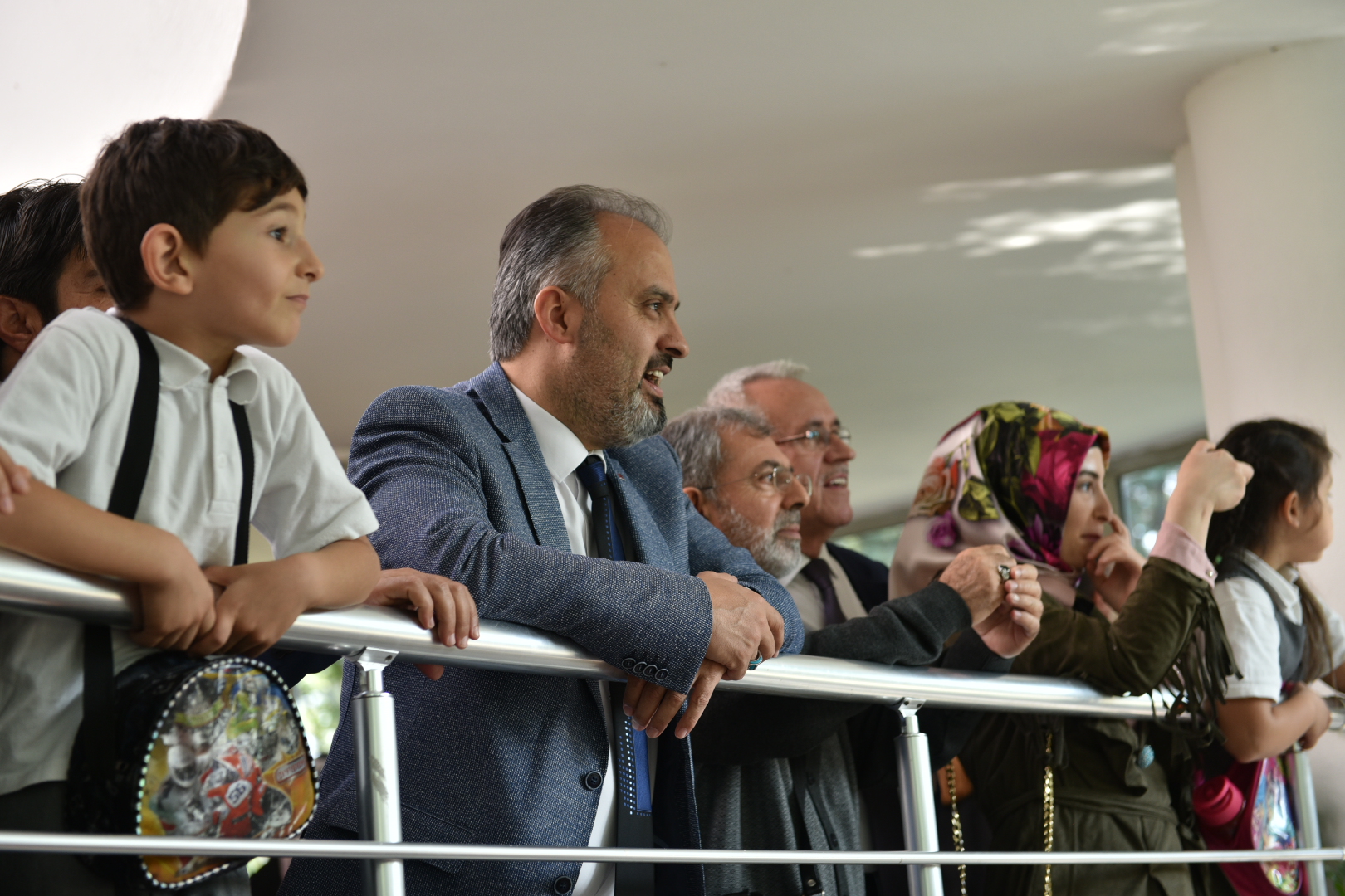 Serginin ardından Bursa Hayvanat Bahçesi’nin yeni sakinlerinden ‘Kırmızı Panda’ları ziyaret eden Başkan Aktaş, daha sonra minik öğrencilerle birlikte kaplanların beslenmesini izledi. Kaplanların ağaca tırmanarak eti kapmasını heyecanlı gözlerle izleyen minikler, o anları dikkatle izledi.