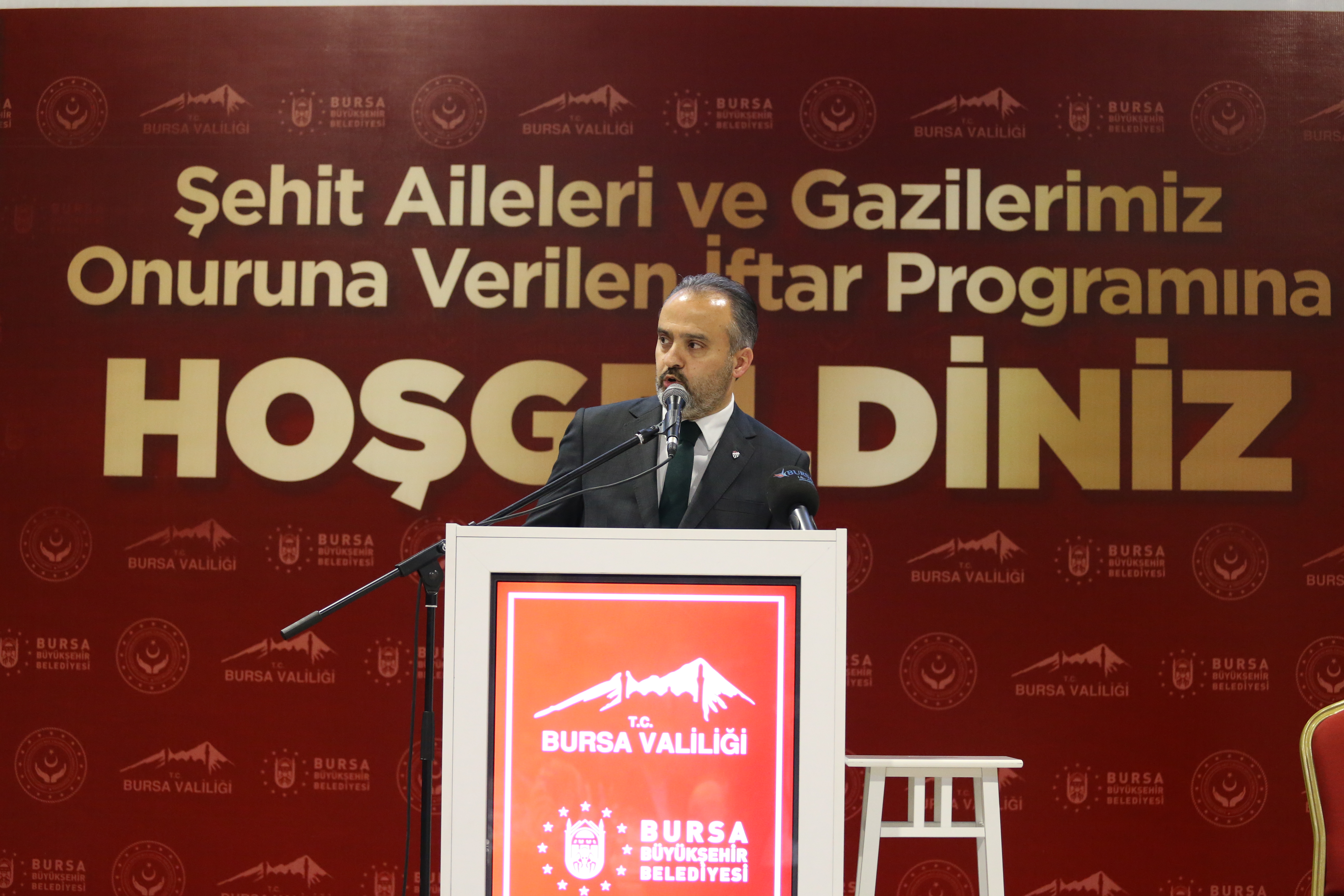 Genellikle maddi sıkıntısı olan veya başka sorunları bulunan ailelerle evlerde iftar yaptıklarını dile getiren Bursa Büyükşehir Belediye Başkanı Alinur Aktaş, “Ama bu akşam misafirlerimiz çok özel. Ülkemizin, bayrağımızın, devletimizin sembolü ve gururu olan şehit aileleri ve gazilerimizi konuk ettik. Onlarla ne kadar gurur duysak azdır” dedi.
