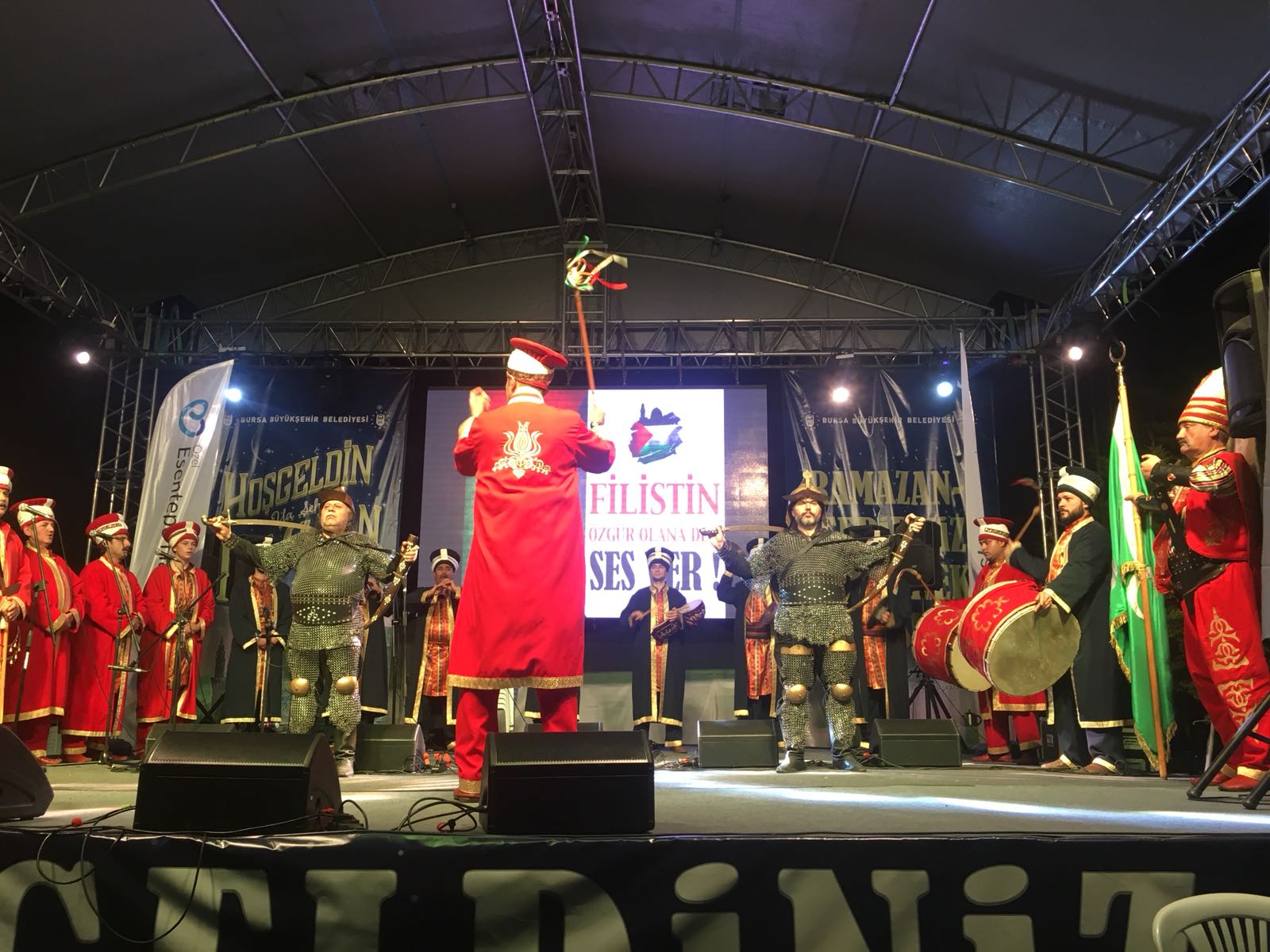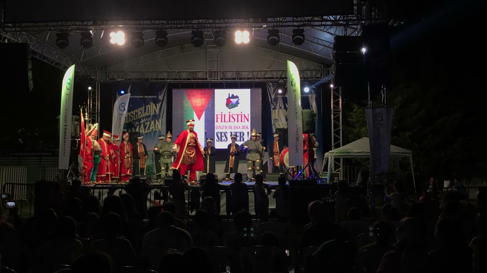 BURSA - Büyükşehir Belediyesi'nin 11 ayın sultanı Ramazan'da, kentin ruhaniyetli kimliğine uygun, toplumum tüm kesimlerine hitap eden Şehr-i Ramazan programları, vatandaşlardan yoğun ilgi görüyor. Her gece farklı programla vatandaşın iftar sonrası uğrak noktası olan Merinos ve Hüdavendigar Kent parklarındaki Şehr-i Ramazan programları, Ramazan akşamlarına renk katıyor. Büyükşehir Belediyesi Kültür Turizm Şube Müdürlüğü koordinasyonunda Bursa Kültür A.Ş. tarafından Ramazan'ın dördüncü akşamı Hüdavendigar Kent Parkı'nda gerçekleştirilen programda teravih öncesi sahne alan Büyükşehir Belediyesi Mehter Takımı, marşlar ve ilahiler ile kulakların pasını sildi. 19 Mayıs Atatürk'ü Anma Gençlik ve Spor Bayramı’na özel zafer marşları seslendiren mehterin coşkusuna alanı dolduran gençler de ortak oldu.