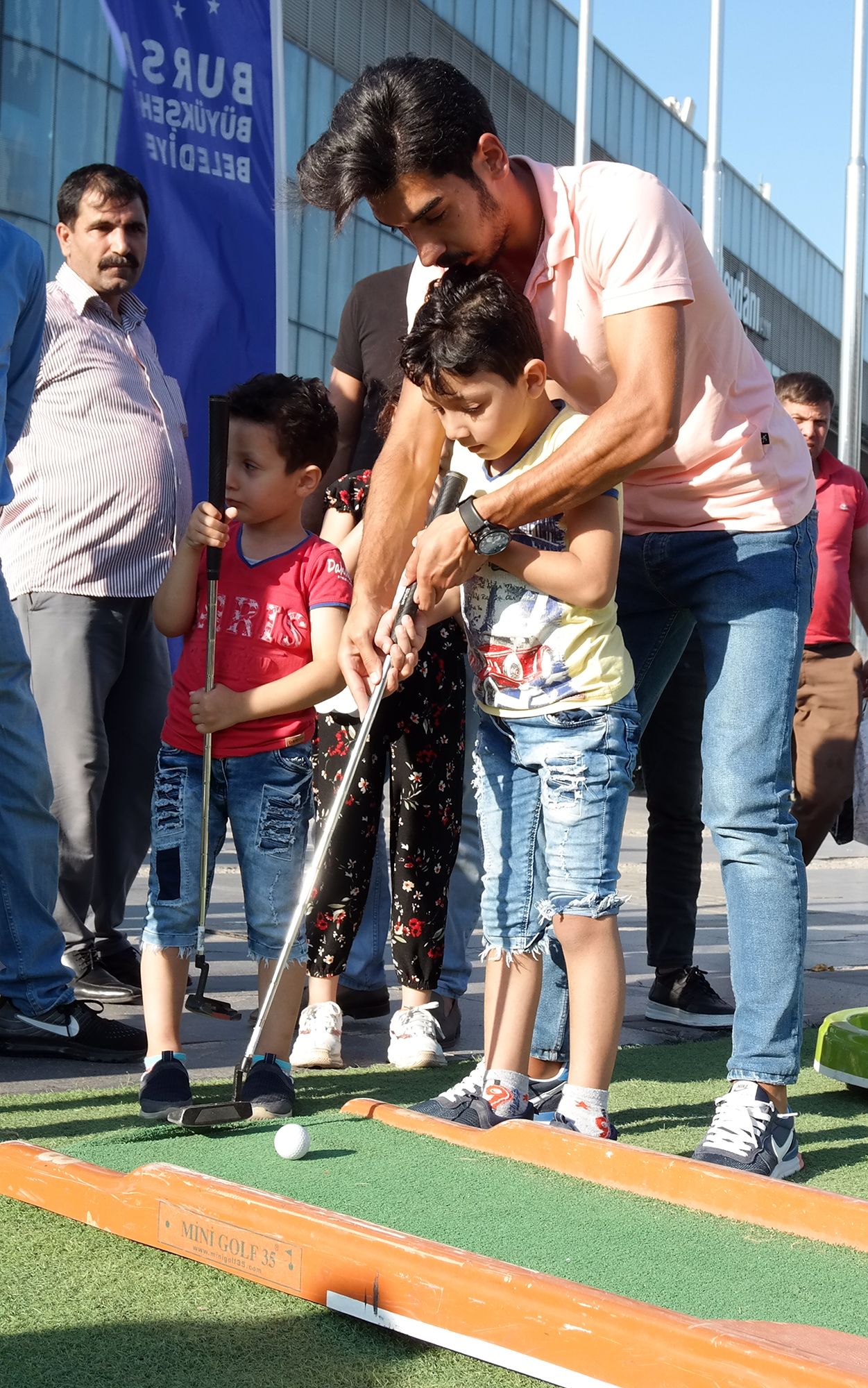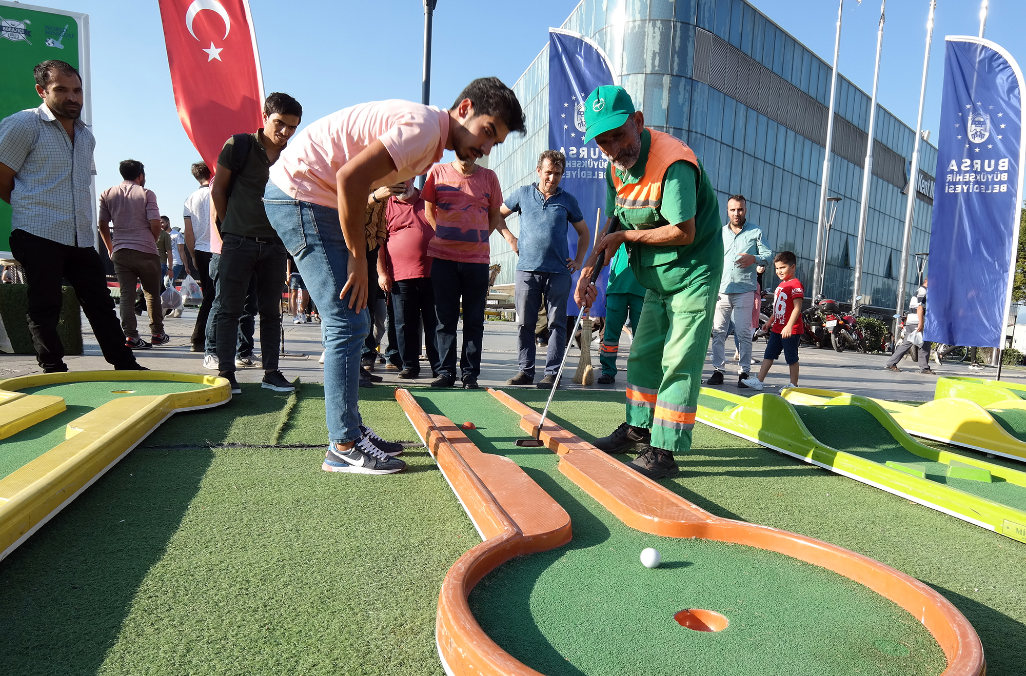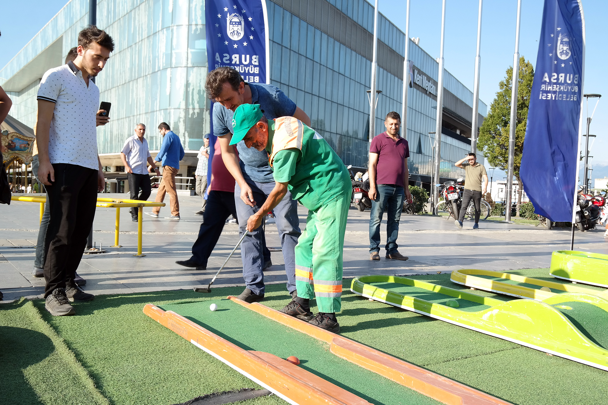 Yaz kış spor okulları, gençlik kampları ve okul sporları etkinlikleriyle sporu daha geniş kitlelere ulaştıran Bursa Büyükşehir Belediyesi, sporu tesislerin dışına taşıyıp, 7'den 77'ye herkesle buluşturmaya devam ediyor. Büyükşehir Belediyesi Gençlik ve Spor Hizmetleri Şube Müdürlüğü'nün Dünya Mini Golf Federasyonu Türkiye Temsilcisi Boğaziçi Golf Kulübü işbirliğiyle düzenlendiği etkinlik, dünyada yaygın olarak oynanan, Türkiye'de de son yıllarda ilginin giderek arttığı mini golf sporunu Bursalılarla buluşturdu. Yaya trafiğinin en yoğun olduğu kent meydanına kurulan golf platformlarını gören vatandaşlar önce meraklı gözlerle ne olduğunu anlaya çalışırken, kısa sürede golf sopalarını ellerinde buldu. Görevlilerden oyunun nasıl oynanacağını öğrenen vatandaşlar, platform üzerindeki deliğe golf topunu geçirebilmek için mücadele etti.