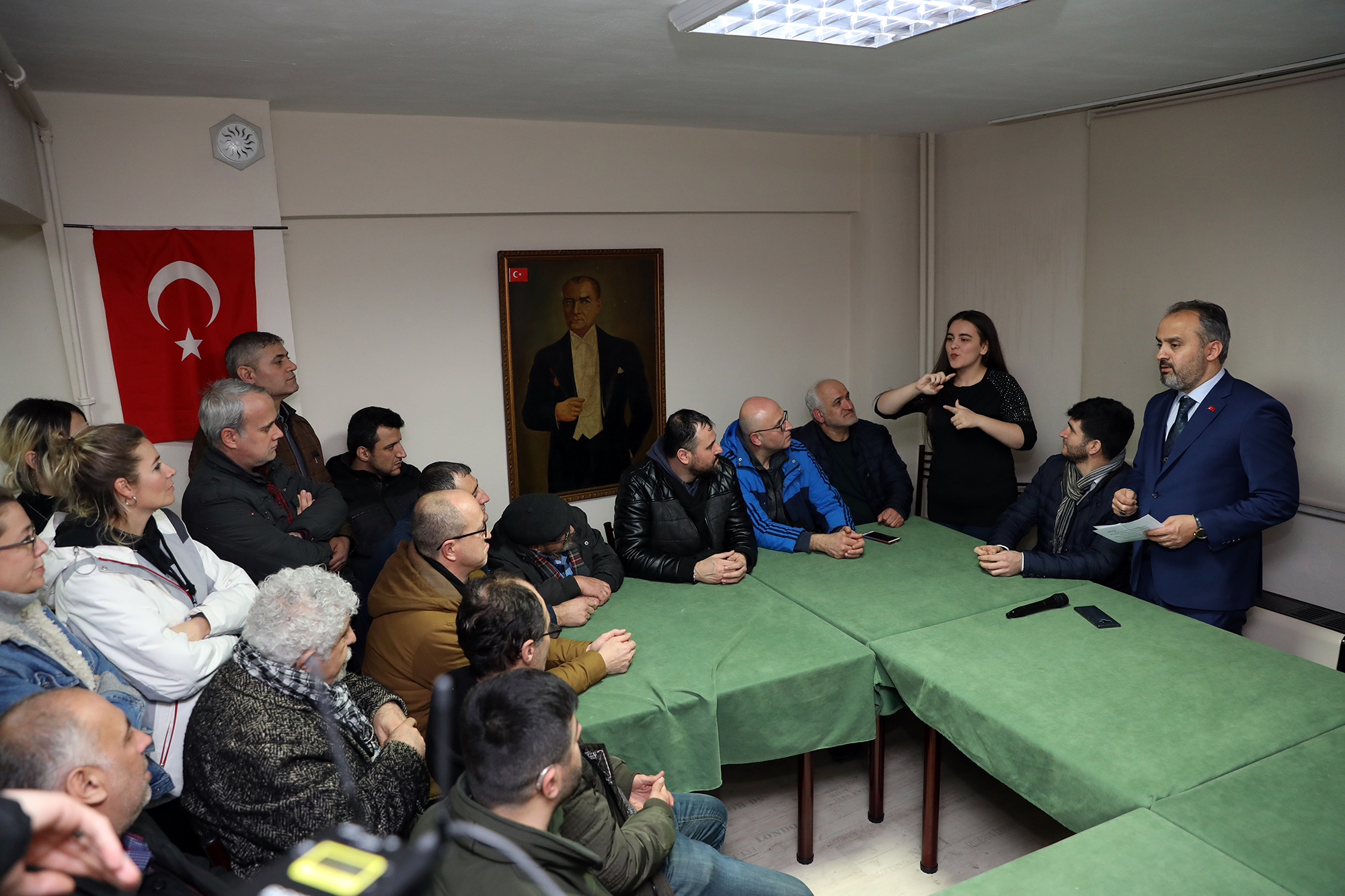 Bursa Büyükşehir Belediye Başkanı Alinur Aktaş, yoğun programına rağmen sivil toplum kuruluşlarına da zaman ayırmayı ihmal etmiyor. Son olarak beraberindeki Genel Sekreter Yardımcısı Murat Uşun ile birlikte Sağır ve Dilsizler Derneği’ni ziyaret eden Başkan Aktaş, işaret dili tercümanı yardımıyla dernek üyeleriyle sohbet etti. Tüm gelişmiş toplumlarda sivil toplum kuruluşlarının önemli olduğuna dikkat çeken Başkan Aktaş, “Çünkü herkes sporda, sanatta, kültürde kendini ifade etme imkanı sahip. Bu durumda olan sağır dilsiz kardeşlerimizin dernekleşmesi, bir dernek çatısı altında toplanması önemli. Burada kalabalık olmanız bir şeyler yapmak istemenizin kanıtıdır. Ülkemizde de farklı farklı durumlarda engelli insanlarımız var. Kimisi yürüme, kimisi konuşma, kimisi duyma, kimisi zihinsel engelli. Şükürler olsun artık güçlü bir devletimiz var. Cumhurbaşkanımızın engellilerle alakalı çok güçlü hamleleri var. Artık çok daha iyi imkanlar sunuluyor, evde bakım hizmetleri veriliyor” dedi.