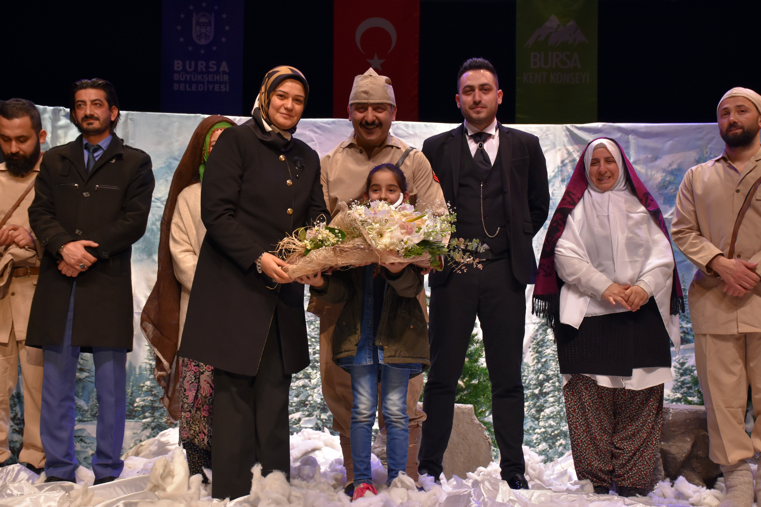 Bursa Büyükşehir Belediyesi Başkanvekili Mihrimah Kocabıyık, oyunda rol alan tiyatrocuları tebrik ederek, oyunu yazan ve yöneten Olcay Dursun’a çiçek takdim etti. Olcay Dursun da destek ve verilen imkanlar ötürü Bursa Büyükşehir Belediyesi Başkanı Alinur Aktaş’a teşekkür etti.