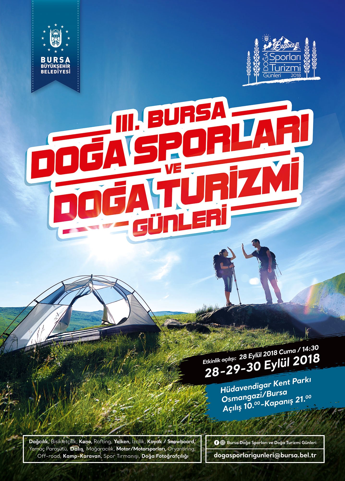 Bursa’nın gelişen yüzünü turizm olarak belirleyen ve bu hedef doğrultusunda kentin tarihi ve doğal kaynaklarını en iyi şekilde değerlendiren Büyükşehir Belediyesi, Doğa Sporları ve Doğa Turizmi Günleri etkinliğinde spor ve doğa tutkunlarını bir araya getirecek. Türkiye’nin en büyük etkinliklerinden biri olan Doğa Sporları ve Doğa Turizmi Günleri’nde; dağcılık, bisiklet, kano, rafting, spor tırmanış, mağaracılık, motor sporları, yelken, dalış, izcilik, kayak ve snowboard, kamp-karavan, hava sporları ve fotoğrafçılık gibi bir çok branş hem tanıtılacak hem de katılımcılara yerinde deneme fırsatları sunulacak. Hüdavendigar Kent Parkı’nda 28 Eylül Cuma akşamı saat 19.00’daki Vedat Bilir konseri ile başlayacak etkinlikler kapsamında hafta sonu da yine Hüdavendigar Kent Parkı’nda Türkiye Dağcılık Federasyonu ve Bursa İl Temsilciliği ile birlikte Bursalı milli sporcuların da katkılarıyla spor tırmanış yarışması düzenlenecek. 29 Eylül Cumartesi akşamı saat 19.00'da TV programcısı Güven İslamoğlu ile söyleşi programı gerçekleştirilecek. Yine parkın farklı bir odak noktası olan tenis kortlarında gösteri maçları yapılacak ve vatandaşların katılabileceği temel eğitimler verilecek. Türkiye Bisiklet Federasyonu Bursa İl Temsilciği ve Bursa Bisiklet Kulübü tarafından gerçekleştirilecek olan etkinlikler dahilinde ise güvenli sürüş eğitimleri, yavaş gitme yarışması, bisiklet ile kamp gibi birden fazla organizasyon doğa dostları ile buluşacak.