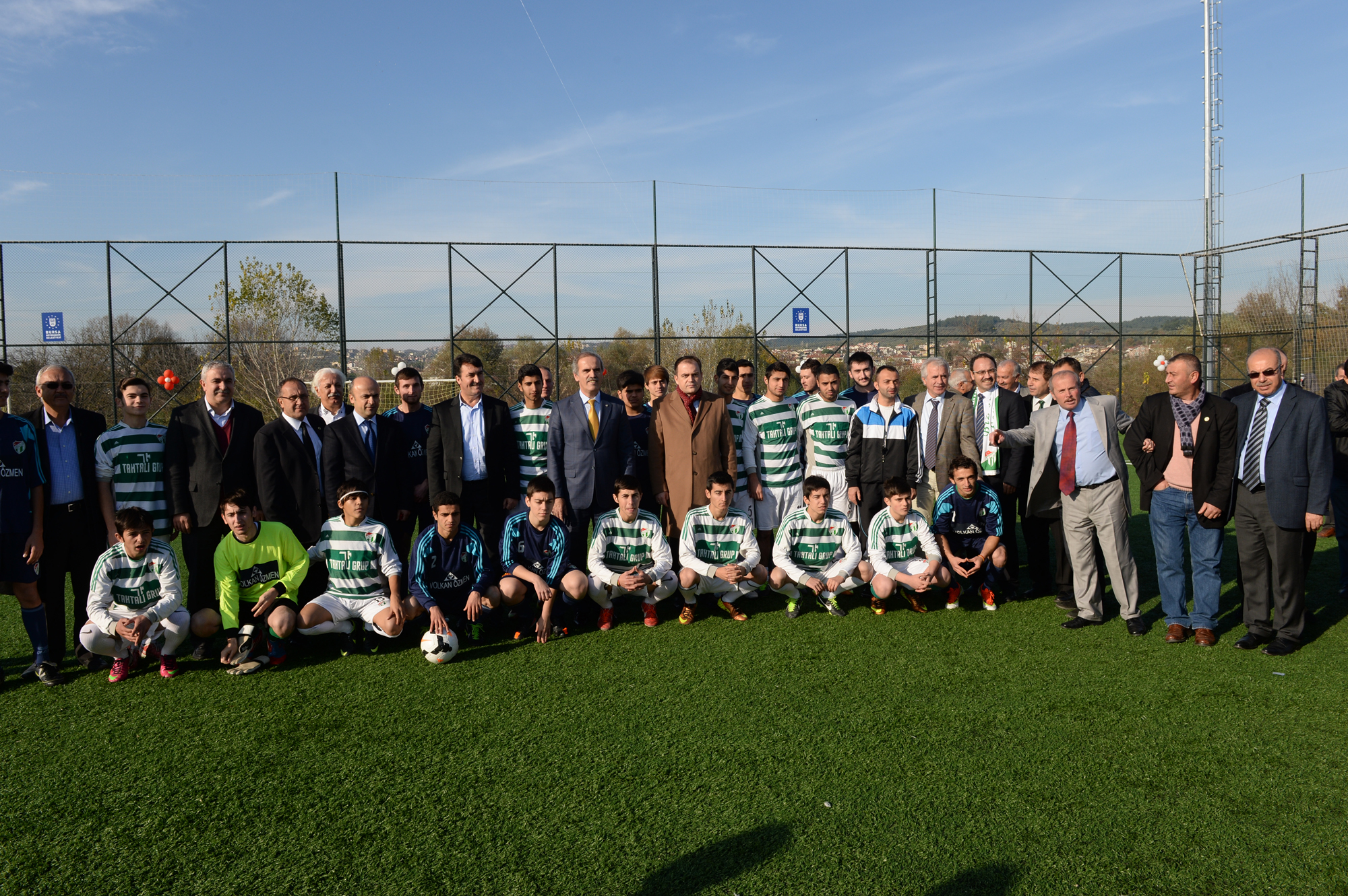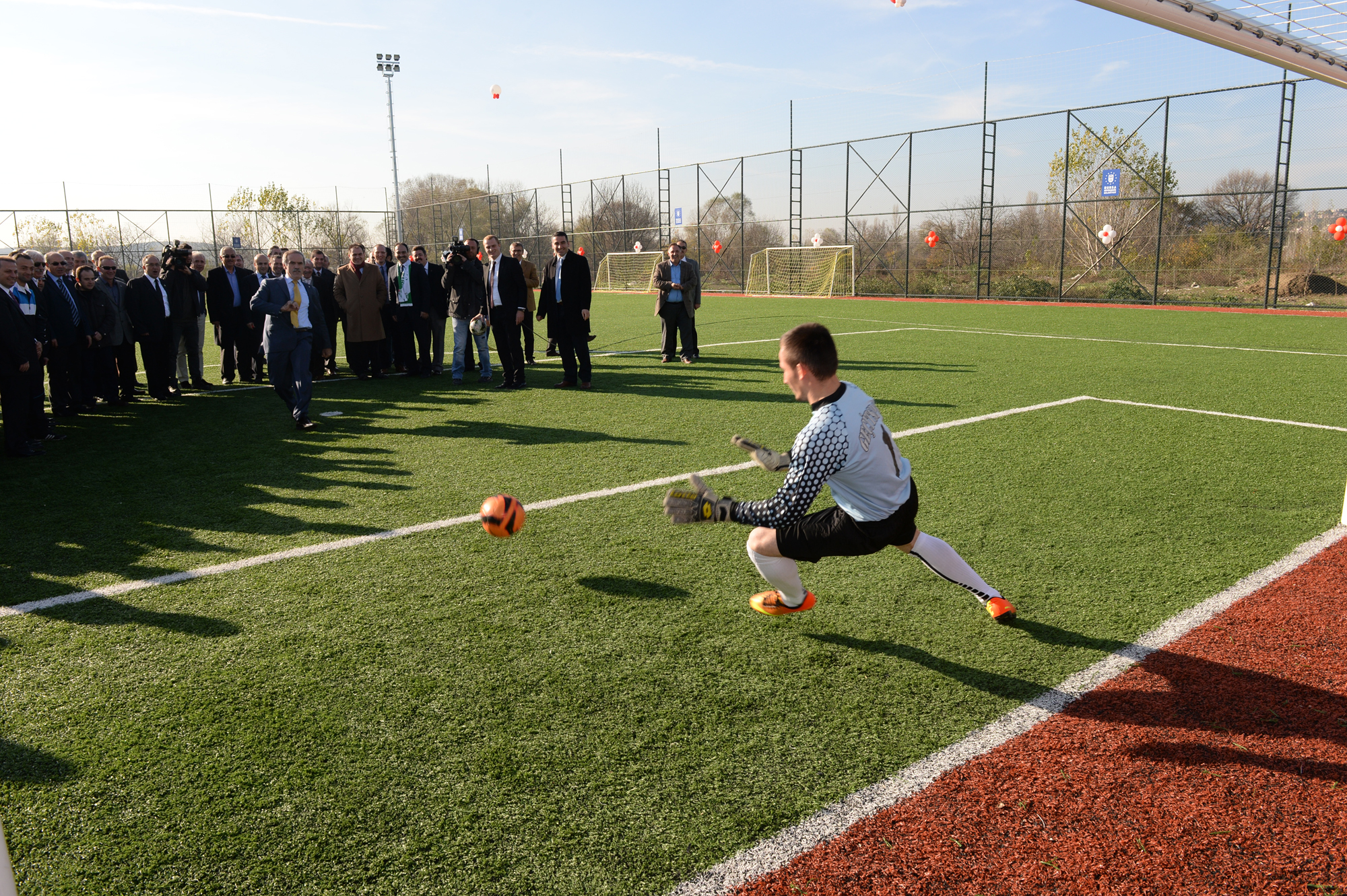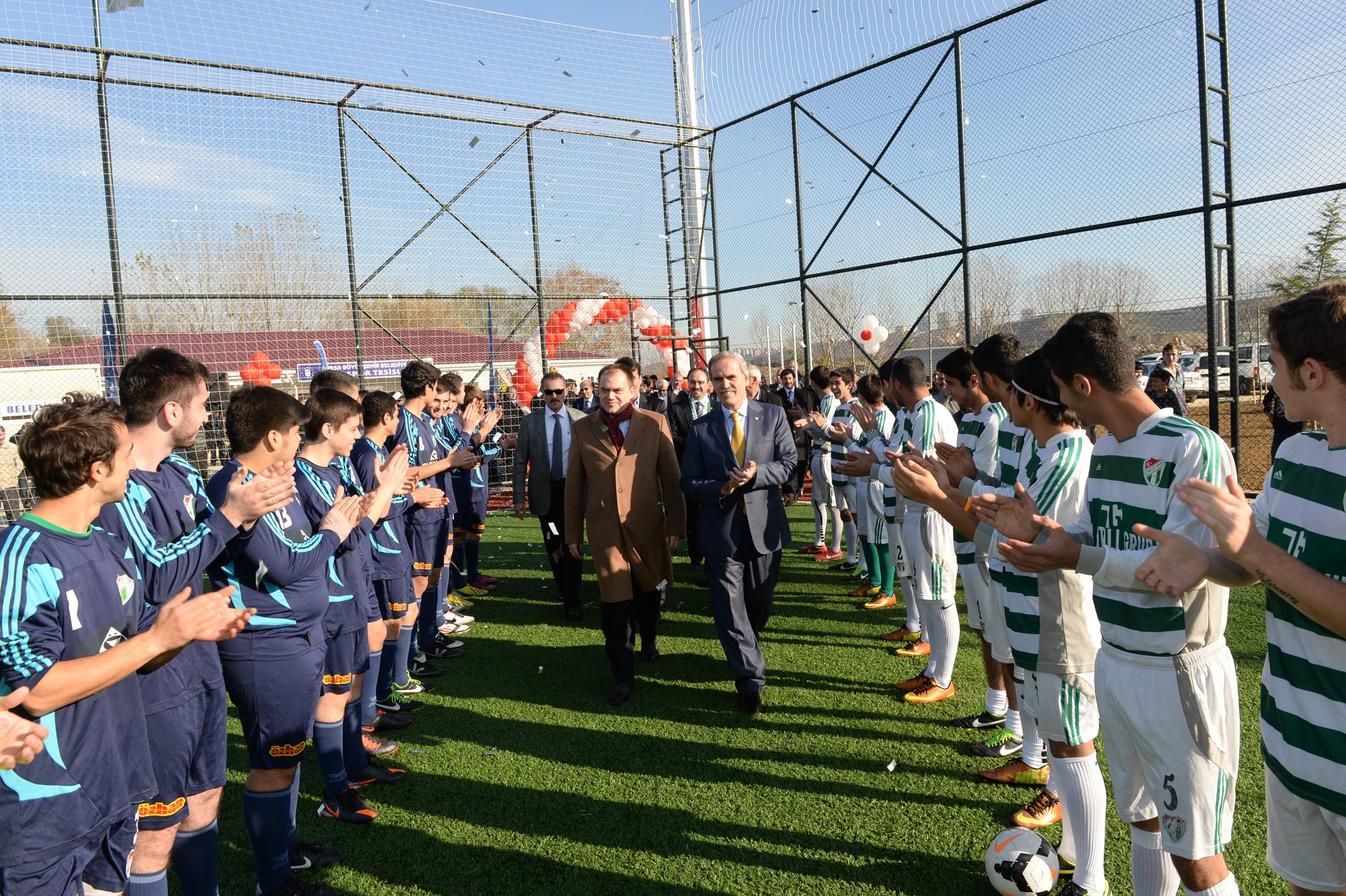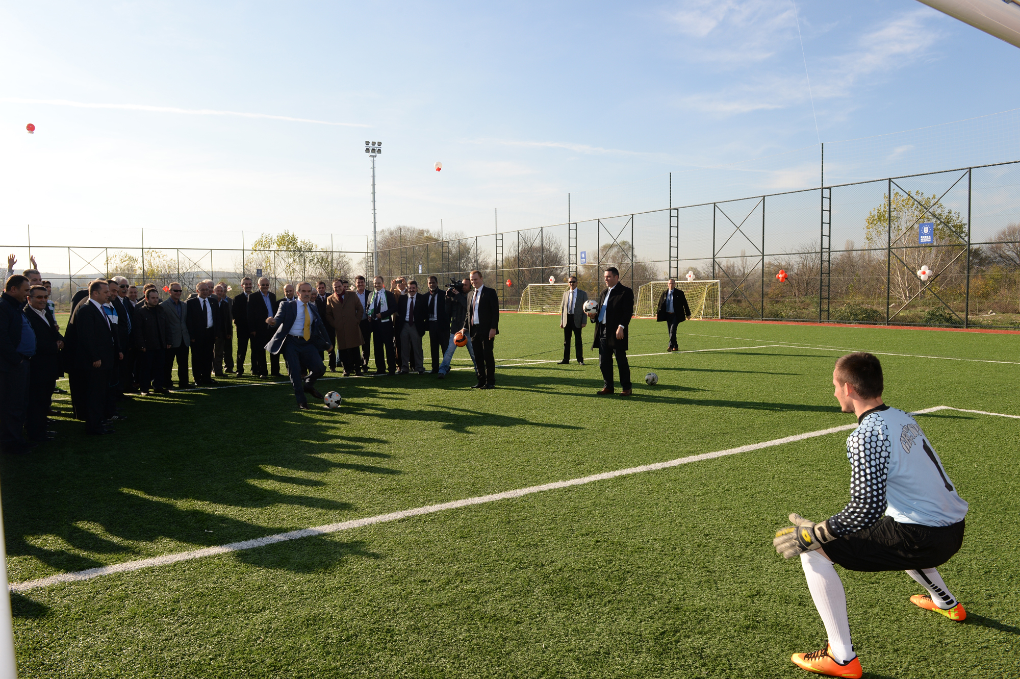 Konuşmaların ardından kurdeleyi keserek, sahayı hizmete açan Başkan Altepe ve protokol üyeleri daha sonra penaltı atışı yapıp, ilk maçın başlama vuruşunu yaptı.