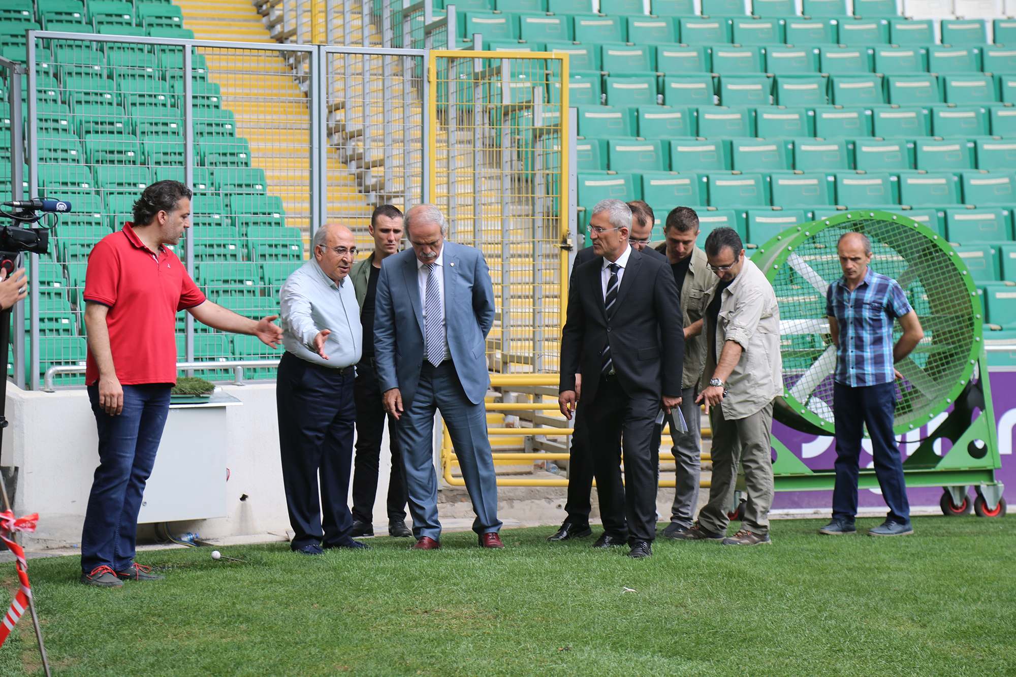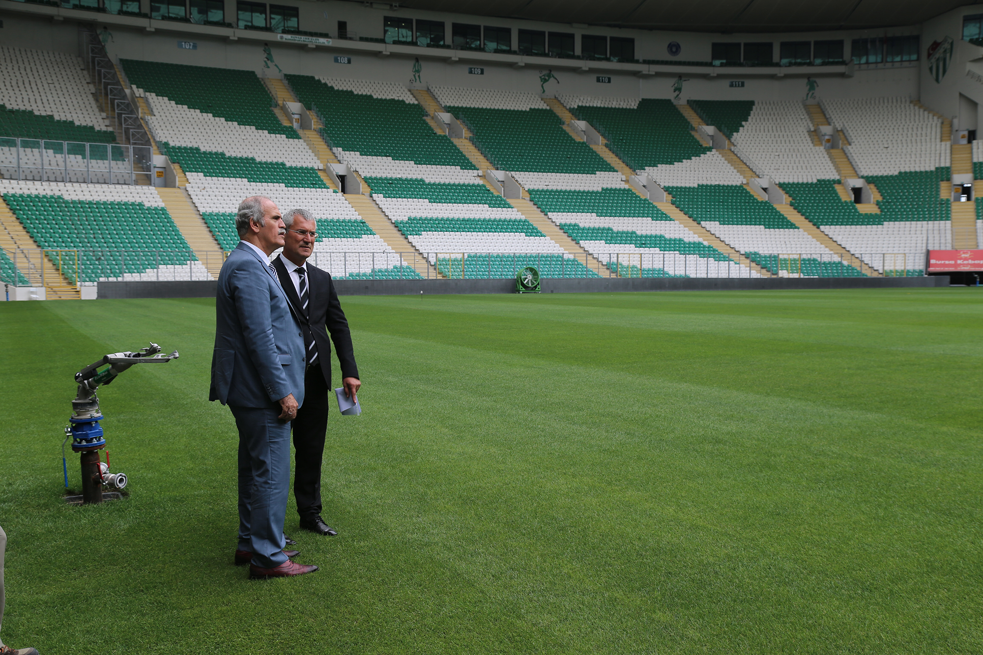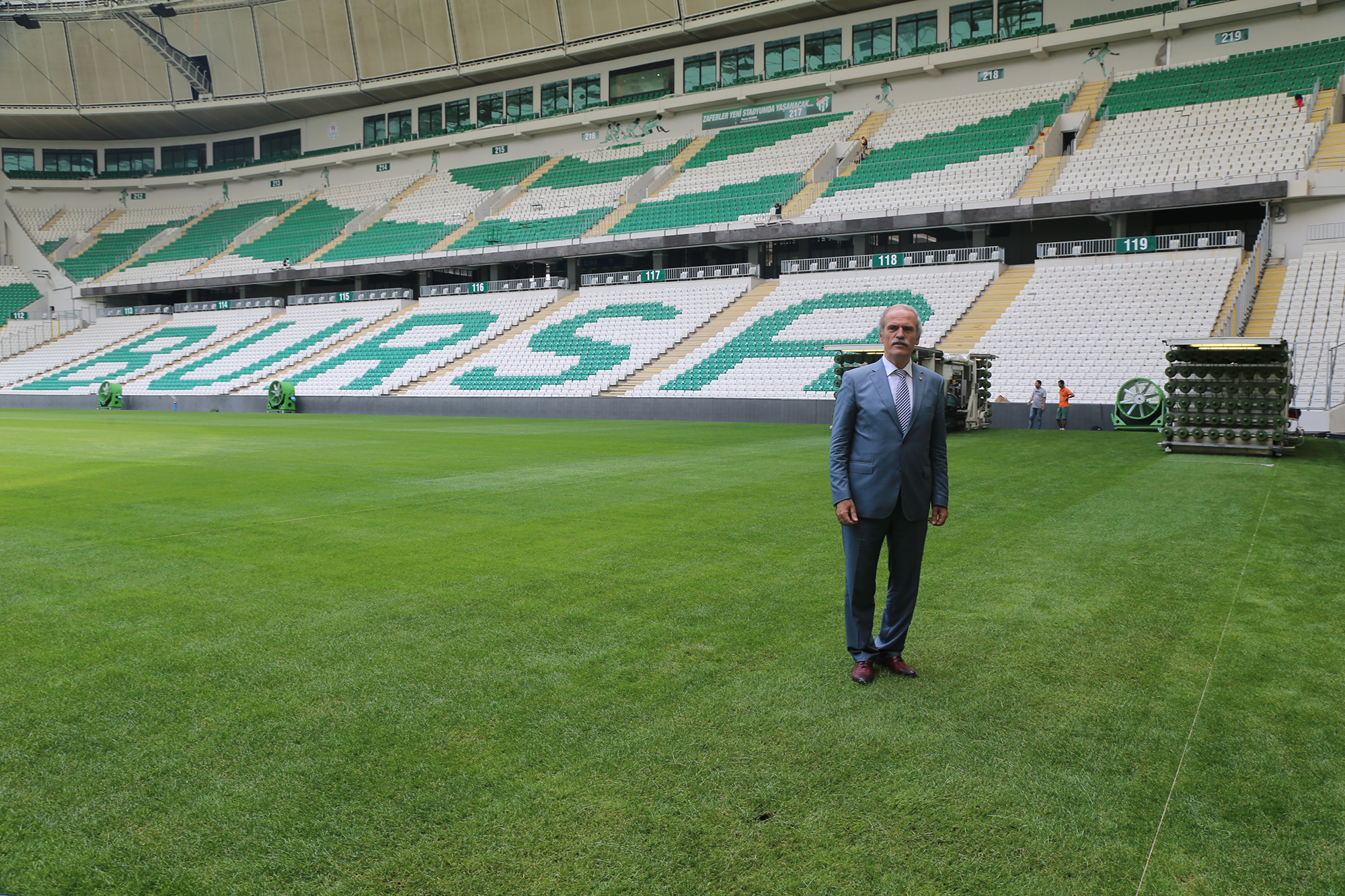 Büyükşehir Belediye Başkanı Recep Altepe, hibrit çim uygulamalarını yerinde inceledi. Yaklaşık 2 yıldır kullanılan stadyumun zemininde çeşitli sıkıntılar yaşandığını hatırlatan Başkan Altepe, “Bursa tarihinde kente kazandırılan en büyük eser stadyum. Her şeyi özenilerek yapıldı. Sıkıntı yaşanmasın diye tribün dizaynından her zeminine en iyisi oldu ve UEFA stantlarına göre tüm kriterlere uyuldu. Eksiklerin tamamlanması aksaklık giderilmesi için çalışmalarımız sürüyor. Aksaklık görülen yerlerden biri çimlerdi. Yapılırken Atatürk stadıyla aynı sistemin yapılmasını istemiştik, öyle de yapıldı. İki sezon oynandı ama belli sıkıntılar yaşandı. Çünkü konum Atatürk Stadıyla aynı değildi. Orada tribünlerin yüksekliği fazla değildi, zemin her taraftan güneş alıyordu. Burada etraf tamamen kapalı. Özellikle güney kale arkası dediğimiz kısımda sıkıntı oluyordu. Sonunda en modern sistemle hibrit olarak değiştiriyoruz. Bir daha sıkıntı yaşanmasın istiyoruz. Her şeyi güzel olsun kimse statla ilgili kötü konuşmasın istiyoruz. Çünkü Türkiye’de bu ayarda bir stadyum yok. Çalışmalar güneyden başlayarak ortaya doğru gidiyor. Maça kadar ortaya kadar bitmiş olacak. Maçtan sonra da kalan kısımlar tamamlanacak” diye konuştu.