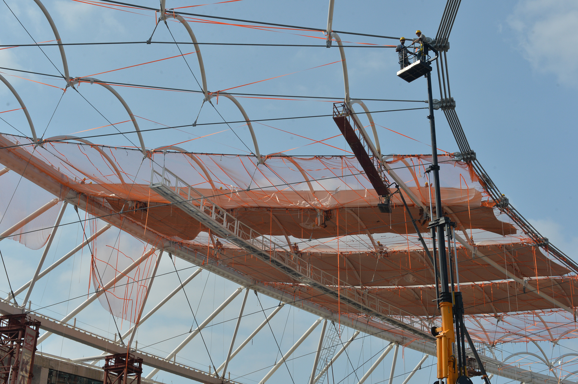 - BURSA BÜYÜKŞEHİR BELEDİYESİ TARAFINDAN YAPTIRILAN YENİ STADYUMUN ÇATISINDA YAKLAŞIK 40 METRE YÜKSEKLİKTE ÇALIŞAN İŞÇİLER, BEYAZ RENKLİ TEFLON MALZEMENİN KAPLAMASINA BAŞLADI.