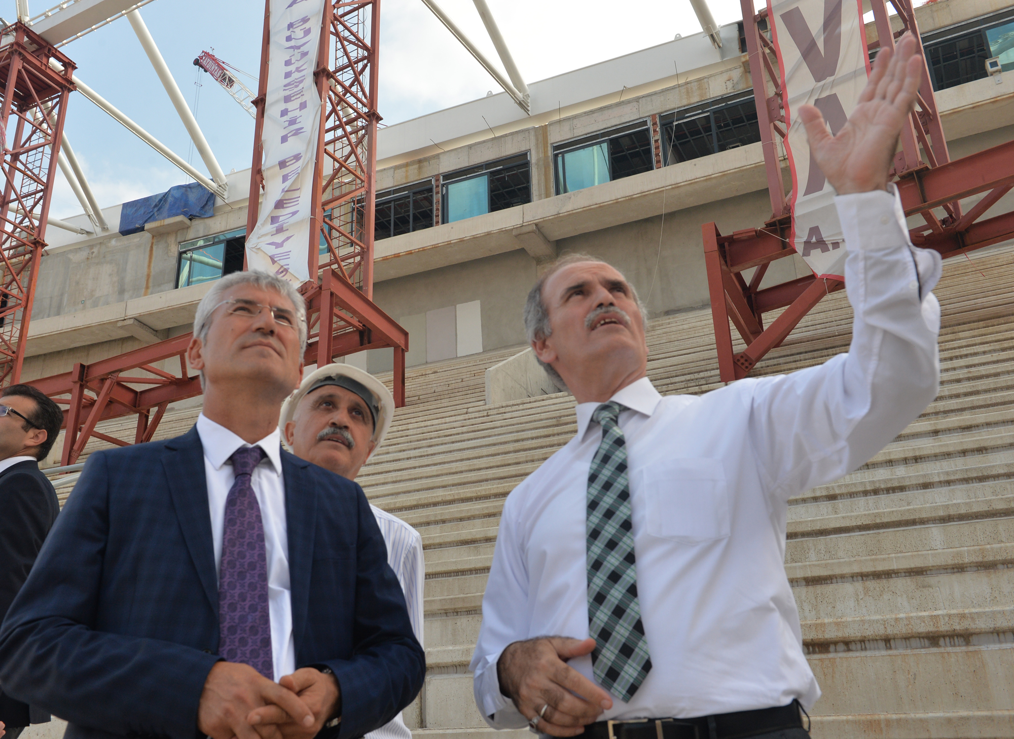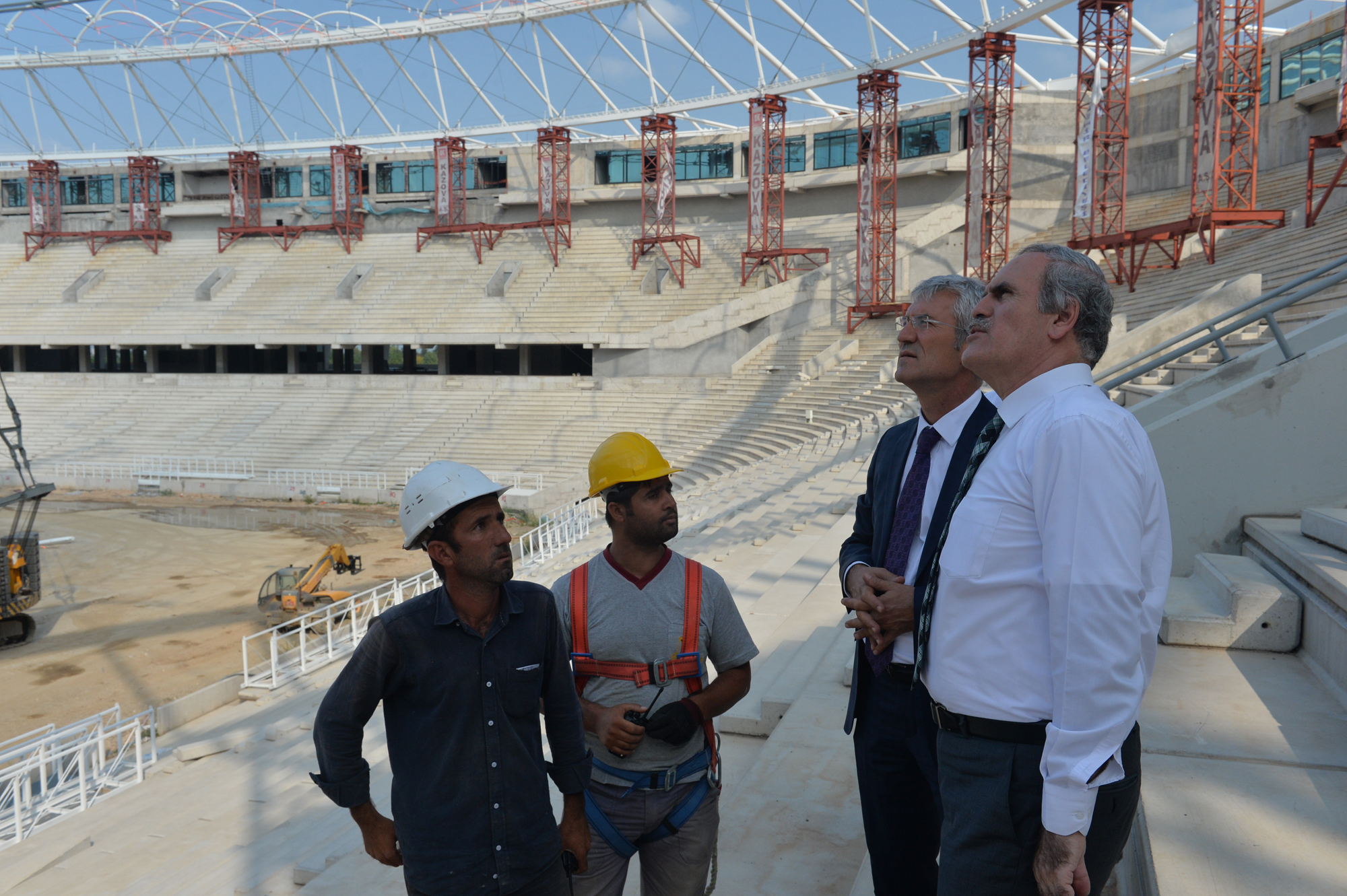 Büyükşehir Belediye Başkanı Recep Altepe, beraberindeki Genel Sekreter Yardımcısı Mustafa Altın ile birlikte stadyumda devam eden çalışmaları yerinde inceledi. Yüklenici firmanın sorumlularından çalışmalar hakkında bilgi alan Başkan Altepe, Bursa’nın yeni sembolü olacak en önemli anıtsal yapılandan biri olan stadyumda çalışmaların hızla ilerlediğini söyledi. Dünyadaki önemli bütün stadyumların incelendiğini ve en ayrıcalıklı projenin Bursa’ya kazandırıldığını hatırlatan Başkan Altepe, “Yeşil – beyaz renkli teflon malzemenin ilk bölümü olan beyaz malzemenin kaplanmasına başlandı. 15 gün içinde ilk turun tamamlanmasını bekliyoruz. Yeşil malzemenin de kaplanmasıyla çatı tüm ihtişamı ile ortaya çıkacak” dedi.