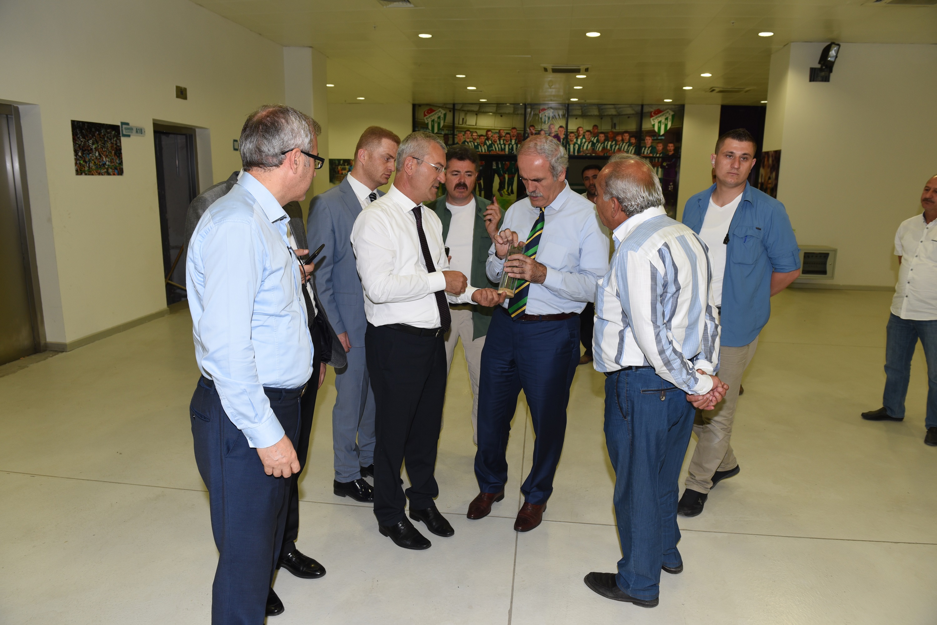 Büyükşehir Belediye Başkanı Recep Altepe, beraberinde Genel Sekreter Yardımcısı Mustafa Altın ve Bursa Kent Konseyi Başkanı Hasan Çepni ile birlikte stadyumun yenilenen zeminini inceledi. Yaklaşık 2 yıldır kullanılan stadyumun zemininde çeşitli sıkıntılar yaşandığını hatırlatan Başkan Altepe, “Atatürk stadyumunun zeminini yapan firmadan burada da aynı uygulamayı yapmasını istemiştik. Ancak aynı uygulama buraya uyum sağlamadı. Zeminin daha sağlam olması için hibrit çim uygulaması isterdi. Her şeyi 4- 4’lük olan stadyumun zemininin de öyle olması için hibrit çim uygulaması yapıyoruz. Zemindeki killi toprak kaldırıldı, altyapı yeniden düzenlendi ve çim kaplama işlemi de tamamlandı. 15 gün sonra da hibrit çim uygulaması yapılacak. Böylelikle zeminin mukavemeti artacak, bakımı daha kolay olacak. Su geçirgenliği ise 8 kat artacak. Drenaj sistemi olsa da son yıllarda kısa zamanda ani yağışlar olabiliyor. Bu ani ve büyük yağışlarda da zeminde su tutma olayı yaşanmayacak. Yüzde 5 oranında hibrit ve yüzde 95 oranında normal çim uygulaması yapılacak. İnşallah yeni sezonda tüm eksiklikleri giderilmiş yeni stadyumumuz Bursaspor’a da başarılar getirecek” diye konuştu.