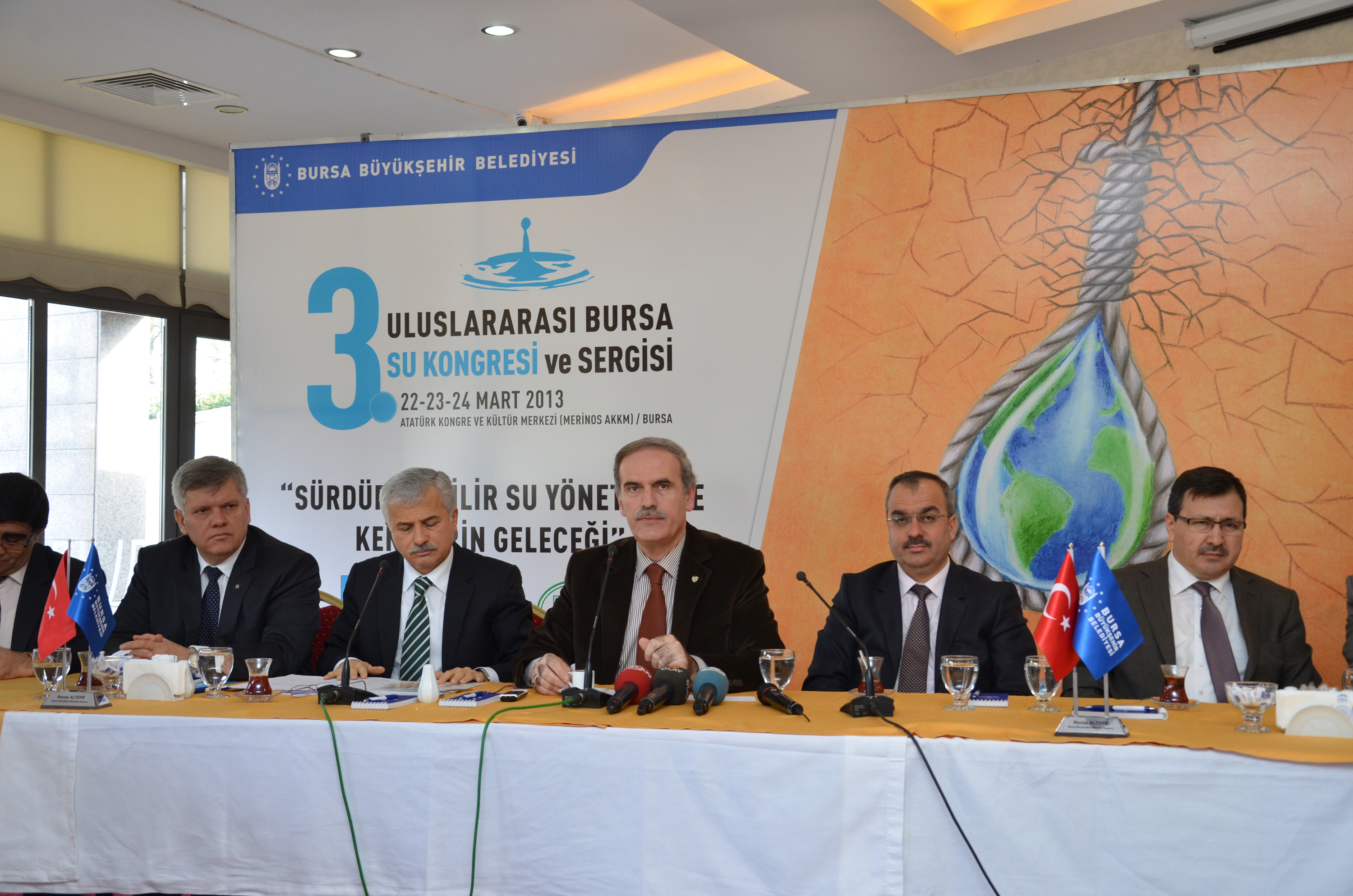 Büyükşehir Belediye Başkanı Recep Altepe, su yönetimi ve kentlerin geleceğinin dünyanın ortak sorunlarından biri olduğunu, sorunun çözümünün öncelikle yerel yöneticilerin sorumluluğunda bulunduğunu hatırlattı. Bursa´nın tarihte birçok ilke ev sahipliği yaptığını, şu anda da sanayide, tarımda, turizmde, tarihi mirasın ve doğal zenginliğin korunmasında Türkiye´nin en başarılı kentleri arasında bulunduğunu belirten Başkan Altepe, Evliya Çelebi´nin deyimiyle ´sudan ibaret´ olan Bursa´nın su konusunda alt yapısını tamamlamış ender kentlerden biri olduğunu vurguladı. Şehrin tarihi misyonuna uygun olarak daha önce 2 kez düzenledikleri sempozyumun bu yıl 3.´sünü gerçekleştirmekten dolayı mutlu olduklarını ifade eden Başkan Altepe, "22 Mart Dünya Su Günü nedeniyle; Büyükşehir Belediyesi, Bursa Su ve Kanalizasyon İdaresi ve Su Vakfı olarak böyle bir kongrenin düzenlenmesini kararlaştırdık. Sempozyumda dünyada ve ülkemizde su kaynaklarının tespiti, geliştirilmesi, işletilmesi, bakımı ve sorunların belirlenmesi tartışılacak, çözüm önerileri ortaya konulacak. Yine kongre kapsamında kapsamında; sürdürülebilir su yönetimi ve kentlerin geleceği hakkında yerel yöneticiler bilgilendirilecek, yerel sorunlar ortaya konulacak ve çözüm önerileri tartışılacak, kamu kurum ve kuruluşları ile özel sektör temsilcileri bilgi alışverişinde bulunacak. 3 gün boyunca ortaya çıkan sonuçlar kitap haline getirilerek, kaynak olarak kullanılacak" dedi.