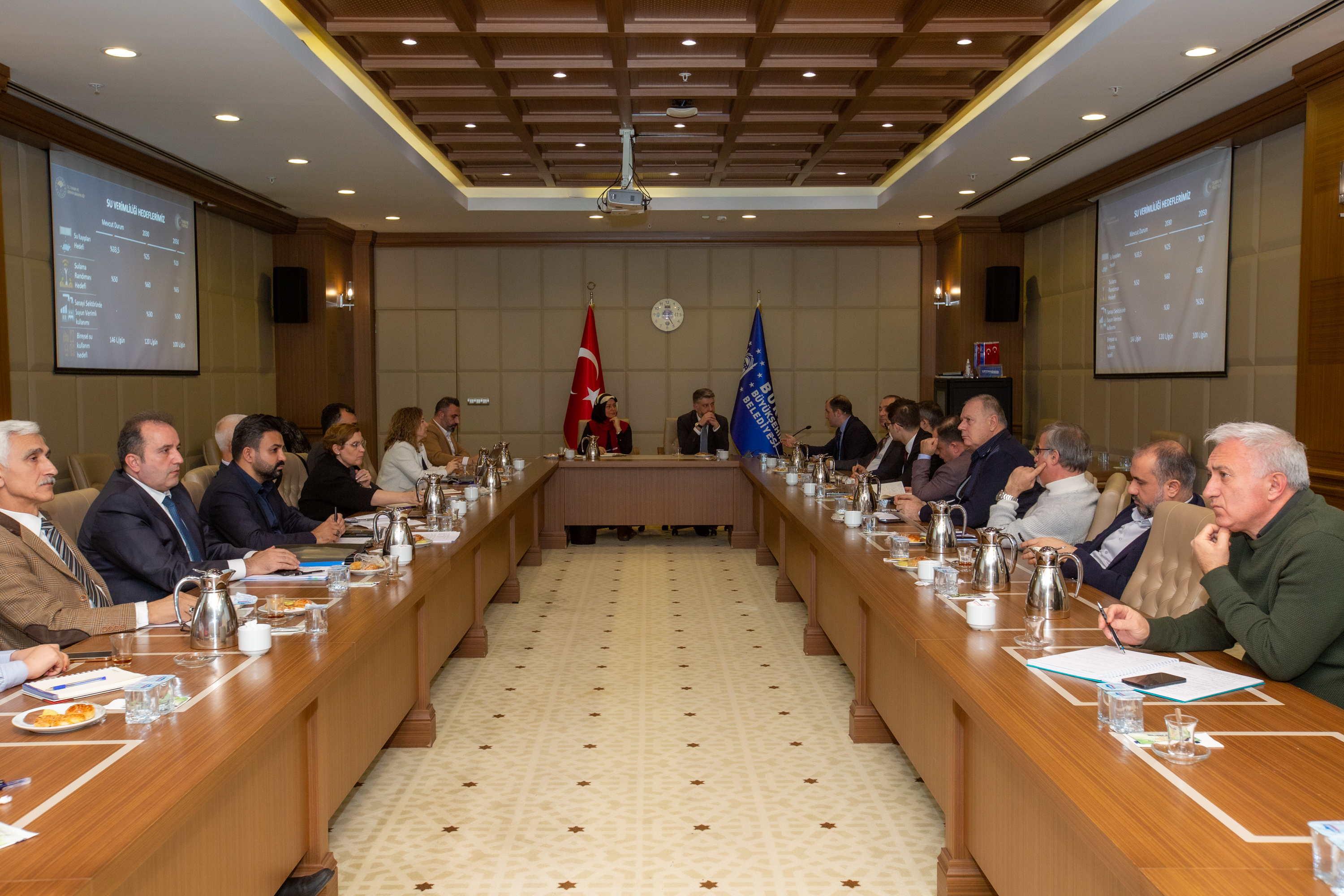 Küresel ısınma ve iklim değişikliğine bağlı yaşanan kuraklık tüm dünyanın en önemli gündem maddelerinden biri haline gelirken, Bursalıları bir gün bile susuz bırakmamak için gerekli her türlü yatırımı hayata geçiren Büyükşehir Belediyesi, diğer taraftan konuyu tüm yönleri ile mercek altına aldı. Büyükşehir Belediye Meclisi’nde Su Komisyonu kurulurken, komisyon Bursa’nın su potansiyeli, tarım, sanayi ve bireysel su kullanımı ve alınması gereken önlemlerle ilgili çalışmalara hızla devam ediyor. DSİ, Çevre Şehircilik ve İklim Değişikliği Bakanlığı, Su Yönetimi Genel Müdürlüğü, üniversiteler, BUSKİ ilgili akademik odalarla birlikte gerekli saha çalışmalarını yapan komisyon, Doğancı ve Nilüfer Barajlarının yanında sanayi bölgelerindeki arıtma tesislerinde de incelemelerde bulundu. Büyükşehir Belediyesi Encümen Salonu’nda yapılan su yönetimi değerlendirme toplantısında, bugüne kadar yapılan çalışmalar masaya yatırıldı. Büyükşehir Belediyesi Genel Sekreteri Ulaş Akhan’ın başkanlığında yapılan toplantıya Meclis Su Komisyonu Başkanı Mihrimah Kocabıyık, Tarım ve Orman Bakanlığı Su Yönetimi Genel Müdürlüğü Araştırma ve Değerlendirme Daire Başkanı Yusuf Başaran, BUSKİ Genel Müdür Yardımcısı Devrim İzgi, komisyon üyeleri ve konunun tüm tarafları katıldı.