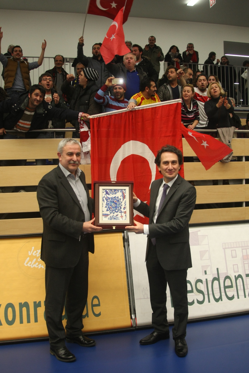 Maçın ardından Bursa Büyükşehir Belediyespor Başkan Yardımcısı İlhan Satık, Münih Başkonsolusu Mesut Koç’a plaket ve hediye takdim etti.