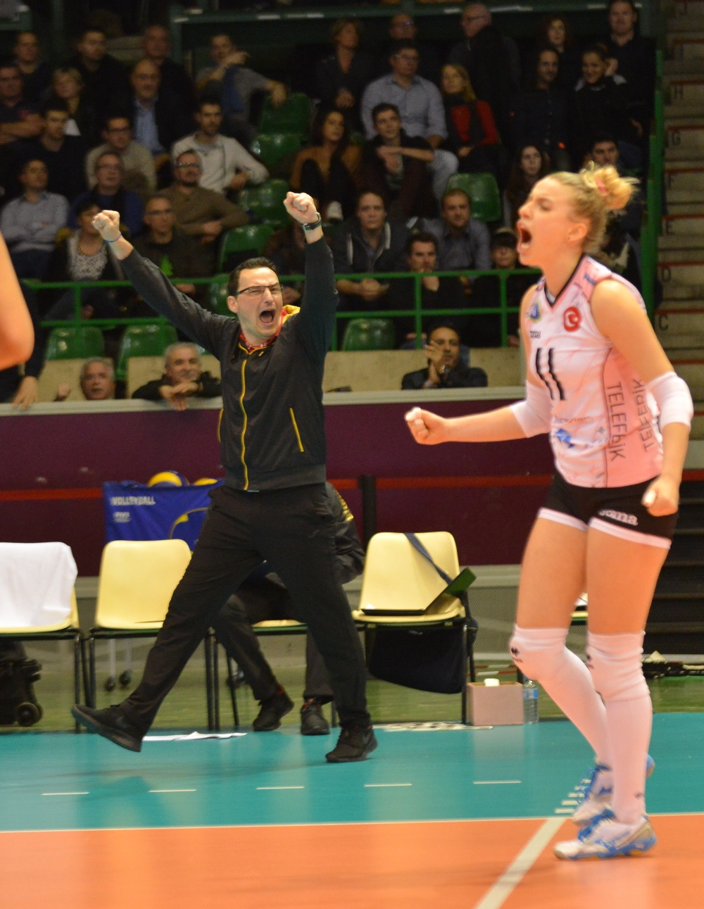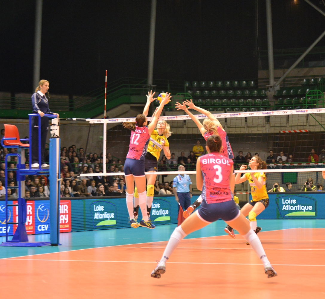 Yaklaşık dört bin kişinin izlediği müsabakada, ev sahibi ekip VB Nantes maça iyi başladı. Bursa Büyükşehir Belediyespor Kulübü hücumda etkinliğini göstermeye başlayınca ilk teknik molaya 8-5 önde girdi. Teknik molanın ardından aradaki farkı eriten Fransa temsilcisi, ikinci teknik molaya önde 16-15 ile önde giren taraf oldu. Teknik molanın ardından iki taraf da karşılıklı uzun rallilerle sayı buldu. Bursa temsilcisi tekrar defans hataları yapınca uzun bir süre önde kalmasına rağmen Bursa Büyükşehir Belediyespor, Nikolic’in etkili servisi, Joycinha ve Ciara sert smaçları ile ilk seti 26-24 almayı başardı. İkinci sete Bursa Büyükşehir Belediyespor Kulübü sayı ile başlamasına rağmen, VB Nantes taraftarının yoğun tezahuratları ile ritmi yakalayınca farkı açmayı bildi. (6-2) Yeşil-Beyazlılar saha kenarından verdiği direktiflerle adeta maça tekrar döndü ve ikinci setin ilk teknik molasına 8-7 ikinci teknik molasına da 16-11 önde girmeyi başardı. İkinci teknik molanın ardından Fransa temsilci VB Nantes tekrar taraftarının desteği ile beraber ritmi yükseltince, yeşil-beyazlıları hataya zorladı ve farkı 1 sayıya kadar indirmeyi başardı.(17-18) Servislerin sürekli el değiştirdiği ikinci teknik molanın ardından uzatmaya giden sette ev sahibi ekip VB Nantes 26-24 seti almayı başardı ve skoru eşitledi. Üçüncü sete yeşil-beyazlılar fırtına gibi başladı. Pasör Frauke’nin harika paslarını aynı güzellikte değerlendiren Bursa Büyükşehir Belediyespor’un etkili smaçları üçüncü setin ilk teknik molasına 8-2 ve ikinci teknik molaya 16-4 önde girerek oyuna ağırlığını iyice koydu. Bursa temsilcisi uzunları Nikolic ve Ciara ile etkili bloklarla da rakibine sayı kazanma şansı vermezken bu seti de 25 –10 geçti ve skoru 2-1’e getirdi çeyrek finali garantiledi. Formalite olarak oynanan ve başa baş geçen son seti de Bursa Büyükşehir Belediyespor Kulübü 25-22 geçerek maçı 3-1 kazandı. Maçın ardından büyük sevinç yaşayan sporculara, Bursa Büyükşehir Belediyespor Kulübü yöneticileri ile maçı beraber izleyen Nantes Baş Konsolosu İshak Ebrar Çubukçu çiçek takdim etti. Türk taraftarlar da sporcularla bol bol hatıra fotoğraf çektirdi.