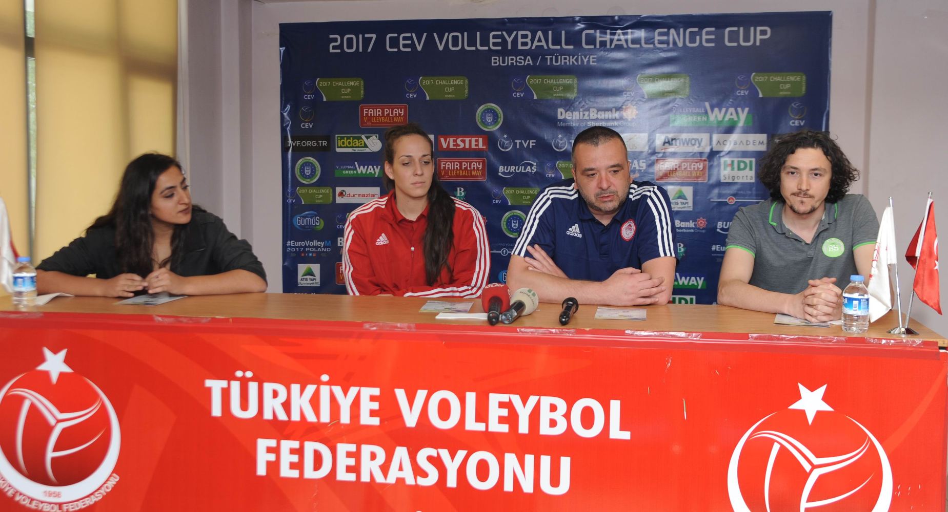 CEV Challenge Kupası final maçı öncesi Cengiz Göllü Voleybol Salonu’nda gerçekleştirilen basın toplantısına katılan Bursa Büyükşehir Belediyespor ve Olympiakos kulüpleri voleybol takımlarının baş antrenörleri ve takım kaptanları, final heyecanını paylaştı. Her iki takımın baş antrenörleri ve takım kaptanları sporseverlerin yarın çekişmeli bir maç izleyeceğini söyledi.