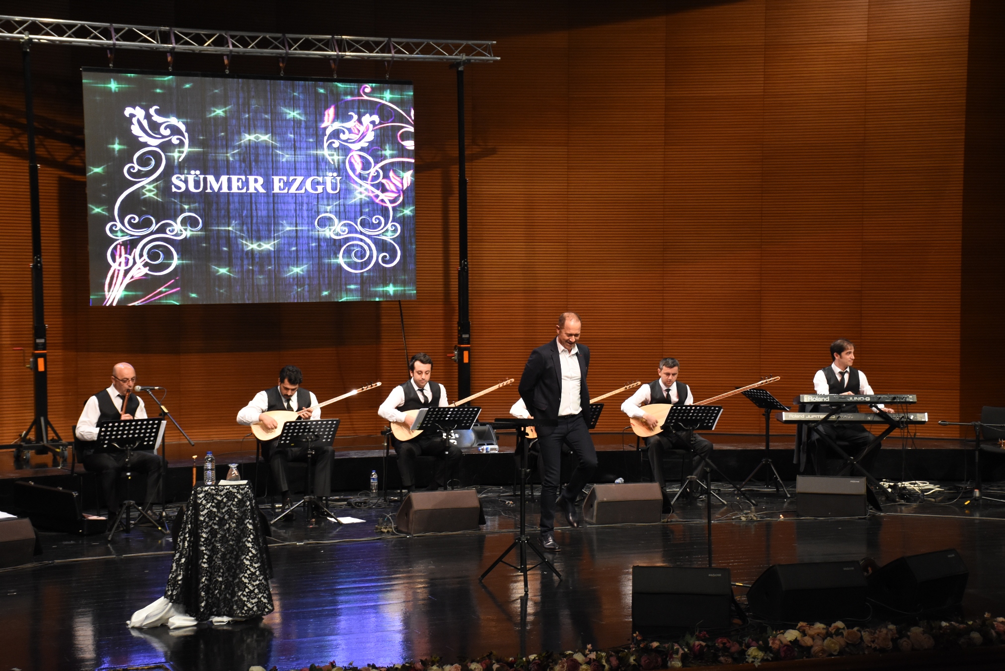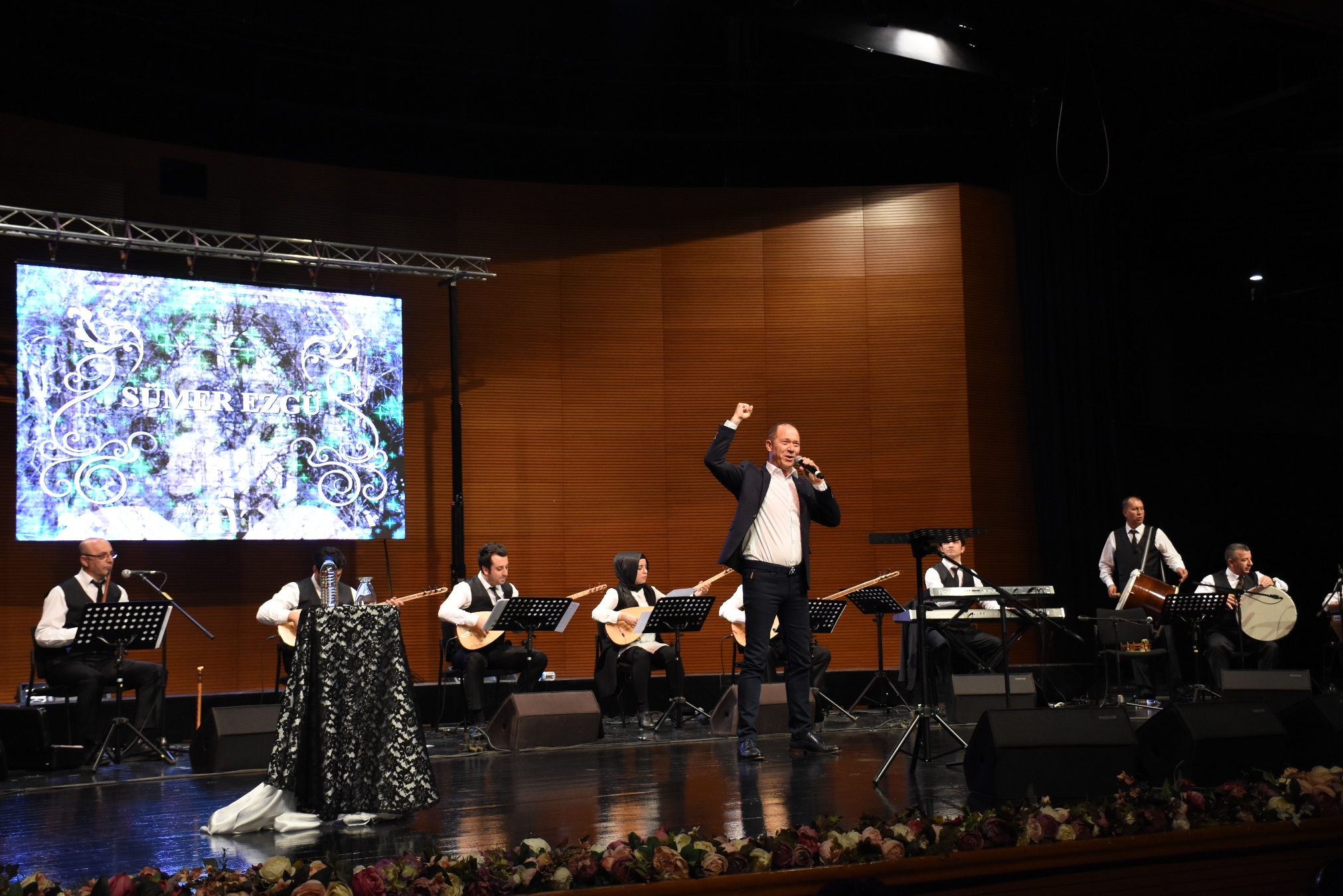 Konserin sonunda, ‘protokol üyeleri tarafından’ Ünlü Sanatçı Sümer Ezgü’ye çiçek takdim edildi.