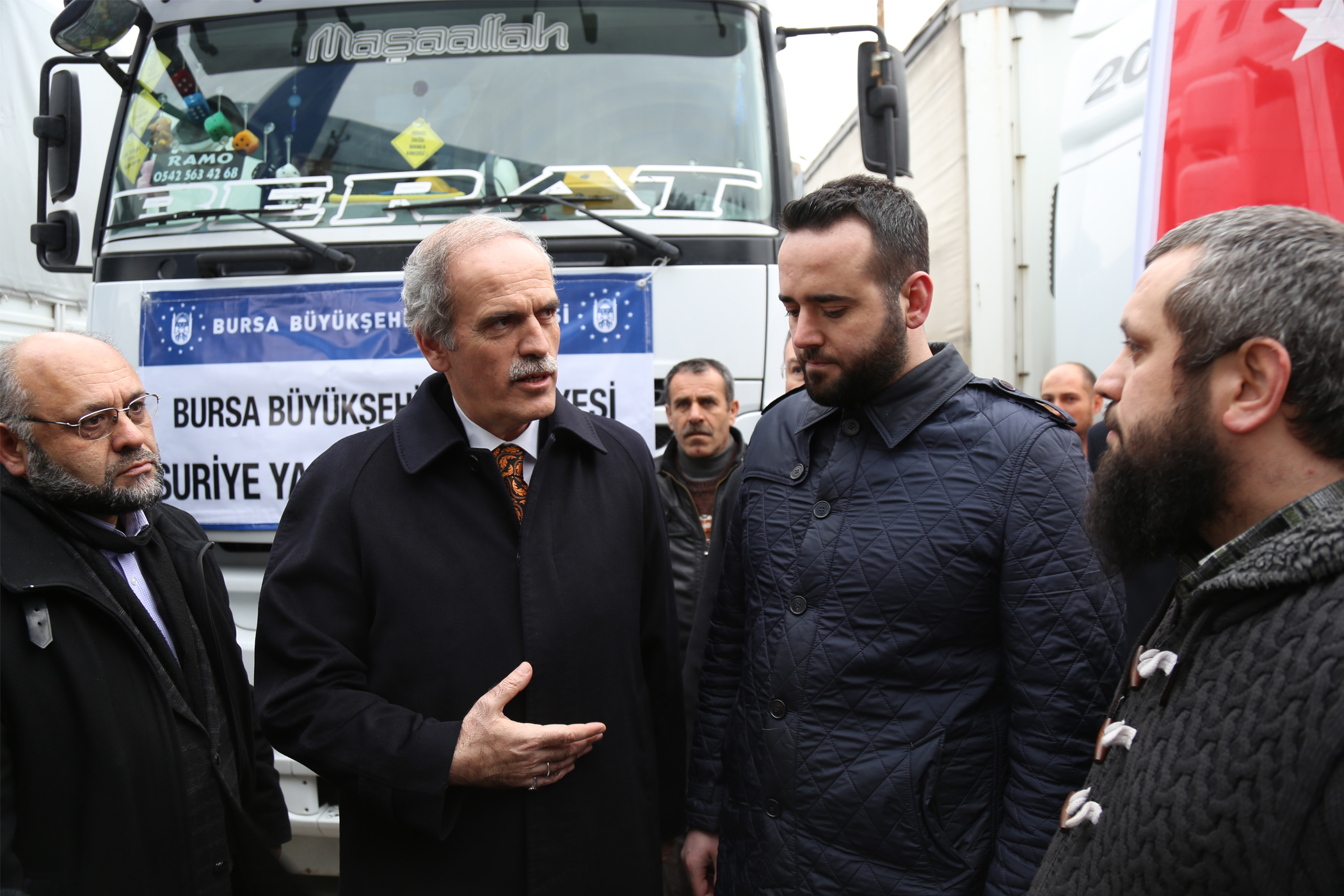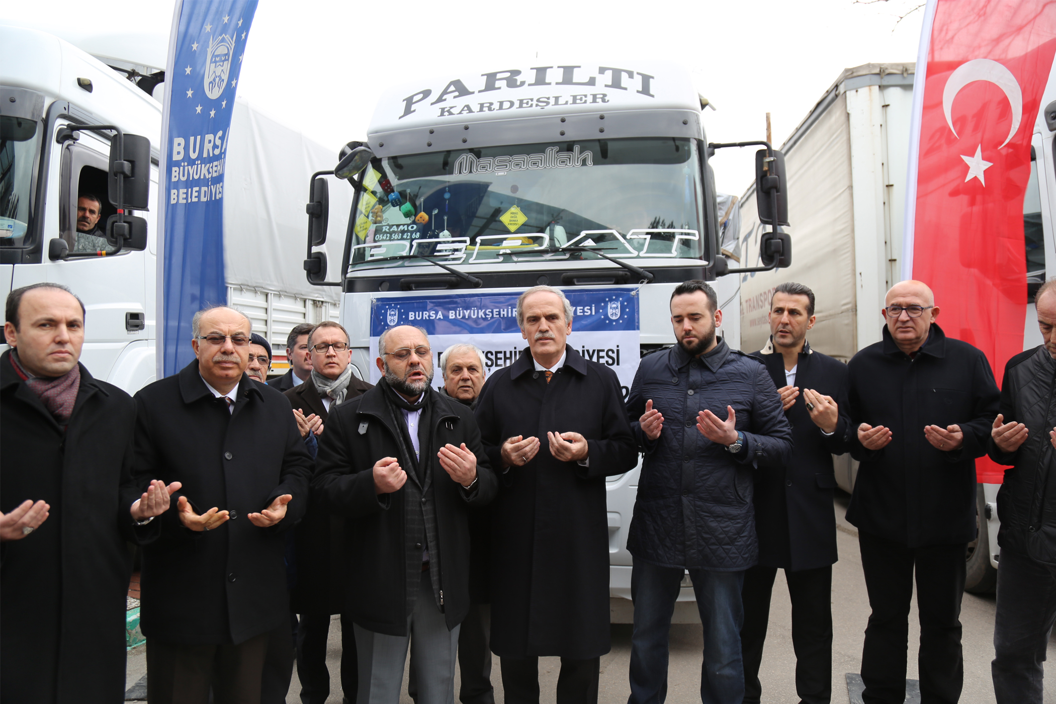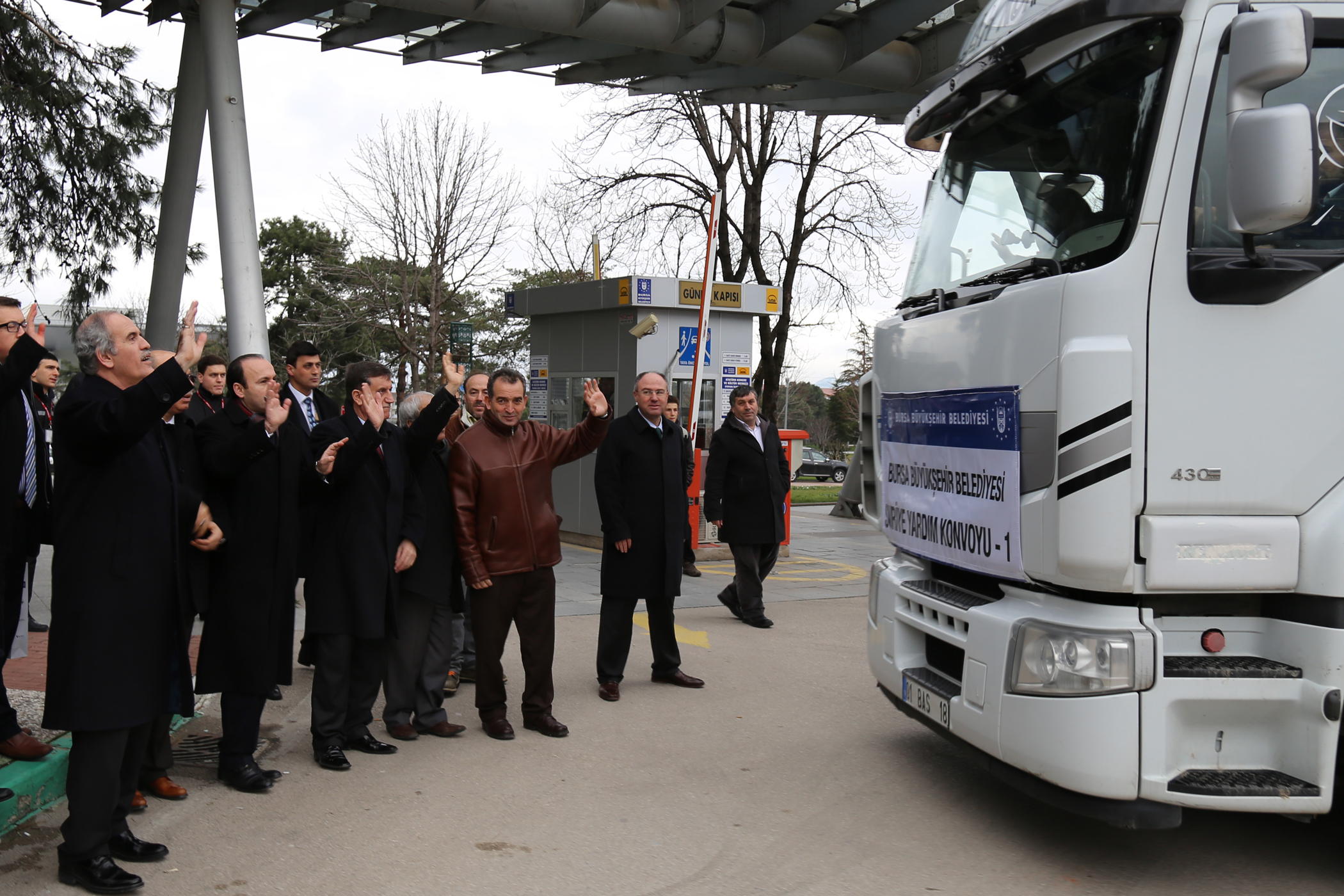 - BURSA BÜYÜKŞEHİR BELEDİYESİ VE FETİH DERNEĞİ DESTEKLERİYLE İÇİNDE SU, YAKACAK VE GIDA MALZEMESİ BULUNAN 3 TIR DÜZENLENEN TÖRENLE SURİYE’YE GÖNDERİLDİ.