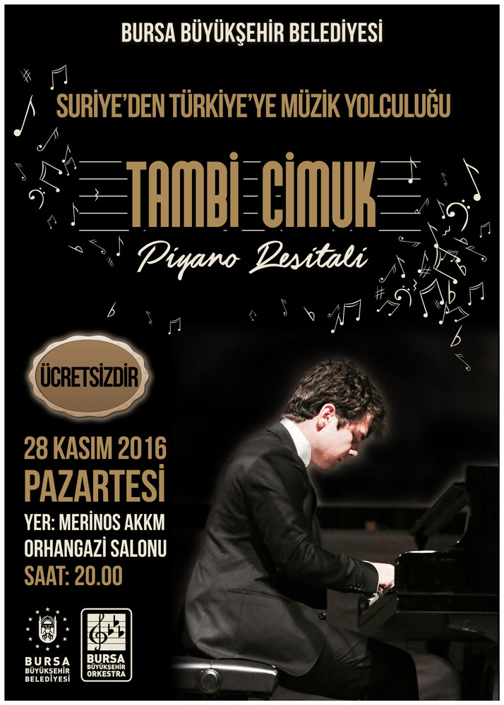 BURSA – Bursa Büyükşehir Belediyesi Orkestrası tarafından düzenlenecek konserde, Suriye’den Türkiye’ye gelerek müzikal yeteneğiyle dikkatleri çeken Tambi Cimuk, ‘Piyano Resitali’ ile Bursalı sanatseverlerle buluşacak.