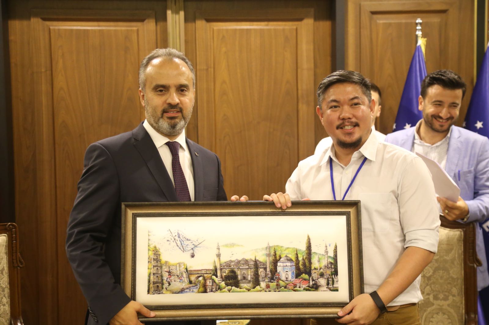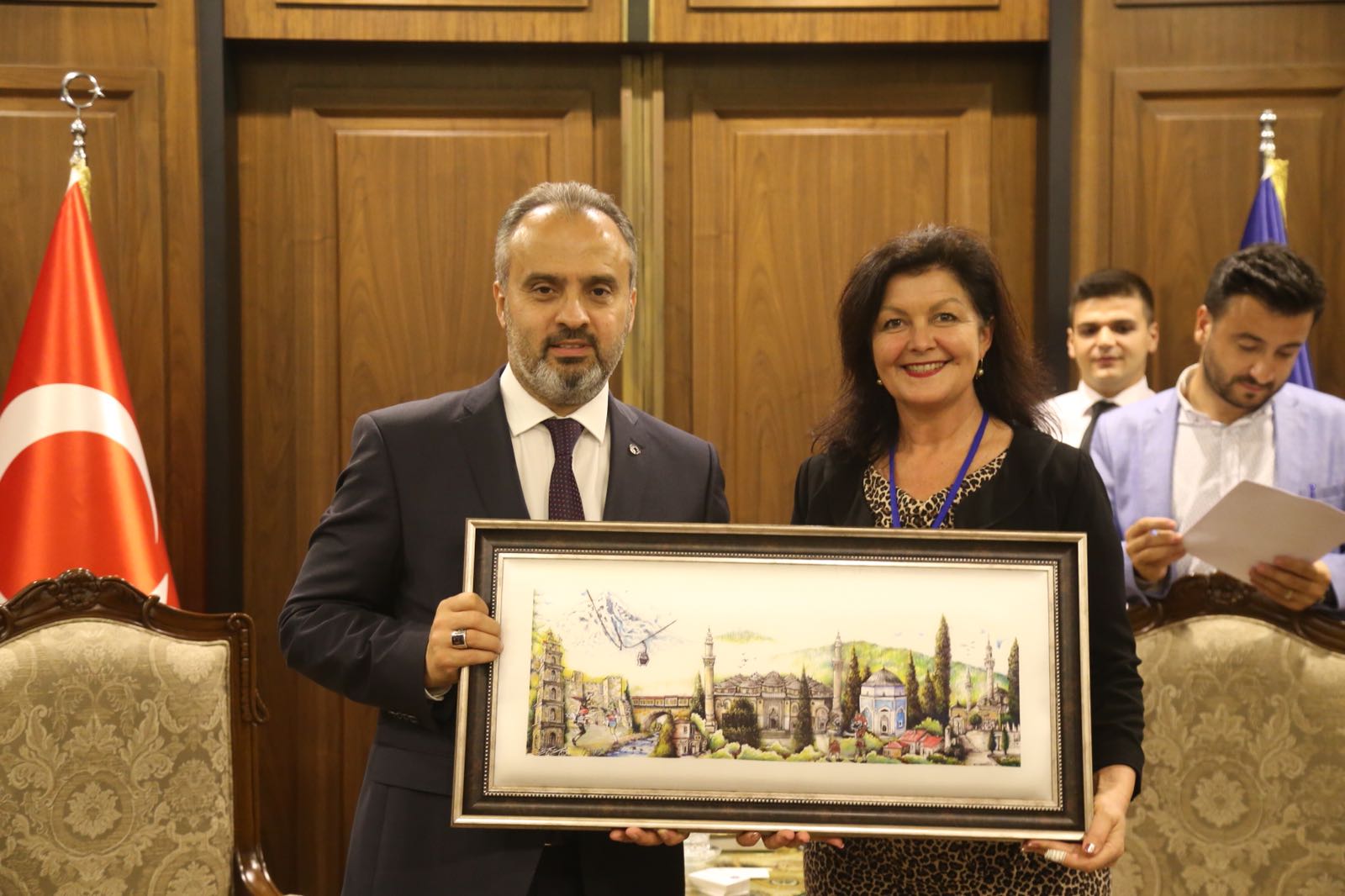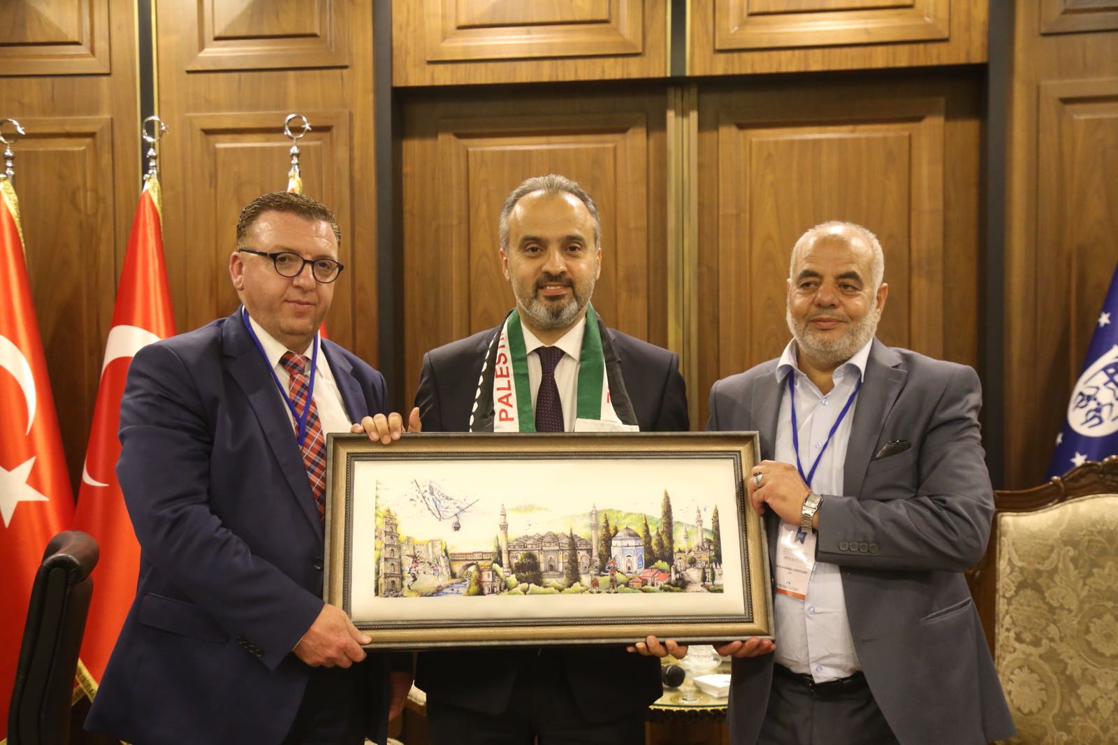 Dünya Tarihi Kentler Birliği'nin 16. konferansına ev sahipliği yapan Bursa, 21 ülkeden 40 tarihi şehrin başkan ve yöneticilerinin ağırlamaya devam ediyor. Bursa Büyükşehir Belediye Başkanı Alinur Aktaş, dünyanın farklı yerlerinden Bursa'ya gelen konuklarını makamında ağırladı. Samimi bir ortamda yapılan ziyarette, konuklara Bursa'ya özgü damak tatları ikram edildi.