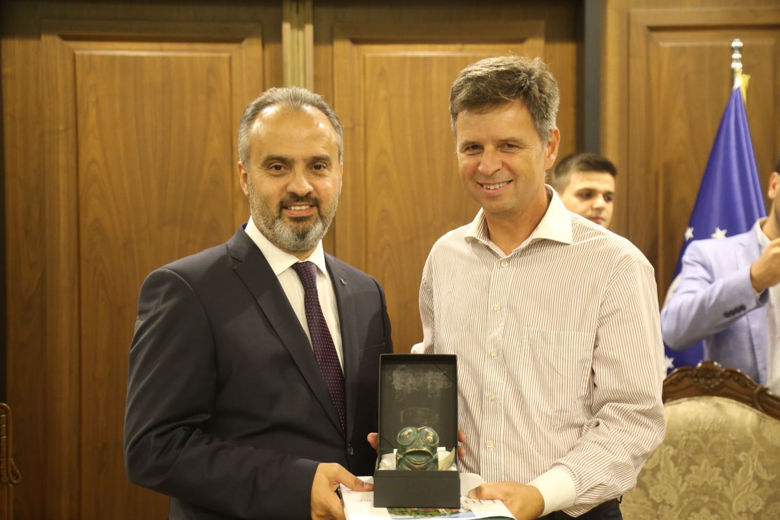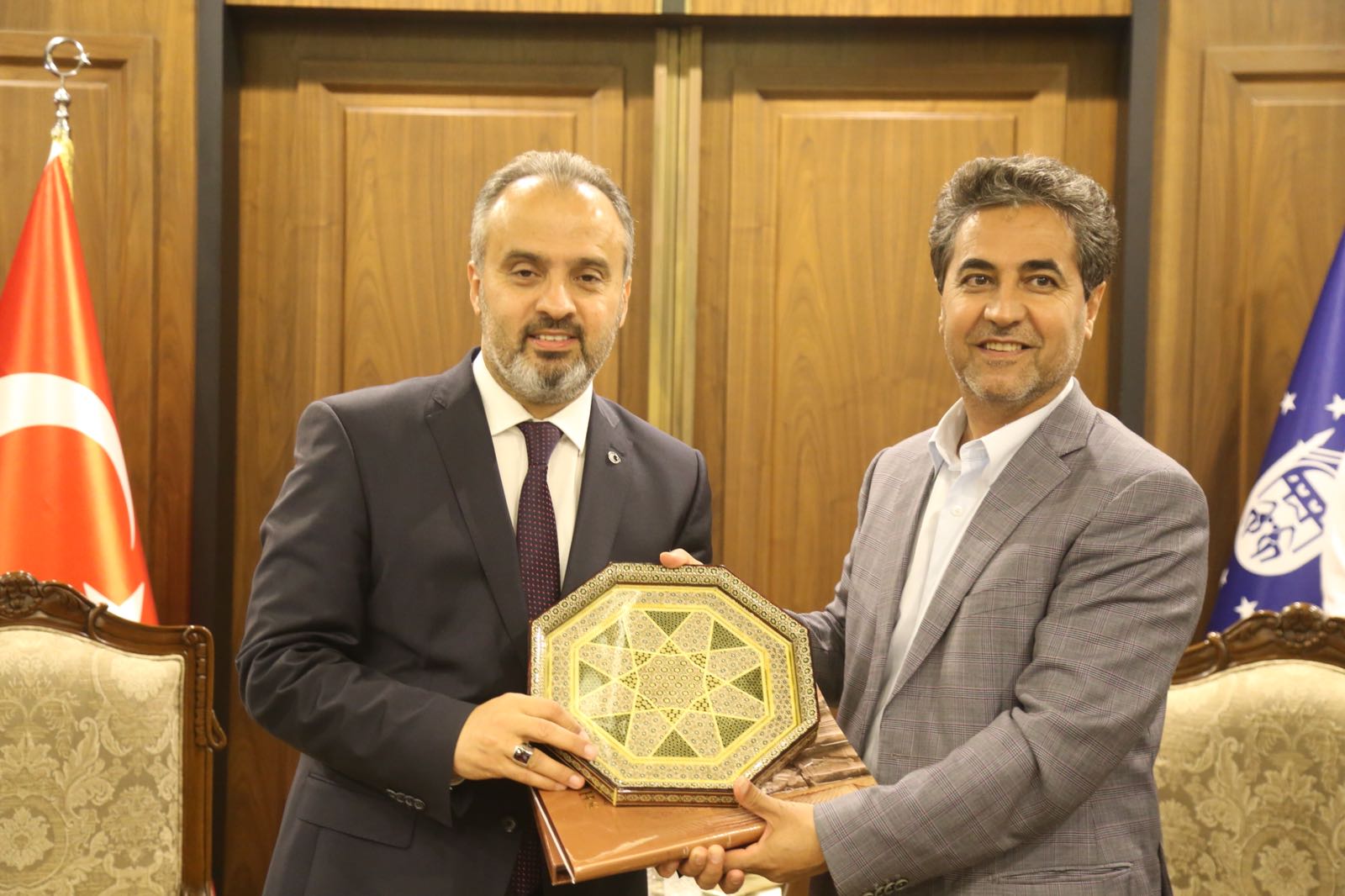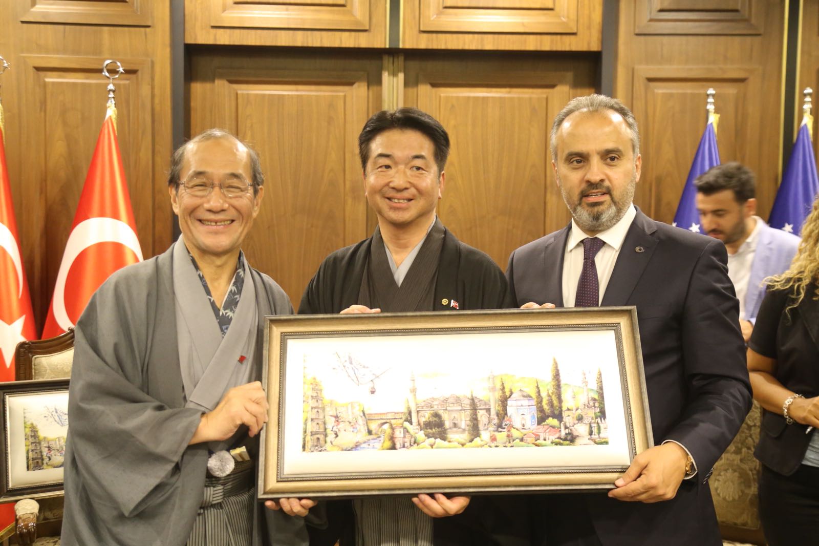 Dünya Tarihi Kentler Birliği'nin 16. konferansına ev sahipliği yapan Bursa, 21 ülkeden 40 tarihi şehrin başkan ve yöneticilerinin ağırlamaya devam ediyor. Bursa Büyükşehir Belediye Başkanı Alinur Aktaş, dünyanın farklı yerlerinden Bursa'ya gelen konuklarını makamında ağırladı. Samimi bir ortamda yapılan ziyarette, konuklara Bursa'ya özgü damak tatları ikram edildi.