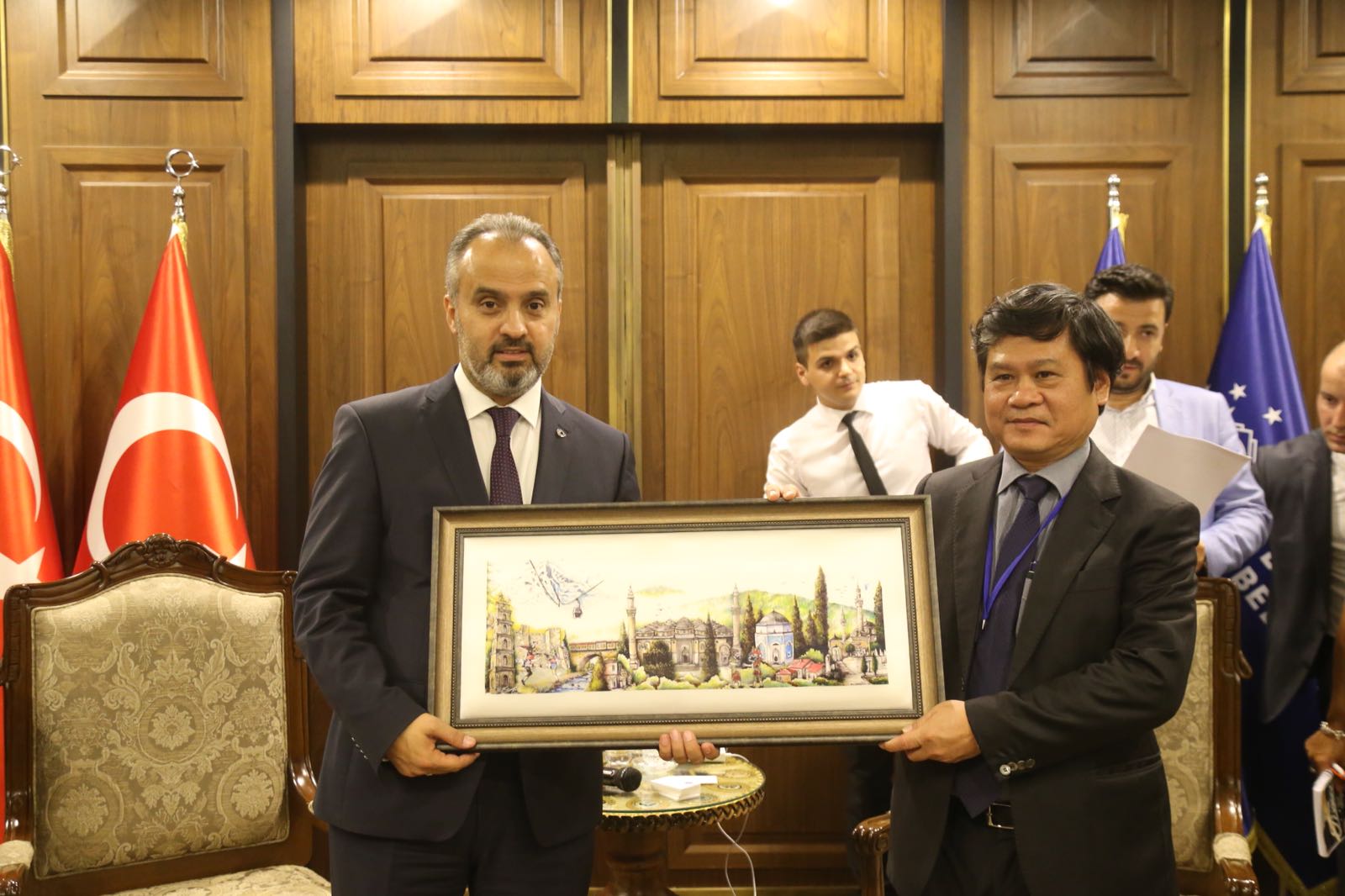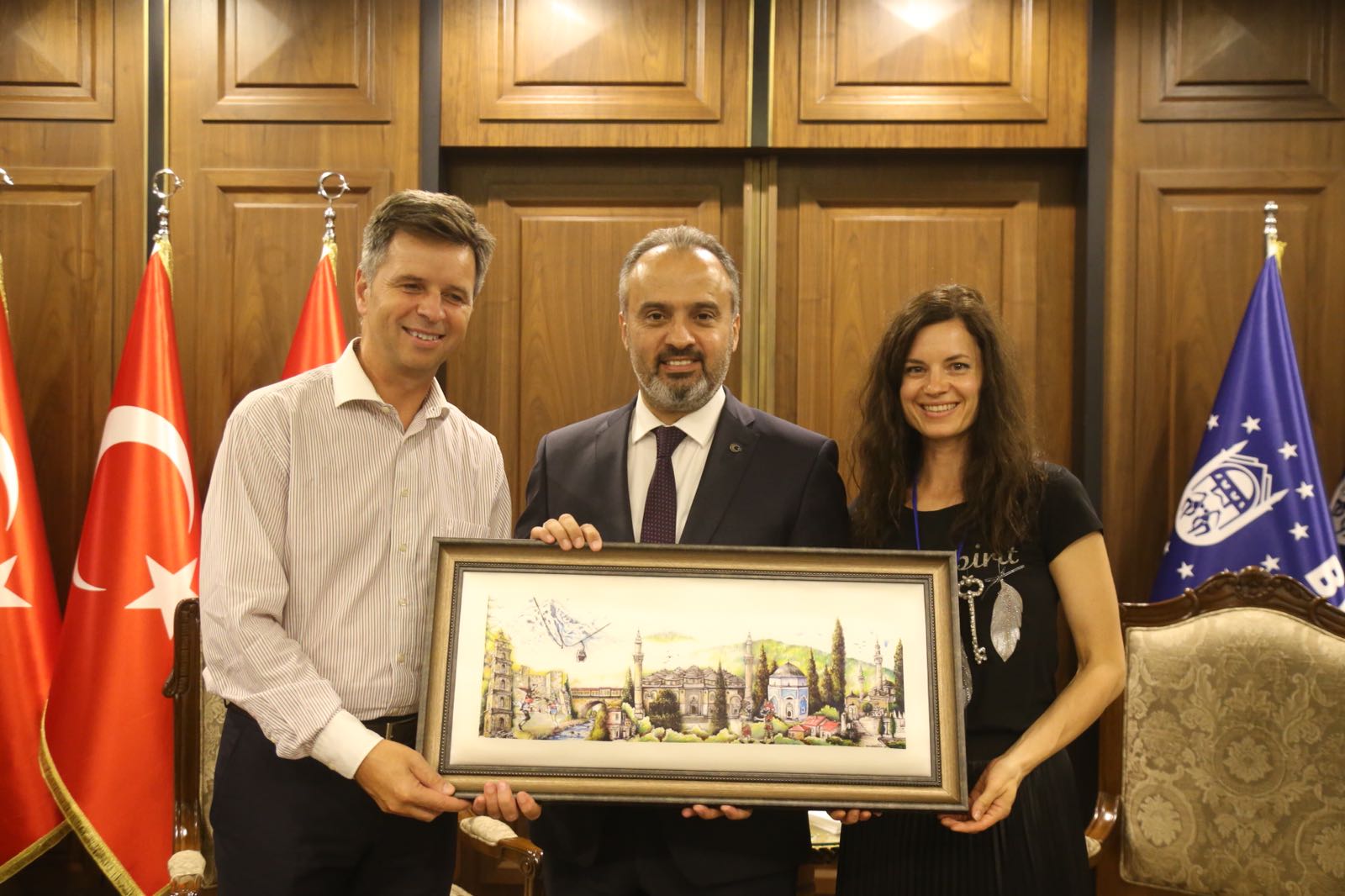 Konuklara Bursa hakkında da bilgi veren Başkan Aktaş, 3 milyon nüfusa sahip Bursa'nın ağırlıklı otomotiv ve tekstil olmak üzere tarih, kültür, tarım, turizm ve termal şehri olduğunu dile getirdi.