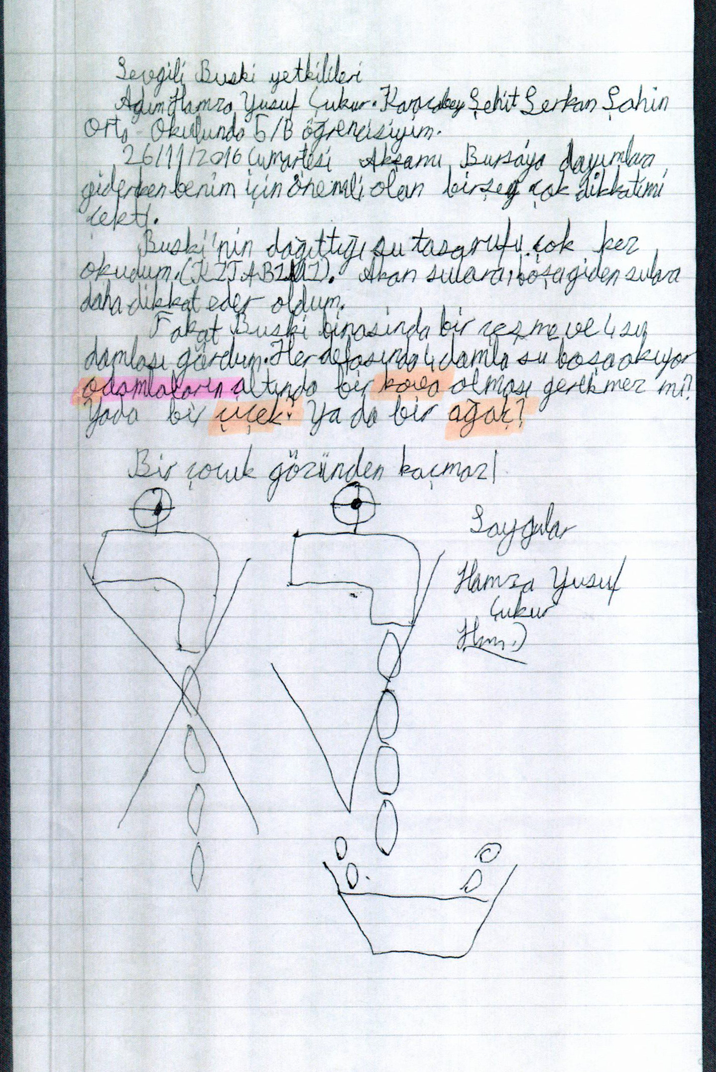 Mektubunda, BUSKİ binasının Mudanya Yolu yönüne bakan yan duvarında yer alan çeşme figüründen damlayan dört su damlasının boşa akıp gittiğini, su damlacıklarının altına konulacak kovayla su tasarrufunun sağlanmış olacağını belirten Hamza mektubu, BUSKİ Genel Müdürlüğü’nü harekete geçirdi. Hamza’nın mektubu sonrası, su damlacıklarının altına kova figürü yerleştirilerek, su damlacıklarının boşa akıp gitmesinin de önüne geçildi. Hamza’nın duyarlılığından duyduğu memnuniyeti, okul müdür yardımcısı ve ailesiyle birlikte BUSKİ’ye davet ederek gösteren BUSKİ Genel Müdürü İsmail Hakkı Çetinavcı, Hamza’ya teşekkür etti.