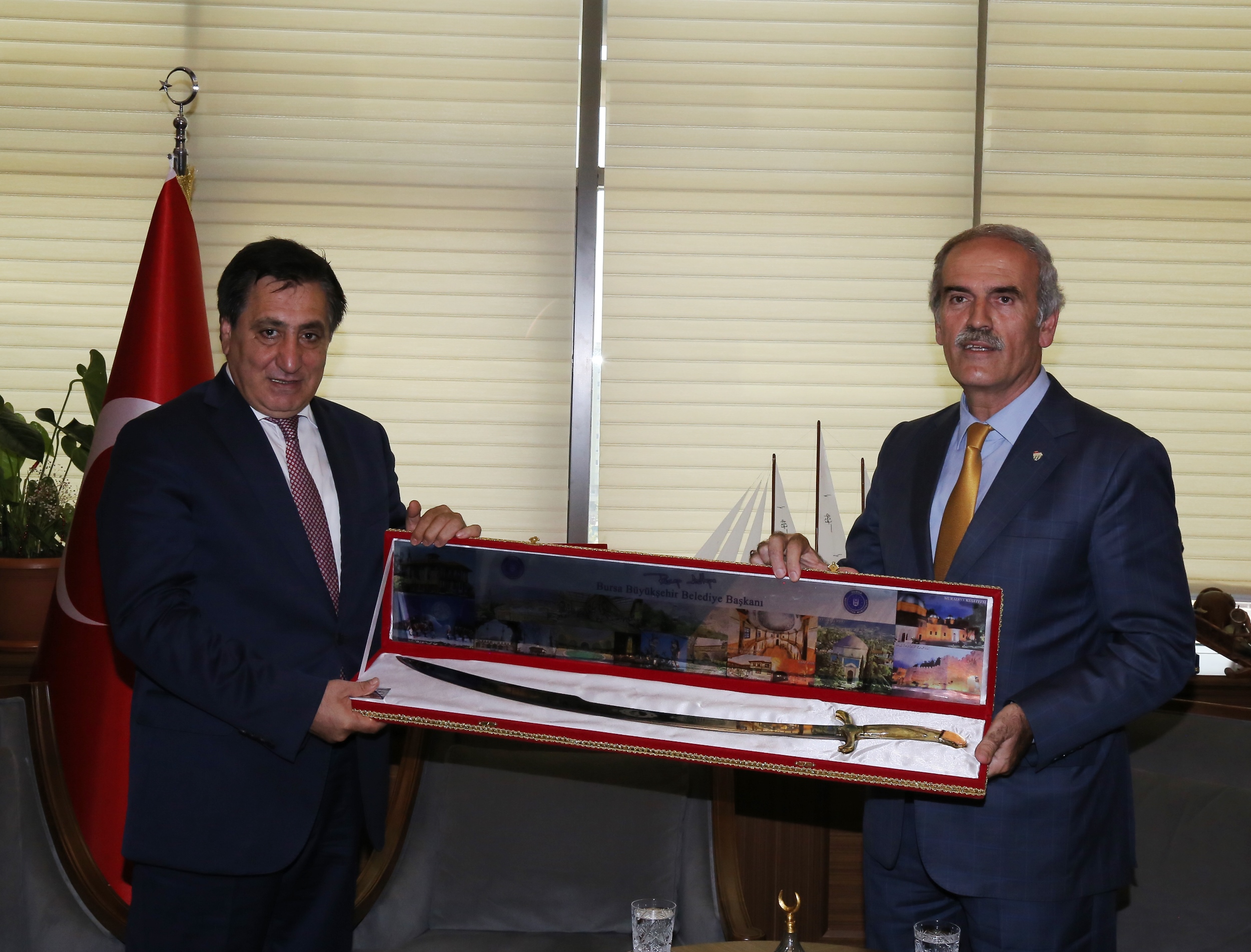 Büyükşehir Belediyesi bürokratlarının da hazır bulunduğu ziyarette Başkan Altepe, Vali Küçük’e el yapımı kılıç hediye etti.