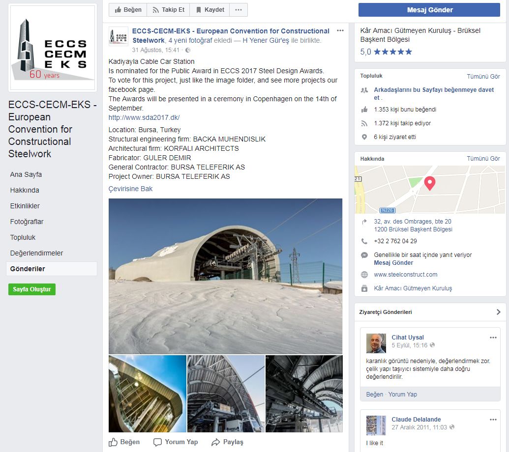 Avrupa Yapısal Çelik Birliği’nin (ECCS) gerçekleştirdiği Avrupa Çelik Yapı Tasarım Ödülleri´nde Türkiye´yi temsil edecek üç proje de Robert College Murat Karamancı Student Center, Vodafone Arena ve Bursa Kadıyayla Teleferik İstasyonu projesi oldu. Birincinin sosyal medya üzerinden halk oylaması ile belirleneceği yarışmada facebook üzerinden oy kullanma işlemleri 14 Eylül ‘e kadar devam edecek. Avrupa genelindeki birçok seçkin projenin katıldığı yarışmada Bursa’ya destekleyenler oylarını https://www.facebook.com/permalink.php?story_fbid=1434405193310340&id=118940171523522 adresine girerek kullanabilecekler.
