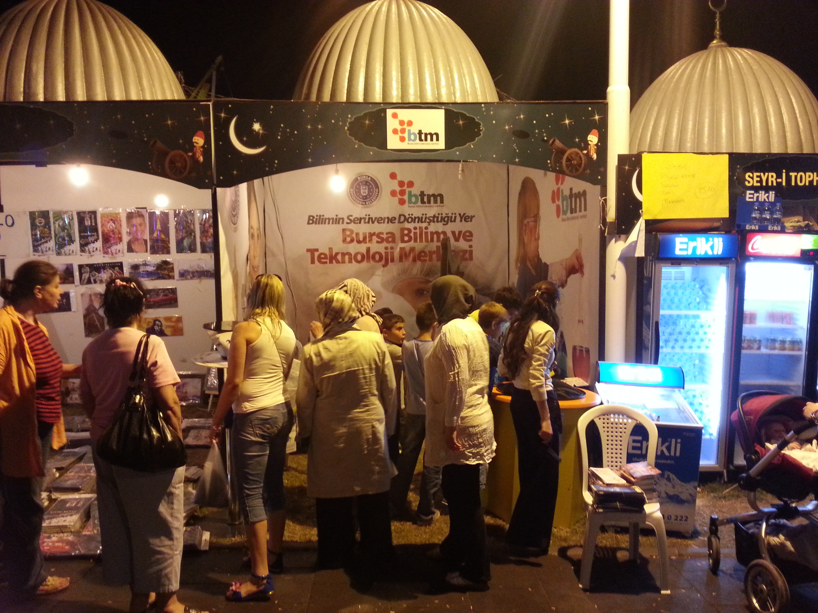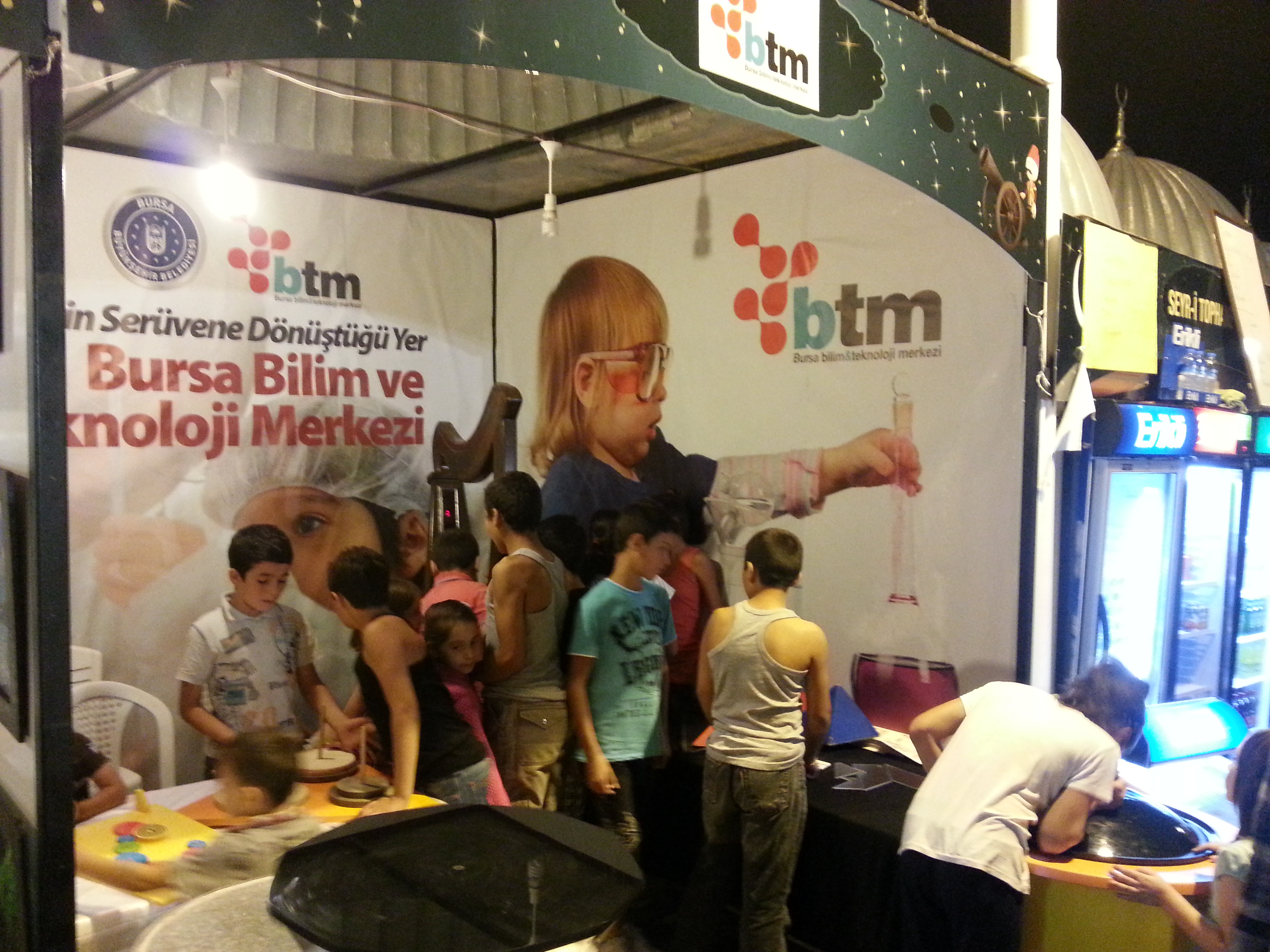 Büyükşehir Belediyesi’nin geleneksel hale getirdiği Merinos Park’taki Temaşa-i Ramazan etkinlikleri, binlerce vatandaşa her akşamı ayrı bir coşku içinde geçirme imkanı sağlarken, BTM’nin alana kurduğu stant etkinlikleri farklı bir boyuta taşıdı. BTM standı ziyaretçilerine bilimsel çalışmalar ve etkinliklere katılma imkanı sağlıyor. Stantta yer alan birbirinden ilgi çekici düzenek ve matematik oyunları ziyaretçilerin beğenisini toplamaya ve bilim merakını arttırmaya devam ediyor.