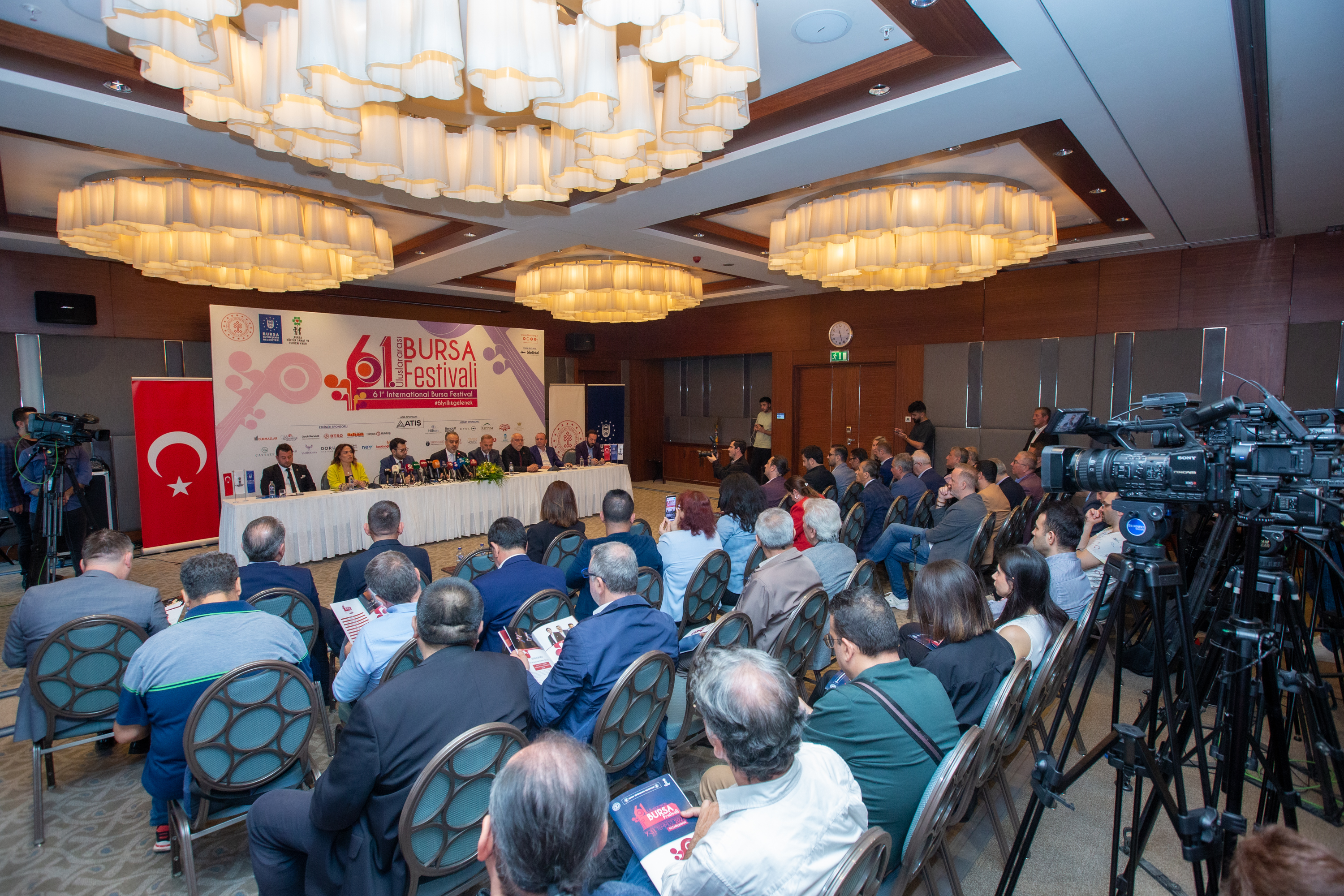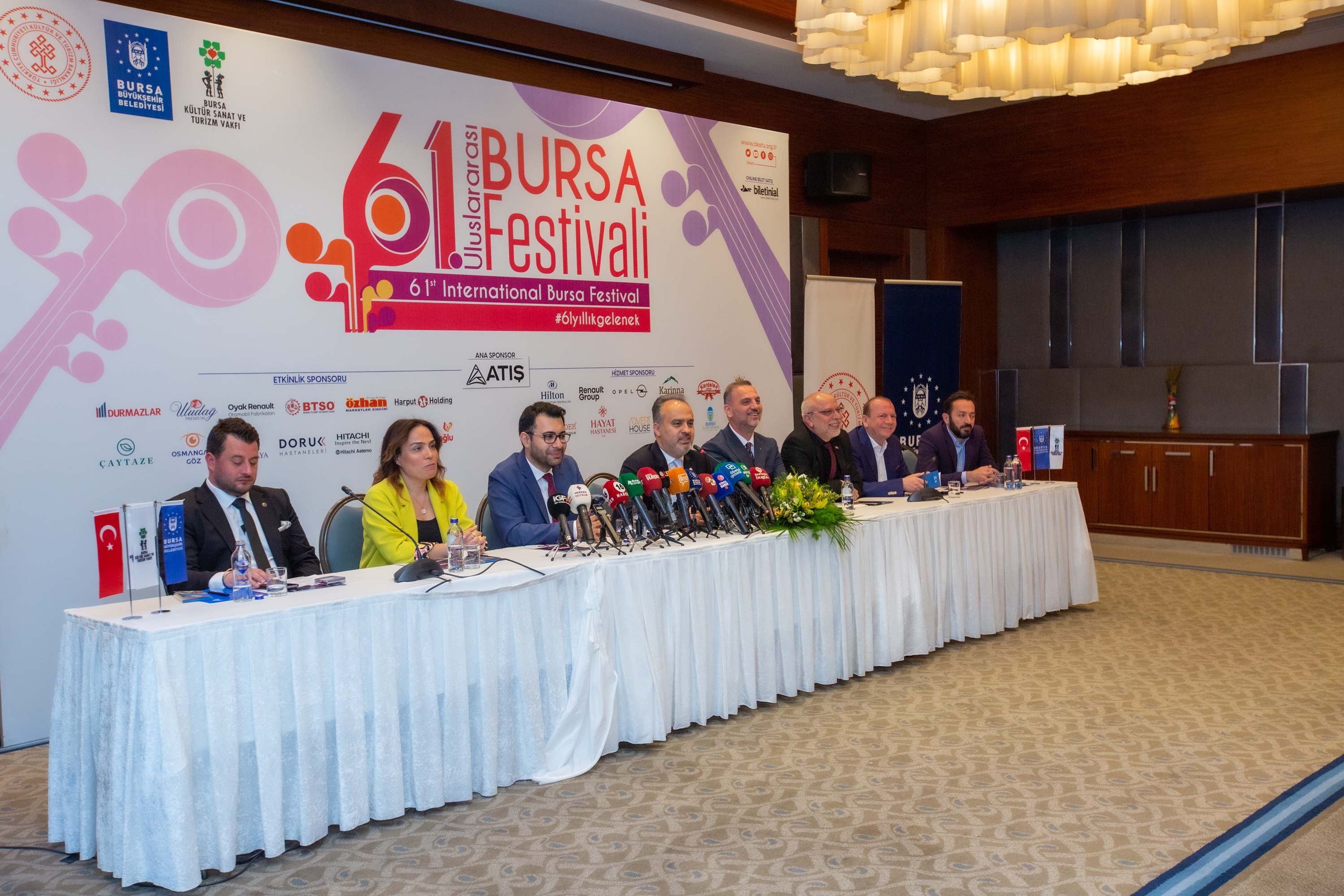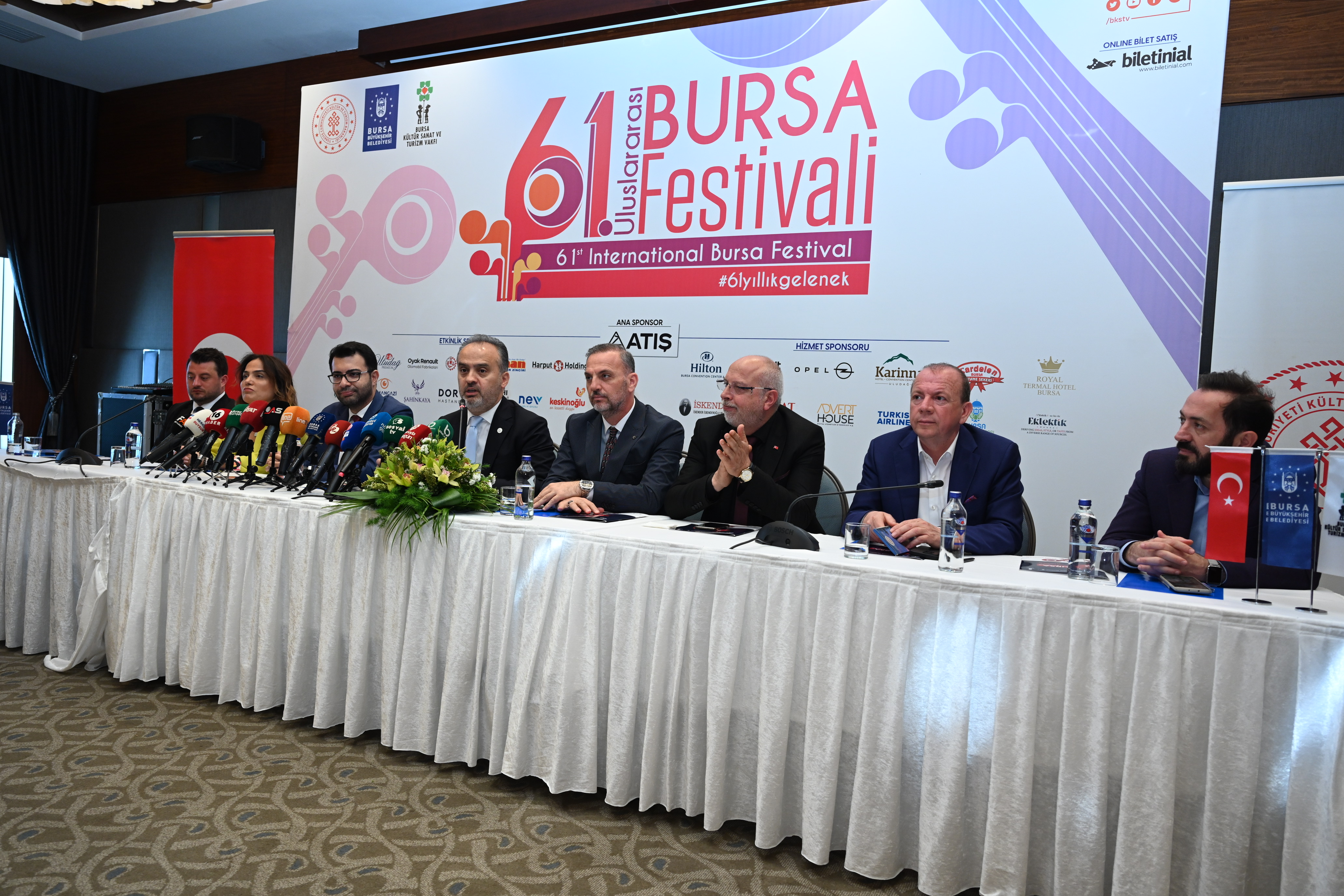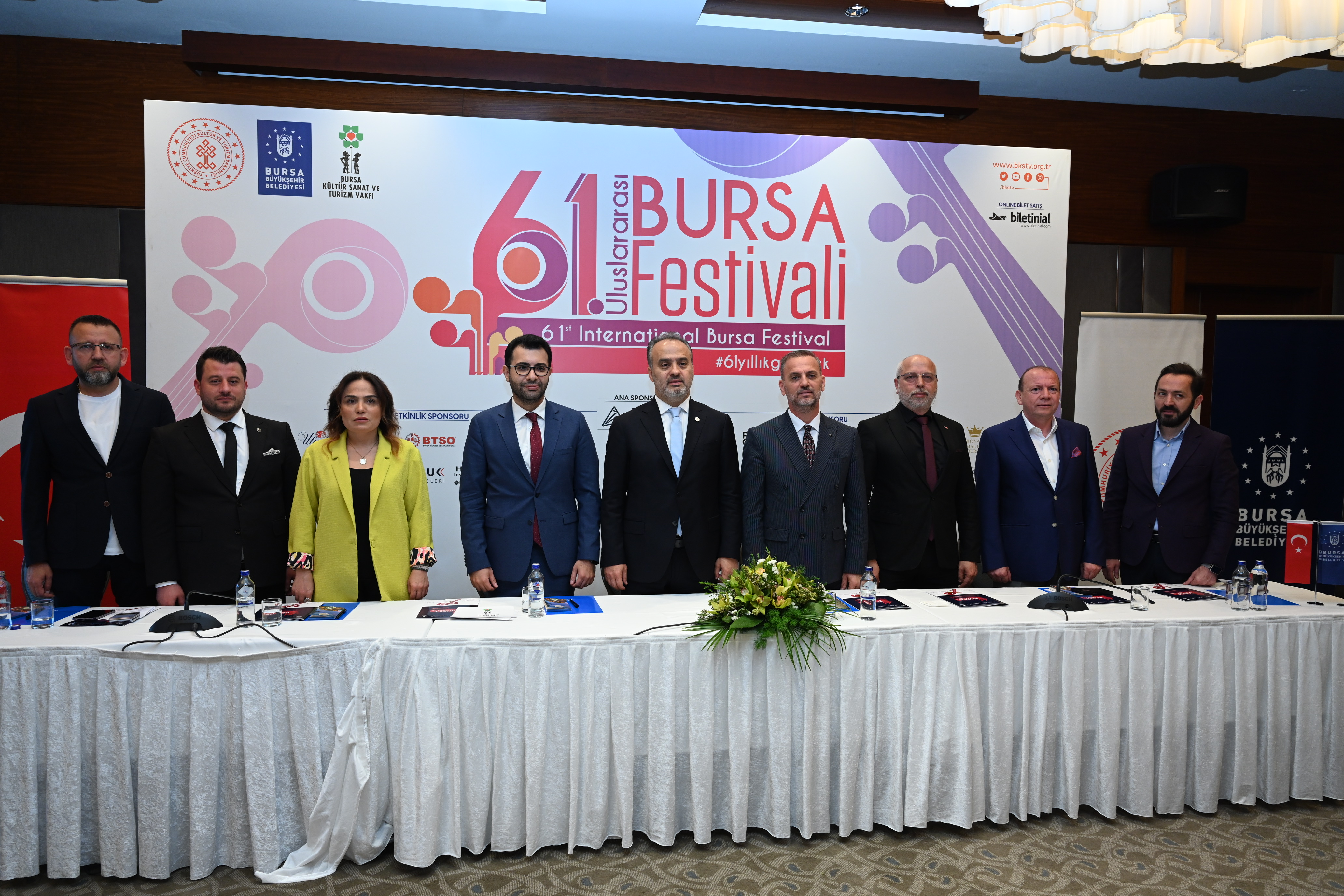 Bursa Büyükşehir Belediyesi adına Bursa Kültür Sanat ve Turizm Vakfı (BKSTV) tarafından düzenlenen, Kültür ve Turizm Bakanlığı tarafından da desteklenen 61’inci ‘Uluslararası Bursa Festivali’nin tanıtım toplantısı, Hilton Otel’de yapıldı. Festivalin tanıtım toplantısına Bursa Büyükşehir Belediye Başkanı Alinur Aktaş, BKSTV Başkanı Sadi Etkeser, BKSTV Yönetim Kurulu, sponsor firmaların temsilcileri ve basın mensupları katıldı.