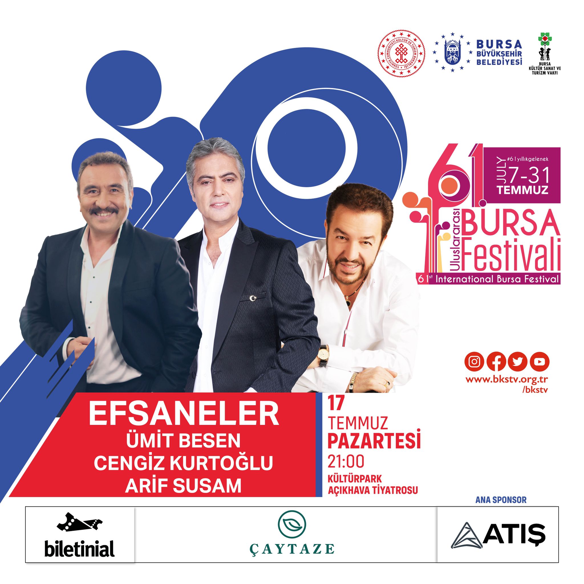 Festival programını kamuoyu ile paylaşan Başkan Aktaş, bu yıl da dolu dolu bir festivalin Bursalıları beklediğini belirterek, tüm müzikseverleri festivale davet etti. Festivalin ana sponsoru Atış Şirketler Grubu ile Uluslararası Altın Karagöz Halk Dansları Yarışması’nın ana sponsoru Durmazlar’a teşekkür eden Başkan Aktaş, “Katkılarıyla, vatandaşlarımızın piyasa şartlarından yarı yarıya hatta daha da ucuz bir şekilde eğlenmelerine destek olan, Kültür ve Turizm Bakanlığı’na, Uludağ Premium, Oyak Renault, Harput Holging, Keskinoğlu, Şahinkaya Okulları, Bursa Ticaret ve Sanayi Odası, Özhan Marketler, Çaytaze, Royal Termal Hotel, Opel-Nescar, Hitachi Astemo, Nev Hastaneleri, Hilton, Türk Hava Yolları, ZeplinX, Parkur AVM, Sur Yapı AVM, Medya16 ve katkı sağlayan diğer sponsorlarımıza ayrı ayrı teşekkür ederim. Festivalin bugünlere ulaşmasını sağlayan Bursa’nın önceki dönemlerdeki belediye başkanlarına, BKSTV’nin yöneticilerine ve çalışanlarına, destek veren firmalara ve ayrıca vakfımızın Onursal Başkanı Fatma Durmaz Hanımefendiye de şükranlarımı sunuyorum. En büyük teşekkürüm de değerli sanatseverlere. Bu festivale sahip çıkıp, Açık Hava Tiyatrosu’nu doldurdukları için” diye konuştu.