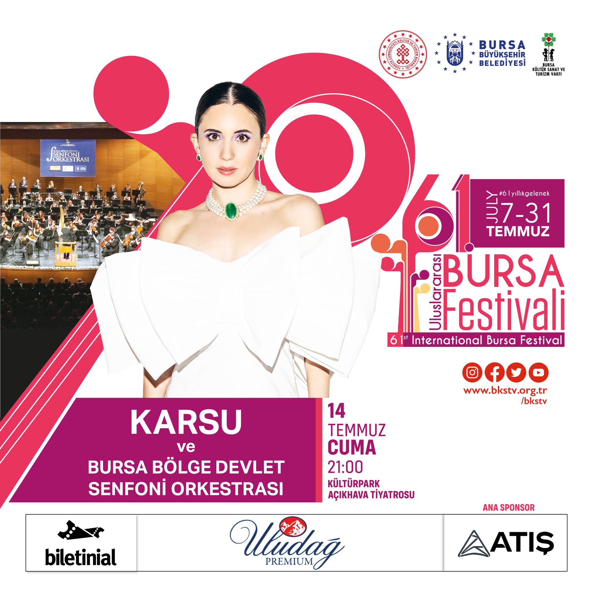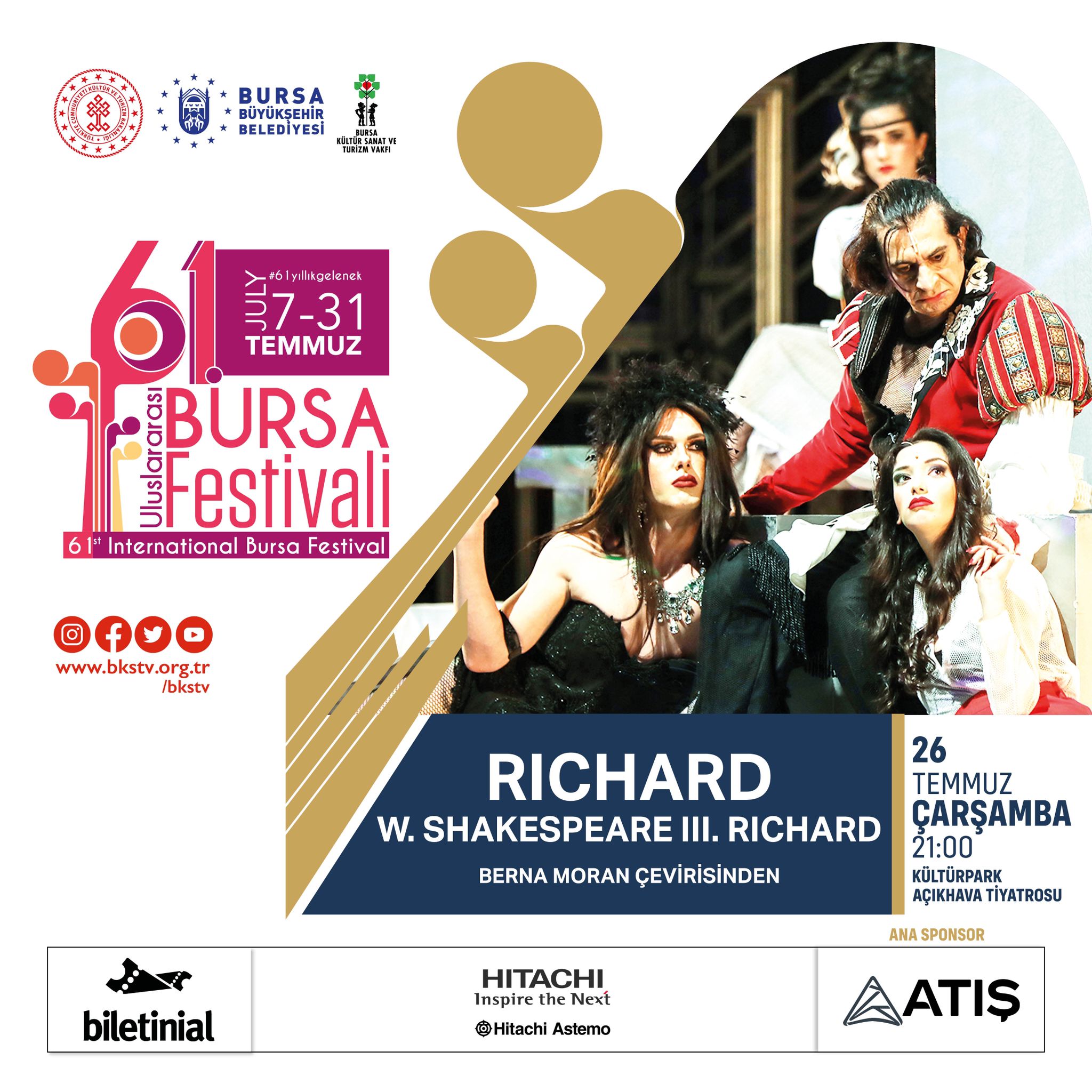 Uluslararası Altın Karagöz Halk Dansları Yarışması’nın ardından 14 Temmuz’da Bursa Bölge Devlet Senfoni Orkestrası’nın Karsu ile yapacağı performansla Açık Hava Tiyatrosu’ndaki konsere start verilecek. Bursalılar, festival süresince dünyaca ünlü Sukhishvili dans gösterisini izleyecek, efsane isimler Cengiz Kurtoğlu, Ümit Besen ve Arif Susam’ı aynı sahnede dinleme imkanı bulacak. Festival, Edis, Özcan Deniz, Muazzez Ersoy, Melike Şahin, Madrigal, Shantel ve Okan Bayülgen’in sahne aldığı Shakespeare’in ünlü trajedisinin sahnelendiği ‘’Richard’’ tiyatro oyunuyla devam edecek. Dünyanın önde gelen müzik yorumcularından UNESCO müzik ödülü sahibi Azerbaycanlı ses sanatçısı Alim Qasimov yine dünyaca ünlü caz müziği sanatçısı Michael Godard, Türkiye’nin klarnet sesi Hüsnü Şenlendirici’nin de eşlik edeceği muhteşem bir performansla aynı sahneyi paylaşacaklar. Ayrıca Cumhuriyet’in 100’üncü kuruluş yıldönümü nedeniyle Bursa Büyükşehir Belediyesi Orkestrası, Dilek Türkan ve Hüseyin Turan ile birlikte özel bir konser verecek. Festivalin finalinde ise Türk pop müziğinin en iyi kadın yorumcularından Yıldız Tilbe sahne alacak.
