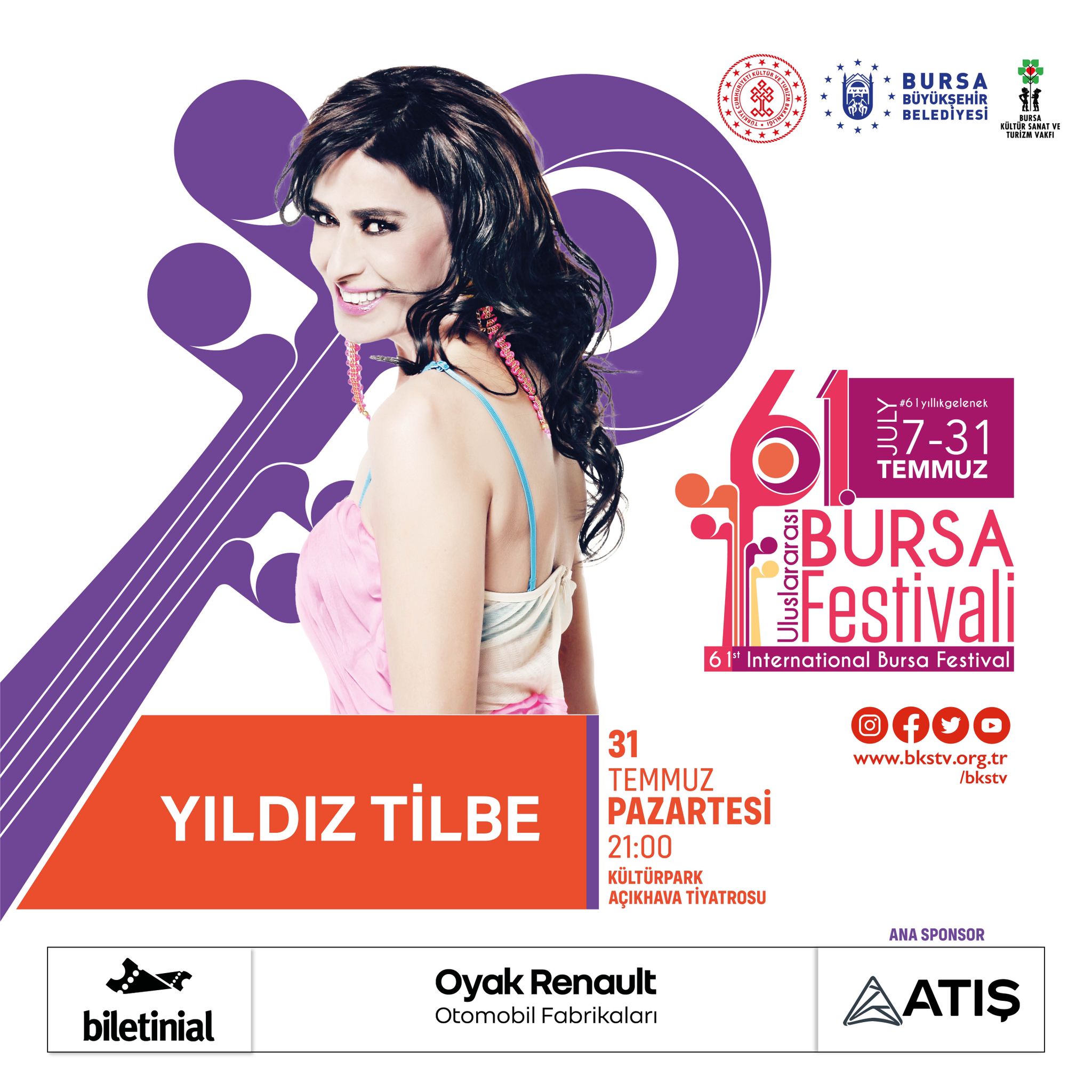 BURSA - Türkiye’nin en uzun soluklu etkinliği Uluslararası Bursa Festivali’nin 61’incisi, 07–31 Temmuz tarihleri arasında birbirinden ünlü sanatçı ve grupların katılımıyla gerçekleştirilecek. Festival, 22 ülkeden konuk dansçıların katılacağı 35’inci Altın Karagöz Halk Dansları Yarışması ile 07 Temmuz’da başlayacak ve 31 Temmuz’da Yıldız Tilbe konseri ile sona erecek.