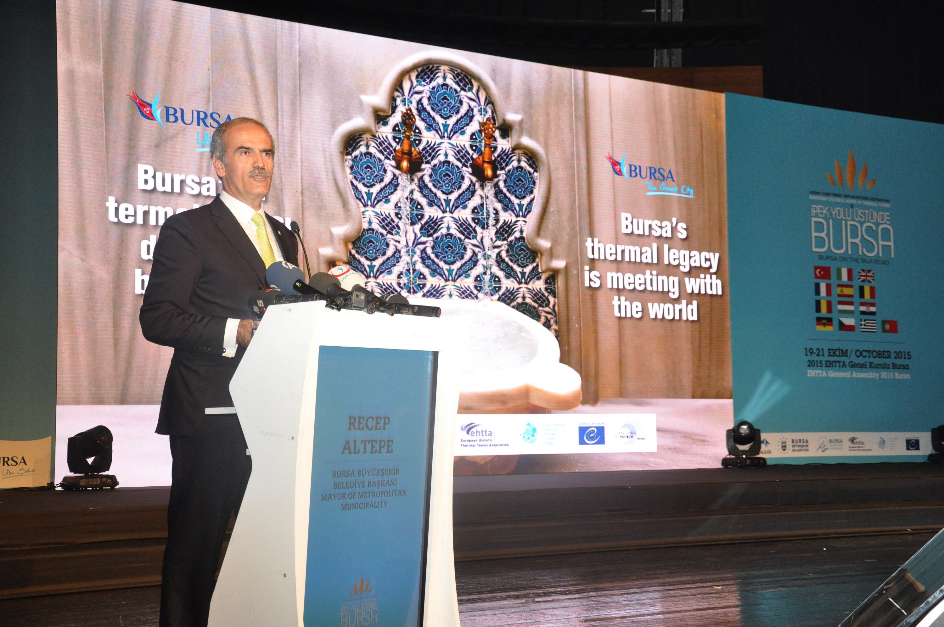 Büyükşehir Belediye Başkanı Recep Altepe ise, tarihi ve kültürel birikimiyle tüm zamanların en güzel şehri Bursa’nın EHTTA genel kuruluna ev sahipliği yapmasının önemine değindi. İpek Yolu ve Baharat Yolu üzerinde bulunan Bursa’nın tarihin her döneminde önemli şehir olduğunu anlatan Altepe, tarım, tarih, sanayi, turizm şehri olan Bursa’nın birçok konuda öncü olduğunu ifade etti. 1970’li senelerde sanayi kuruluşlarının faaliyete geçmesi sonucunda Bursa’nın hızla büyüdüğünü, nüfusunun senede 50 bin arttığını, bunun yanında ise termal özelliğinin geri planda kaldığını dile getiren Altepe, “Zaman geçtikçe bu durum bizi rahatsız etti. Bursa’nın her alanda gelişmesi gerekir. Termal suları zengin olan Bursa’da kaplıcaların ön plana çıkması için Valiliğimizle birlikte çalışıyoruz. 50 konaklama tesisine şifalı suları ulaştırdık. Tüm turizm tesisleriyle birlikte termali kullanıyoruz. Sıcak su bölgesinde kentsel dönüşüm çalışmaları başladı. Termal konusundaki birçok Avrupa şehrini gezerek incelemelerde bulunduk. Üzerinde oturduğumuz zenginliği en iyi şekilde değerlendirme istiyoruz. 17 ilçedeki tüm şifalı sularla ilgili projeler geliştiriyoruz. Bursa tekrar termal ve kaplıca şehri oluyor. Turizm konusunda da iddialı konuma geliyoruz. Sağlık Bakanımızın destekleriyle başta şehir içerisindeki bölgeleri teşvik kapsamına alan kanun çıkıyor” diye konuştu.