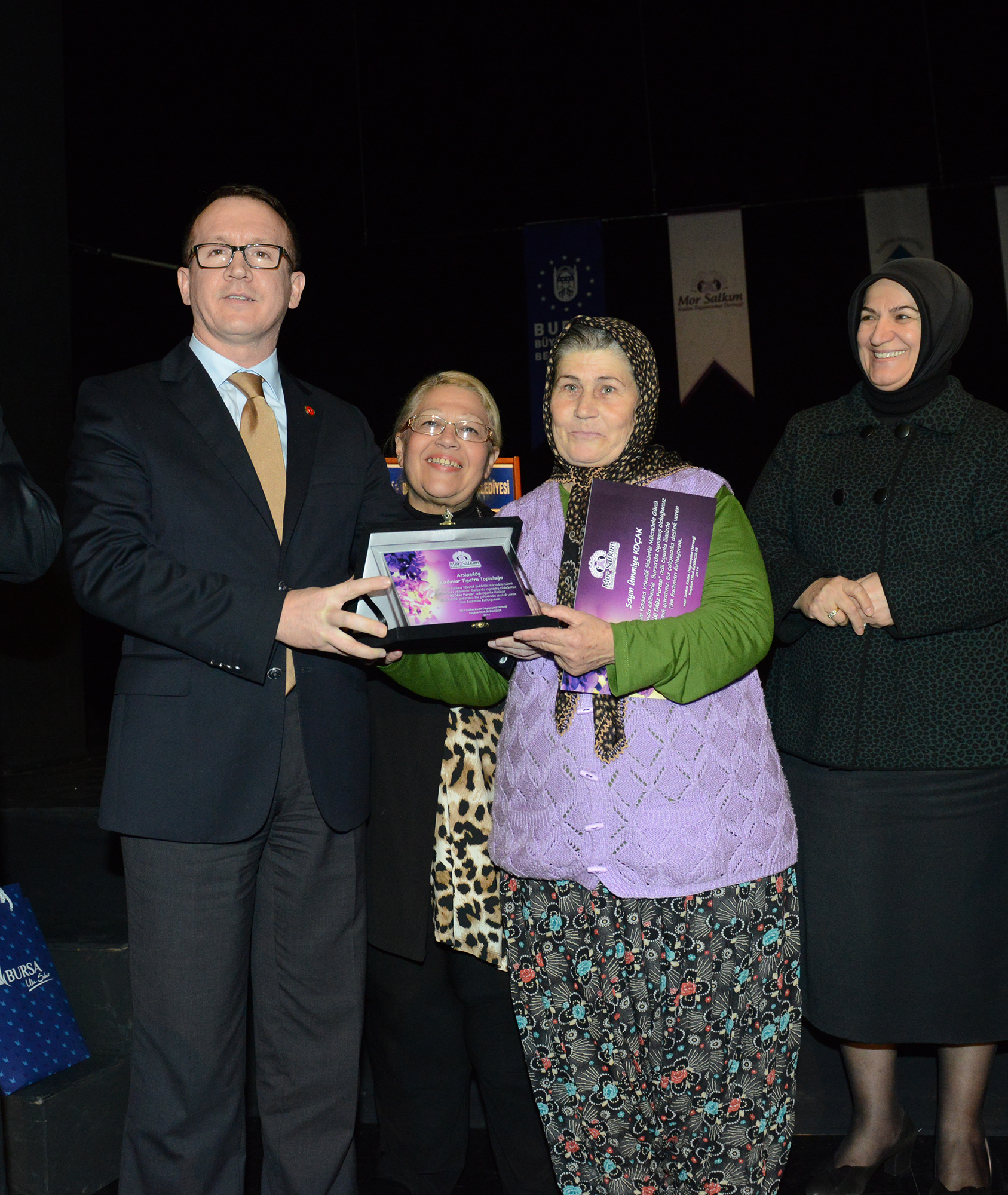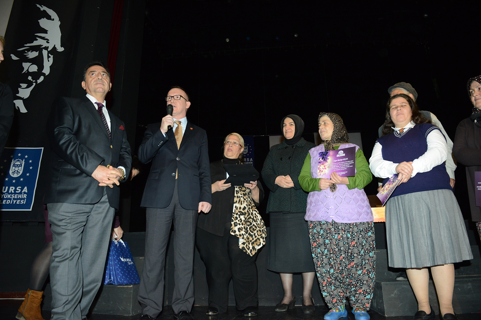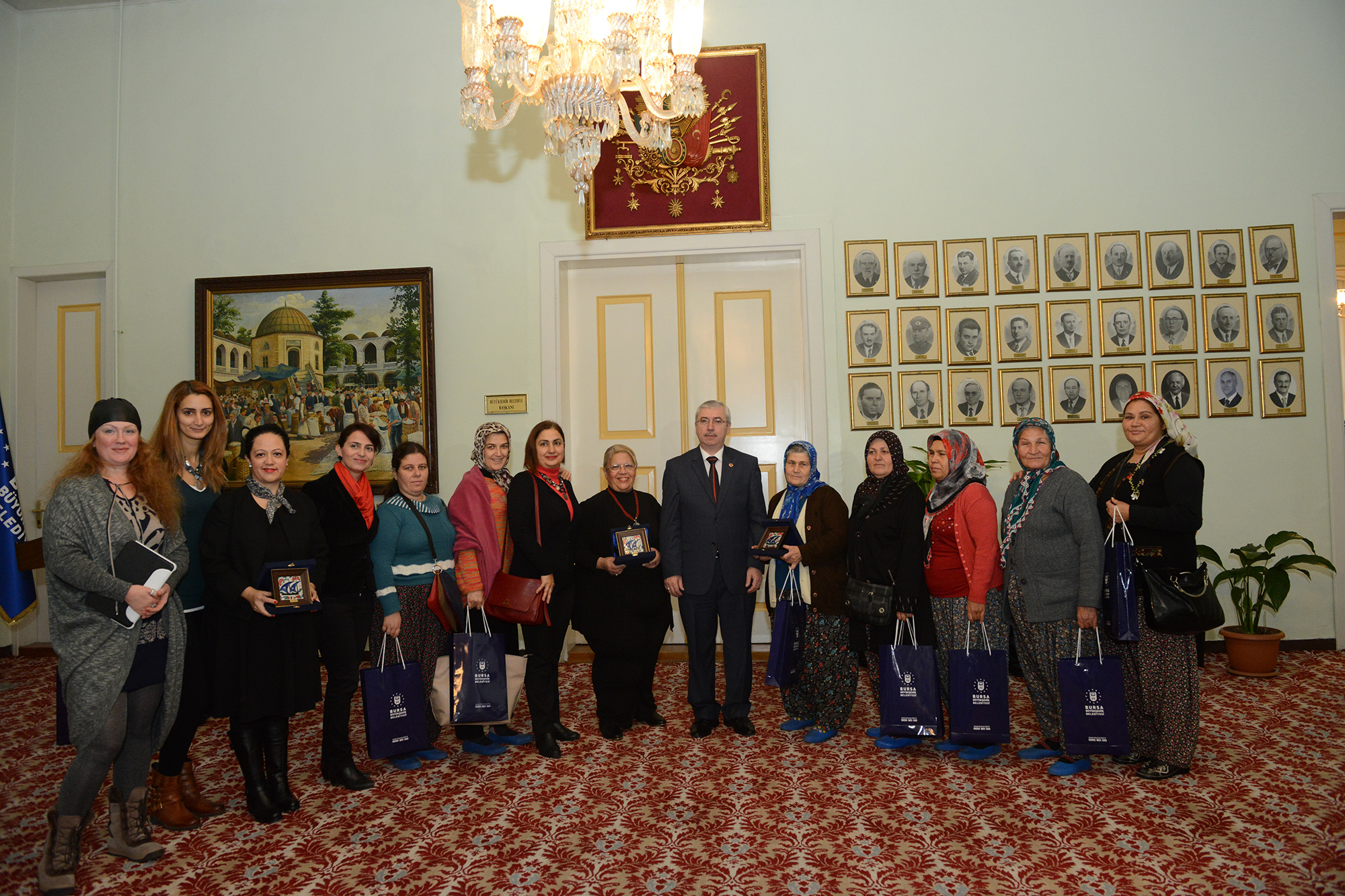 Mersin Arslanköy Kadınlar Tiyatro Topluluğu Kurucusu Ümmiye Koçak ise, kendilerini Bursa’ya davet eden ve her türlü ihtiyaçlarını karşılayan Büyükşehir Belediyesi’ne teşekkür etti. Ziyaret sonunda Başkanvekili Şükrü Köse, tiyatro ekibi kurucusu Ümmiye Koçak ile Mor Salkım Kadın Derneği Başkanı Dilek Üzümcüler’e birer çini işlemeli plaket takdim etti.
