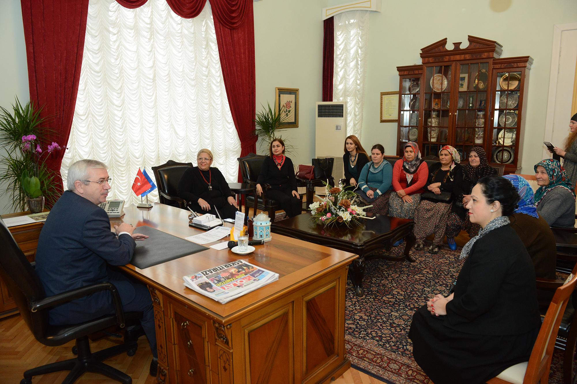 Heykel’deki tarihi başkanlık binasında gerçekleşen görüşmede, Mersinli kadınları Büyükşehir Belediye Başkanı Recep Altepe adına Başkanvekili Şükrü Köse ağırladı. Sıcak bir atmosferde gerçekleşen ziyarete; Mor Salkım Kadın Derneği Başkanı Dilek Üzümcüler, Başkan Yardımcısı Susan Kümbi, Birleşmiş Milletler Kadın Dostu Kentler Program Koordinatörü Burcu Üzümcüler, Mersin Arslanköy Kadınlar Tiyatro Topluluğu Kurucusu Ümmiye Koçak ve kadın tiyatrocular katıldı.