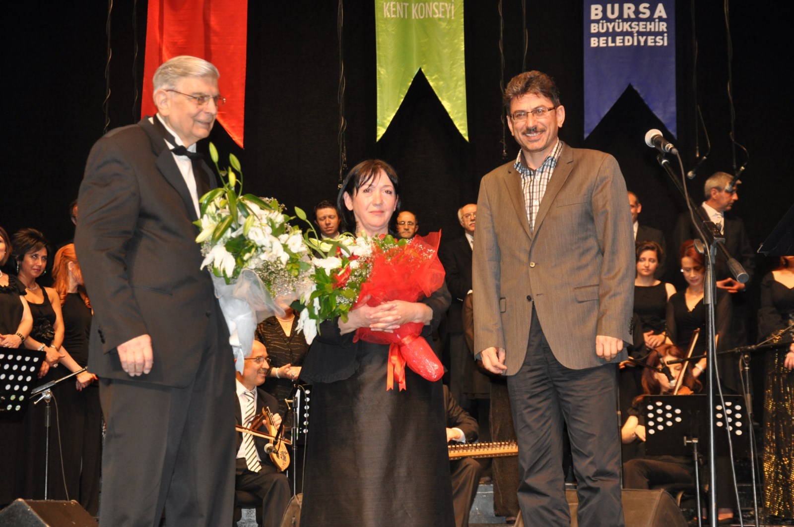 Konserinde sonunda Bursa Kent Konseyi Başkan Yardımcısı Lütfi Taşcı, sanatçı Burhan Dikencik’e ve şef yardımcısı Bahar Güldüren’e çiçek takdim etti.