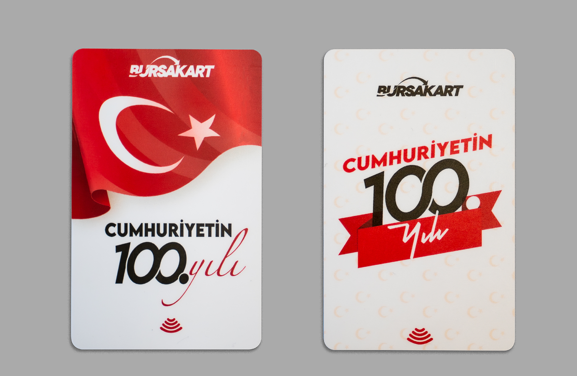 Cumhuriyet’in ilanının 100’üncü yılını Bursa’da birbirinden farklı etkinliklerle kutlayan Bursa Büyükşehir Belediyesi, 100. Yıl etkinliklerine bir yenisini daha ekledi. Bursa’da toplu taşıma araçlarında kullanılan Bursakart’ı daha önce Cumhuriyetin 100’üncü yılına özel bir tasarımla Bursalılarla buluşturan Büyükşehir Belediyesi, şimdi de ‘Türkiye Yüzyılı’ logosu ile farklı iki tasarım daha hazırladı. Toplam 200 bin adet basılan ‘Cumhuriyetin 100. Yılı’ yazılı Türk Bayrağı tasarımlı kartlardan 100 bini tükenirken, 'Türkiye Yüzyılı’ logolu yeni tasarımlardan da 50 bin adet basıldı.