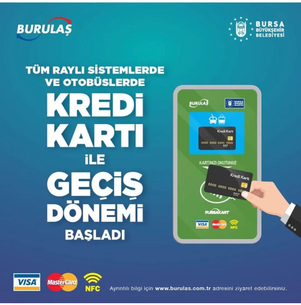Metroda bekleme sürelerinin kısaltılması, toplu taşıma araçlarının modernize edilmesi gibi yatırımlarla toplu ulaşımı sürekli teşvik eden Bursa Büyükşehir Belediyesi, şimdi de metro ve validatör bulunan otobüslerde kredi kartı ile ödeme dönemini başlattı. Temassız ödeme özelliği olan Visa ve MasterCard kredi kartları ile NFC özelliği bulunan akıllı telefonlarla yapılacak ödemelerde, banka tarafından yürürlükteki komisyon bedeli alınacak. Tam tarifenin uygulanacağı kredi kartı ödemelerinde ulaşım ücretinin her 5 TL’ye kadar olan kısmı için 1 TL, 5 TL ile 10 TL arasında olan kısmı için 2 TL ve 10 TL ile 15 TL arasındaki ulaşım ücretine karşılık da 3 TL komisyon ücreti alınacak.