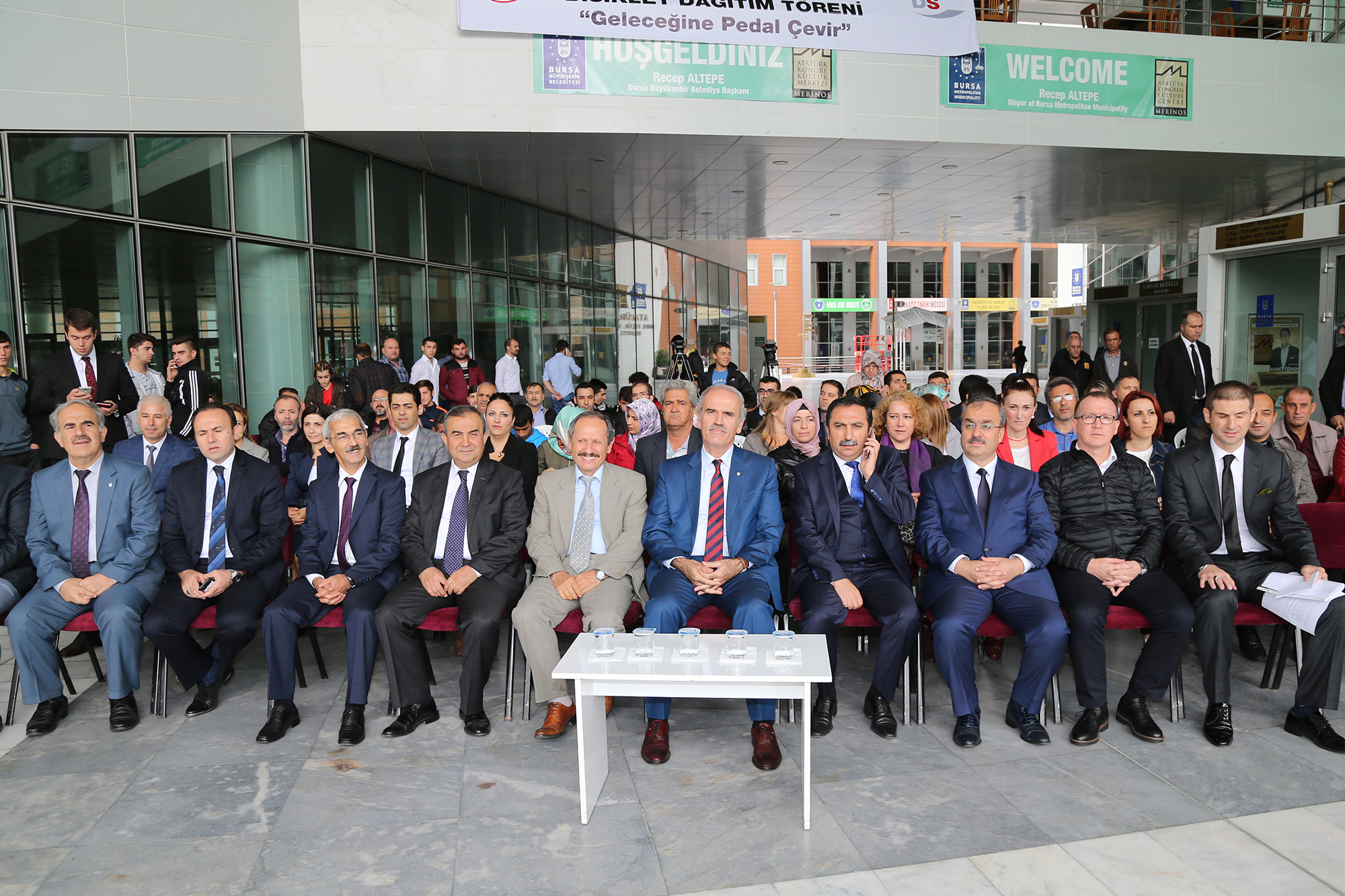 Başkan Altepe, konuşmasında, Türkiye Sağlıklı Kentler Birliği’nin kurucusu olan Bursa’nın toplumsal huzur ve güvenlik anlamında büyük bir misyon üstlendiğini kaydetti. Üreten şehir Bursa’nın sosyal sorumluluk projeleri kapsamında değerlendirilebilecek her türlü sanayi alt yapısına sahip olduğunu vurgulayan Başkan Altepe, ‘Geleceğine pedal çevir’ ve benzeri projelerle sağlıklı toplum ve sağlıklı nesil hedeflediklerini ifade etti. Denetimli Serbestlik Şube Müdürlüğü’yle ortaklaşa yapılan projeyi bu anlamda önemli bulduğunu kaydeden Başkan Altepe, “Dezavantajlı gençlerimizi toplumsal hayata sokarak, onları faydalı birer birey haline getirmeyi düşünüyoruz. Onlar sosyal etkiye uğramasınlar ve her zaman için kendilerini sağlıklı hissetsinler istiyoruz. Bunun için bisikletler dağıtılıyor. Bisikletlerimiz ve kasklarımız hayırlı uğurlu olsun” diye konuştu.