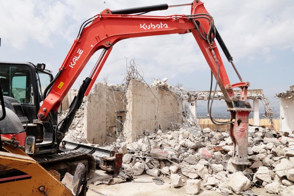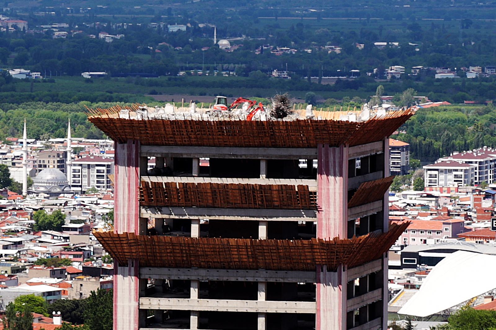 BURSA - Bursa’da 20 yıldır sürekli yıkılması gündeme gelen ancak bu konuda bir mesafe kat edilemeyen Tower Plaza’da, Büyükşehir Belediyesi tarafından başlatılan yıkım süreci devam ederken, çatıdaki iş makineleriyle iki katın yıkımını tamamlandı.