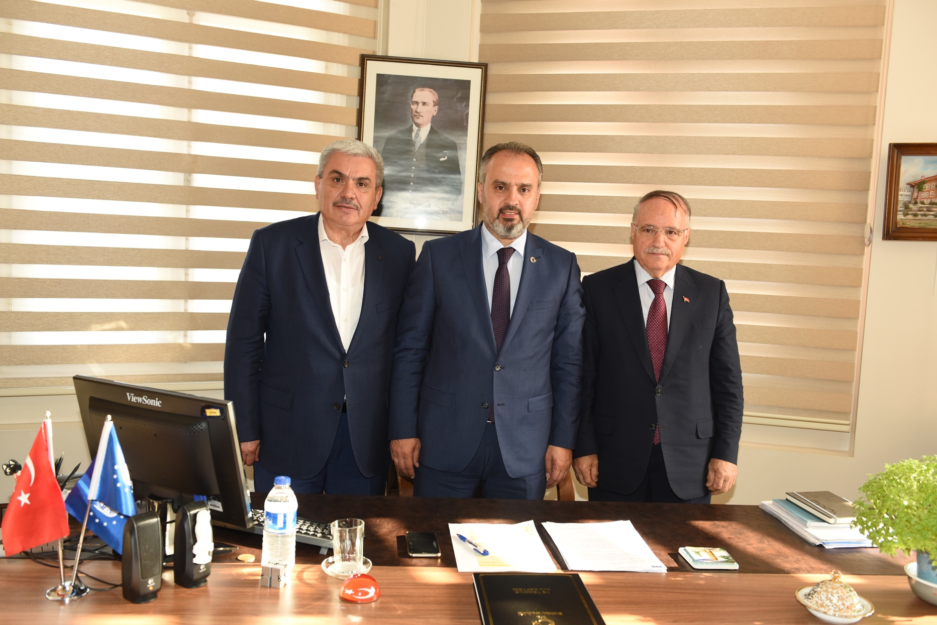 Büyükşehir Belediye Başkanı Alinur Aktaş, Tayyare Kültür Merkezi’nde Esnaf ve Sanatkarlar Odaları Birliği (BESOB) Başkanı Arif Tak ile Bursa Şoförler ve Otomobilciler Esnaf Odası Başkanı Hasan Topçu’yu ağırladı.
