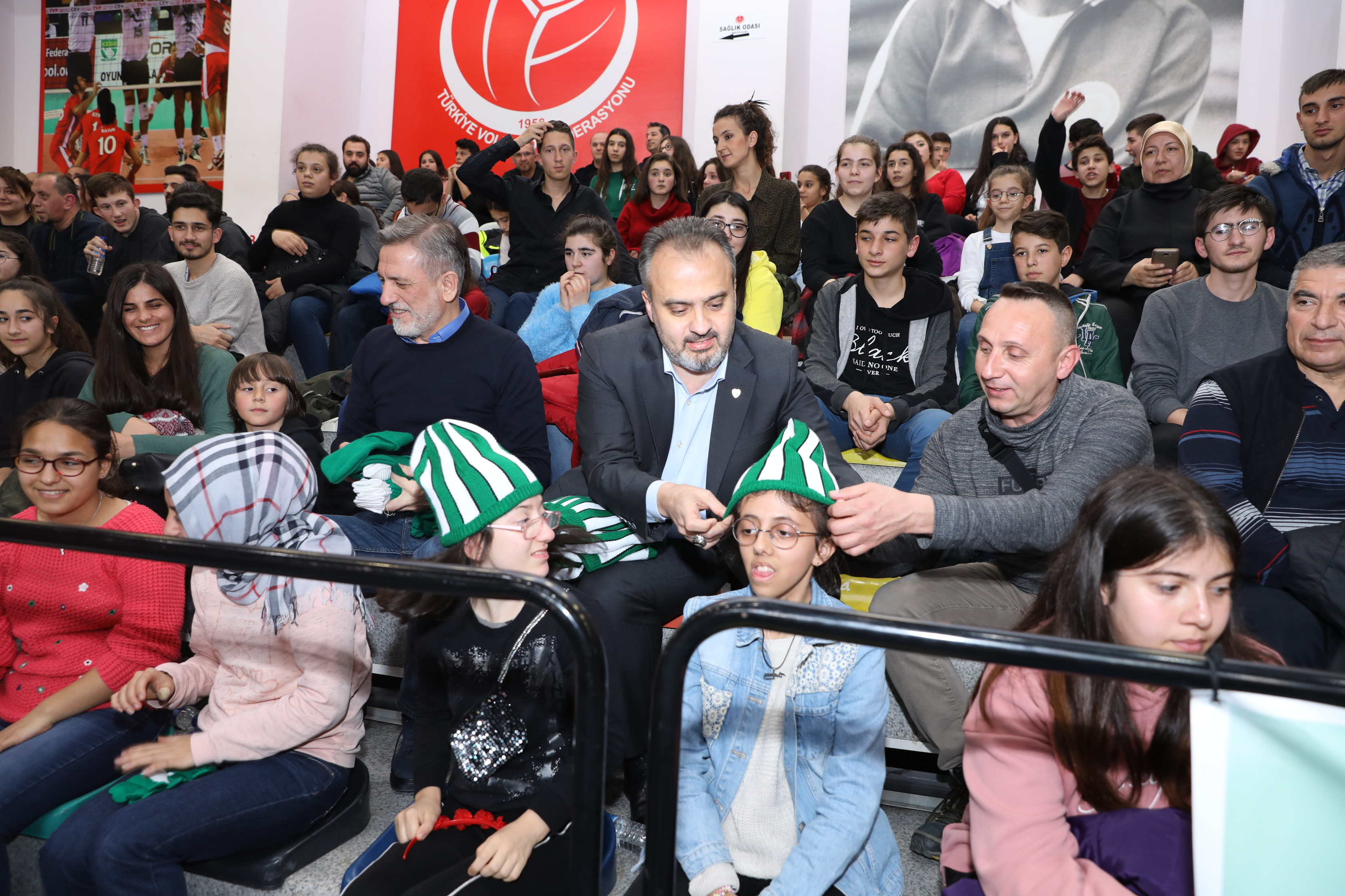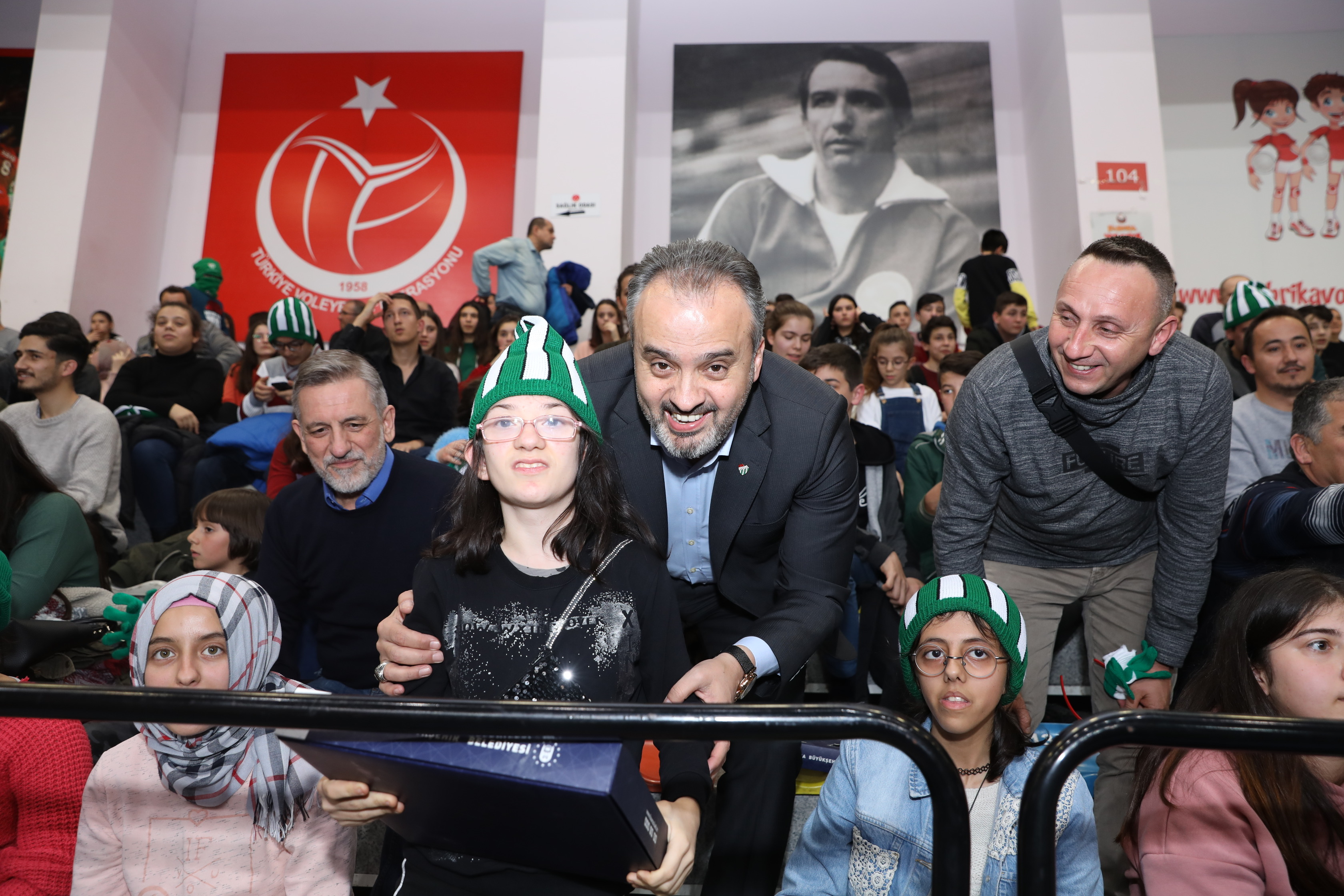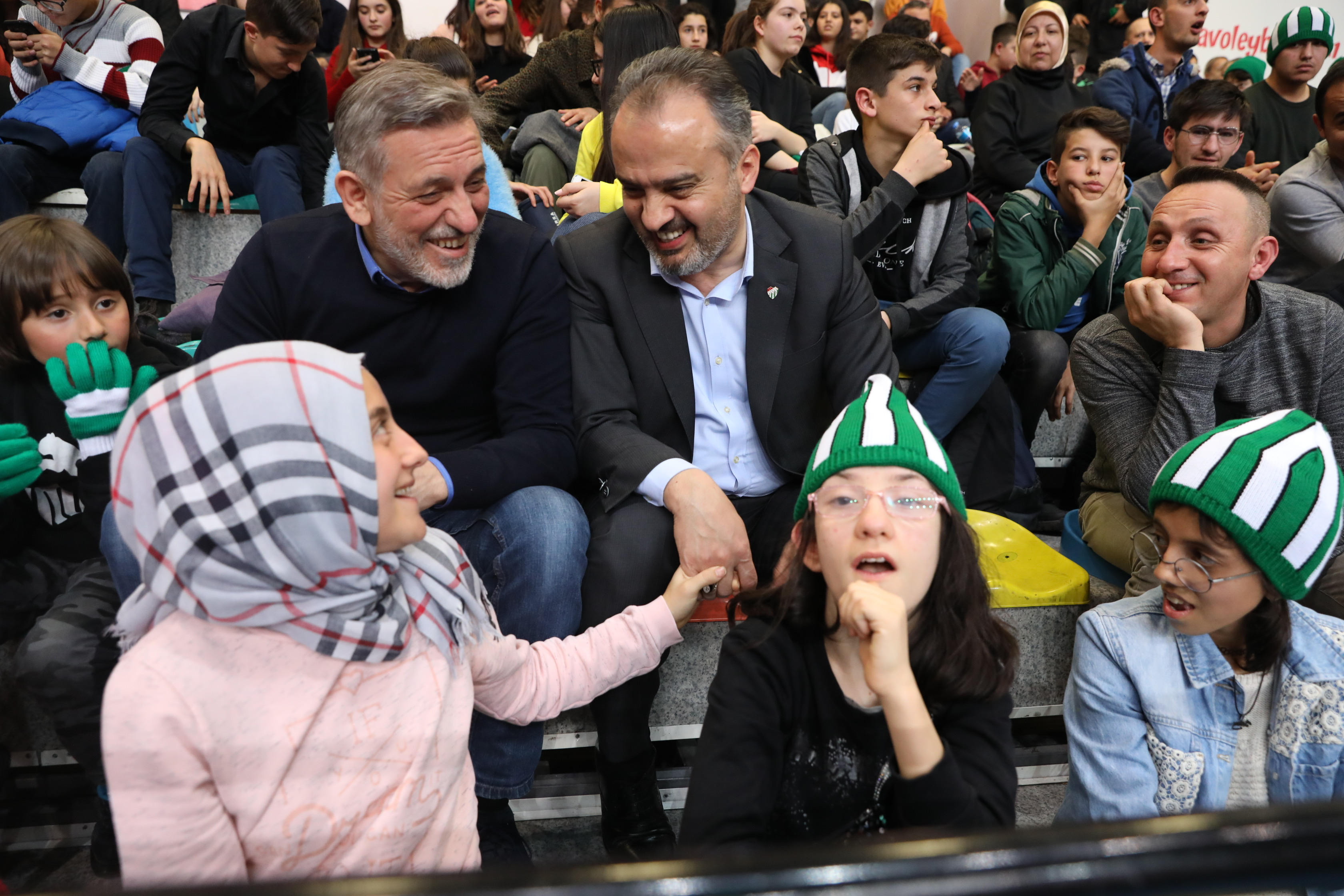 Karşılaşmayı kısa süre protokol tribününden izleyen Bursa Büyükşehir Belediye Başkanı Alinur Aktaş ve BTSO Başkanı İbrahim Burkay daha sonra seyirci tribünündeki İbn-i Sina Özel Eğitim Mesleki Eğitim Merkezi öğrencilerinin yanına geçti. Başkan Aktaş ve Burkay, bir taraftan maçı izlerken, diğer taraftan da yanlarındaki öğrencilerle sohbet etti. Tribünde keyifli anlar yaşanırken, Başkan Aktaş ve Burkay, genç sporseverlere yeşil-beyaz atkı, bere, eldiven ve satranç takımı hediye etti.