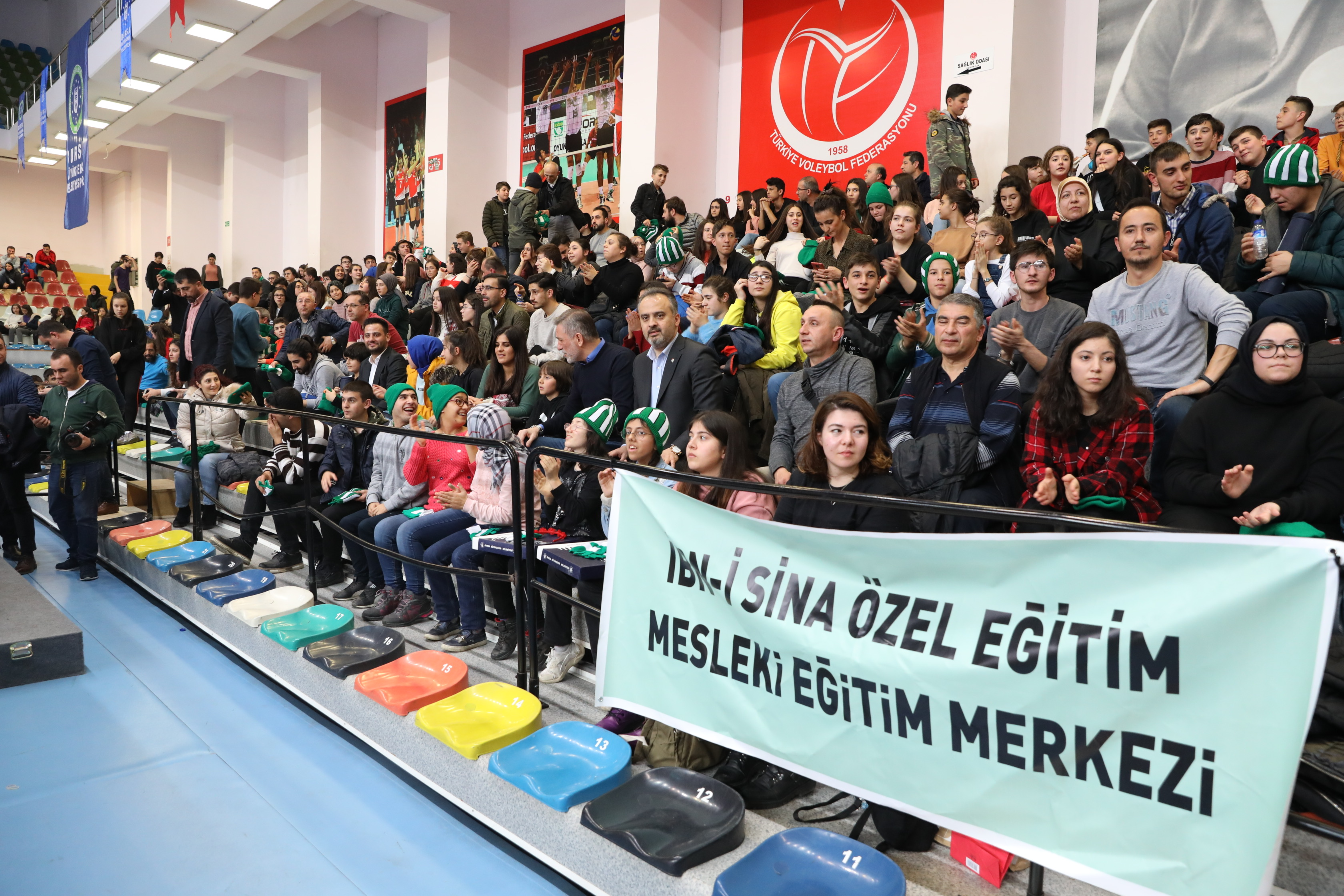 BURSA - Bursa Büyükşehir Belediye Başkanı Alinur Aktaş ile Bursa Ticaret ve Sanayi Odası Başkanı İbrahim Burkay, AXA Sigorta Efeler Ligi'nin 18'inci haftasında karşılaşan Bursa Büyükşehir Belediyespor Kulübü ve İzmir ekibi Arkas’ın maçını, İbn-i Sina Özel Eğitim Mesleki Eğitim Merkezi öğrencilerinin bulunduğu tribünden izledi.
