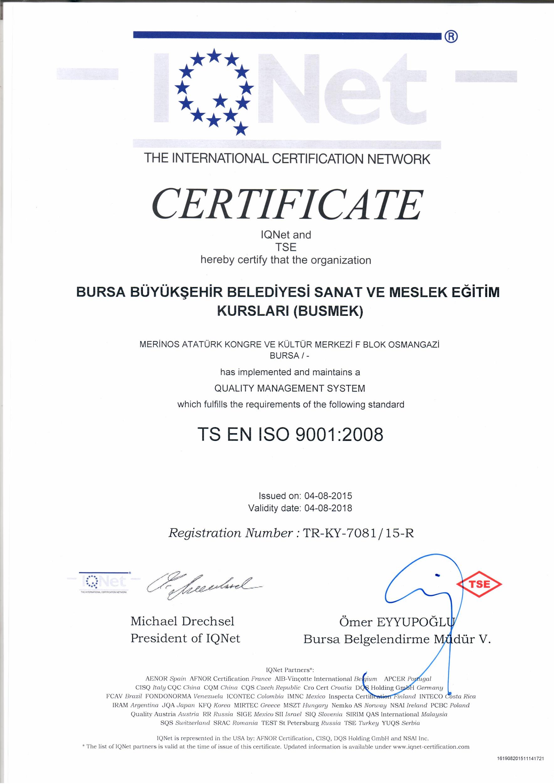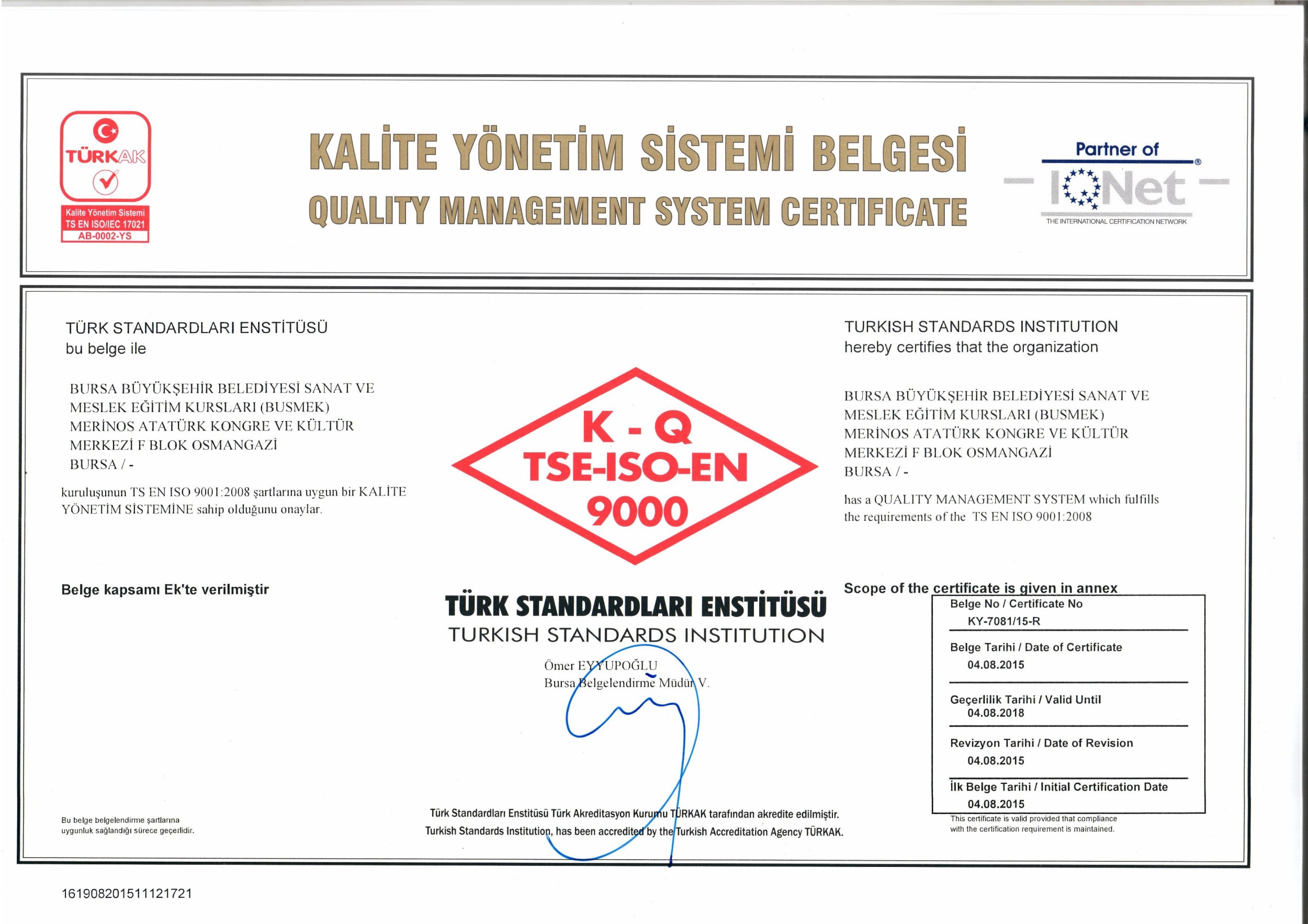 - BUSMEK’in hizmet kalitesi, Türk Standartları Enstitüsü (TSE) tarafından verilen ISO 9001:2008 TSE Kalite Yönetim Sistemi Belgesi ile tescillendi.