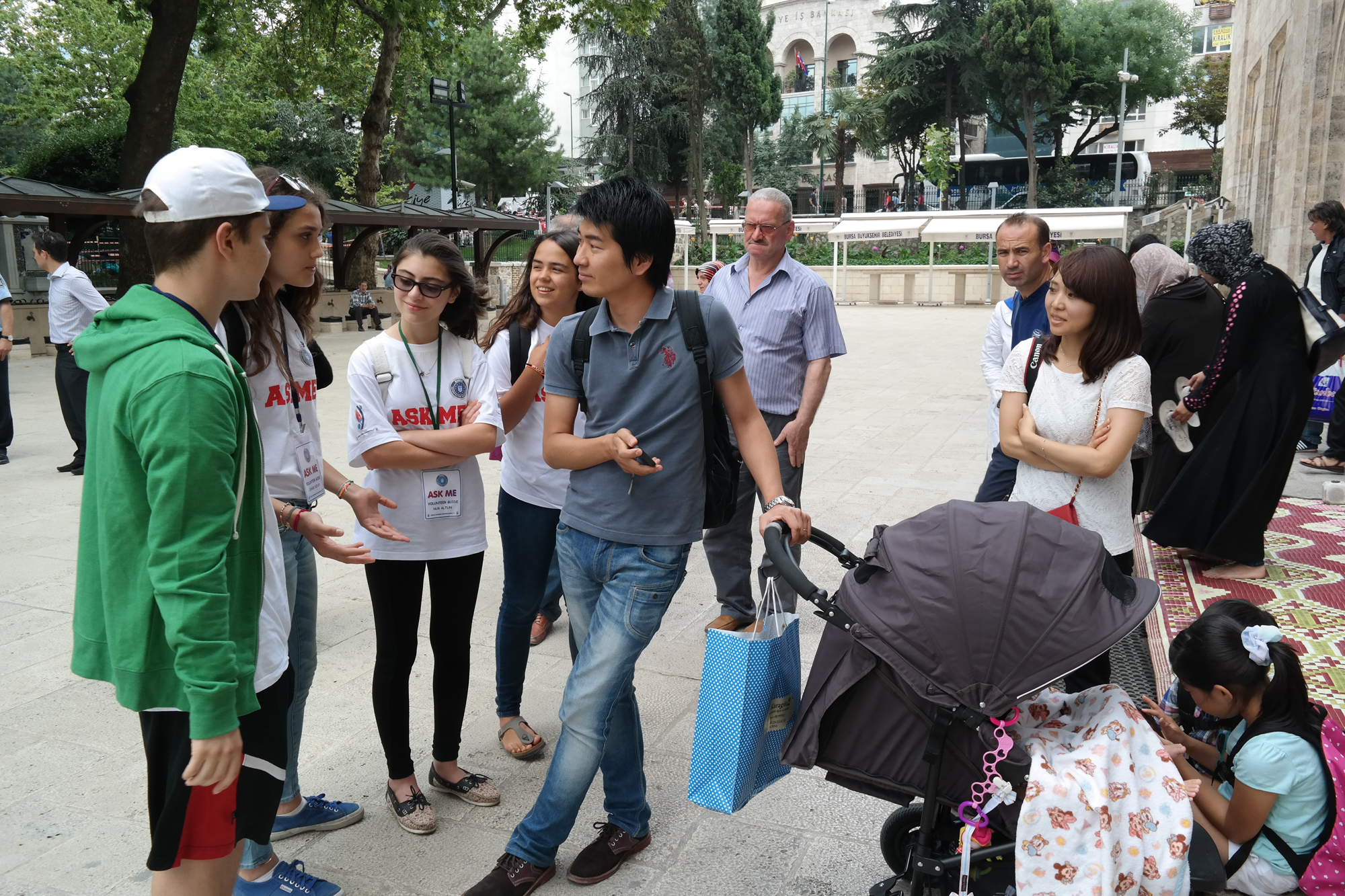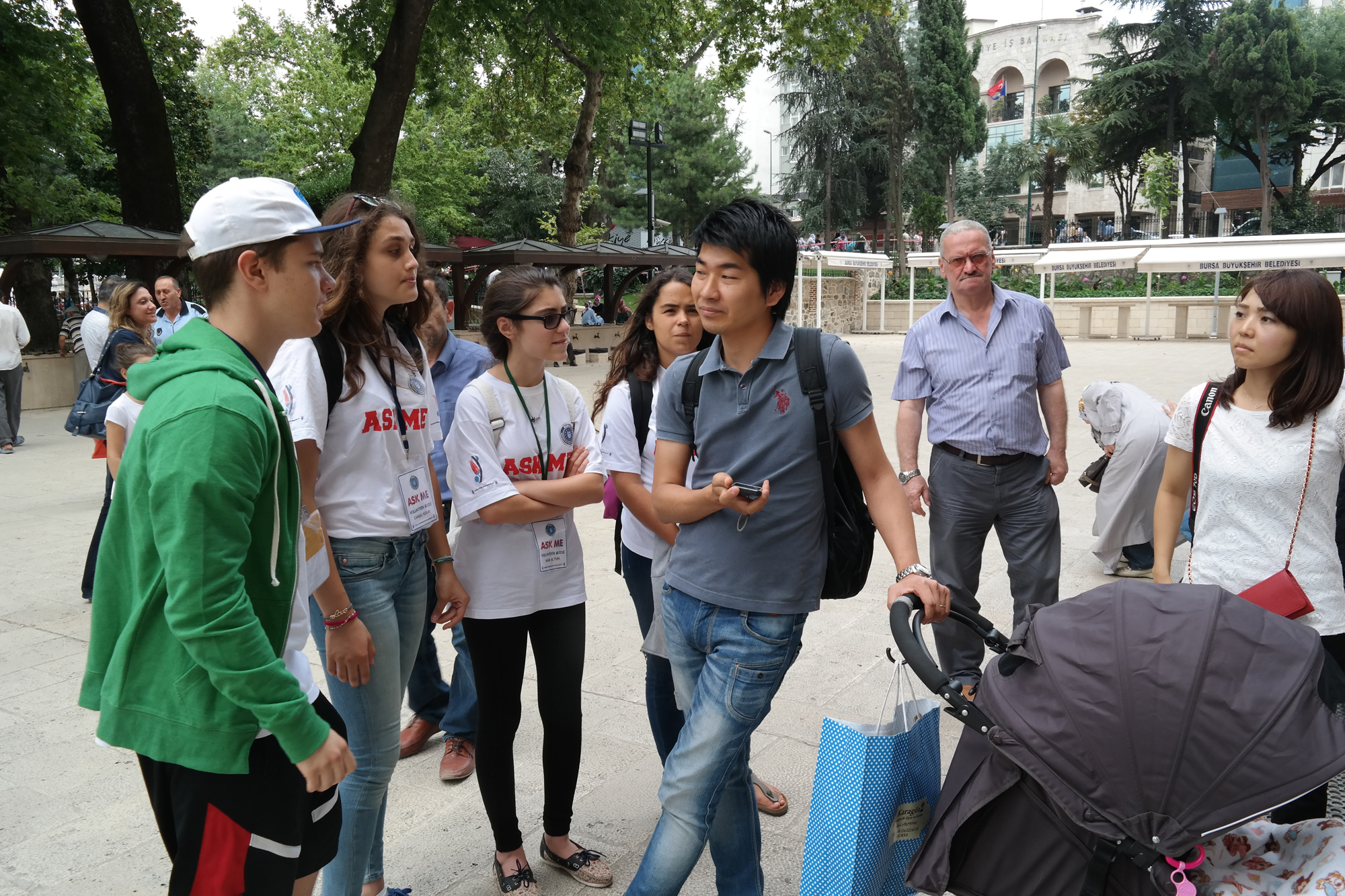 BURSA - Bursa’nın Tarihi Çarşı ve Hanlar Bölgesi, Sultan Külliyeleri ve Cumalıkızık ile UNESCO Dünya Mirası Listesi’ne girmesinin ardından kentin turizm altyapısını güçlendirmeye başlayan Büyükşehir Belediyesi, Gönüllü Kent Rehberleri Projesi’ne start verdi. Büyükşehir Belediyesi’nin özel ve devlet okullarıyla temasa geçerek belirlediği İngilizce, Fransızca ve Arapça bilen öğrenciler üzerinde ‘Ask me’ (Bana sor) yazılı tişörtleriyle, turistlere kentin tarihi ve turistik değerleri hakkında bilgi veriyor.
