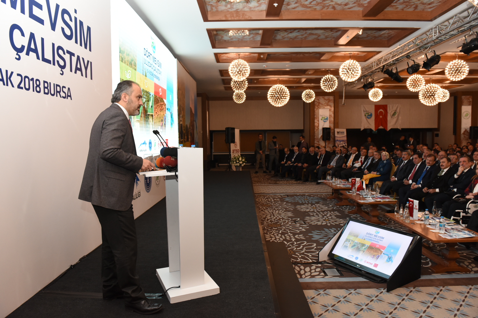 Orman ve Su İşleri Bakanlığı Doğa Koruma ve Milli Parklar Genel Müdürlüğü tarafından düzenlenen ve Bursa Ticaret ve Sanayi Odası tarafından organize edilen ‘Dört Mevsim Uludağ’ çalıştayı, Uludağ’daki Bof Otel’de başladı. Uludağ’da turizmin 12 aya yayılması, mevcut tesislerin yenilenerek kalitenin artırılması, kayak pistlerinin uluslararası standartlara kavuşturulması gibi önemli konuların ele alınacağı çalıştayın açılış törenine Başbakan Yardımcısı Hakan Çavuşoğlu ile Orman ve Su İşleri Bakanı Veysel Eroğlu da katıldı. Çalıştayın açılış konuşmaları bölümünde kürsüye çıkan Başbakan Yardımcısı Hakan Çavuşoğlu, “Bugün Uludağ’ın geleceğine yönelik bir kapı aralanıyor. Kongre otelinden, kapalı otoparklara ve pistlerin uluslararası standartlara getirilmesine kadar birçok karar aldık. Sabah kahvaltı sırasında bir otelcimiz ‘burada su ücreti çok yüksek’ dedi. Belediye Başkanımız da dedi ki; ‘biz yüzde 10 indirim yaptık’. İndirim yaptınız da konut suyuyla turizm tesisleri arasındaki su fiyatlarında 3-4 katlık fark var. Sayın Başkan bir yüzde 10 indirime daha ihtiyaç var. Gerçekten turizmciler bize bu noktada ciddi bir baskı uyguluyorlar. Siz kendi bütçenizi nazara alarak bunun kararını verin. Ya da verdiniz mi?” dedi.